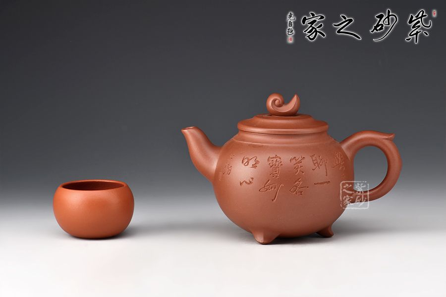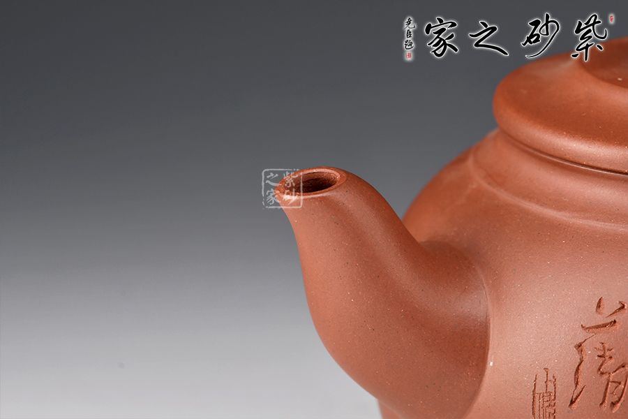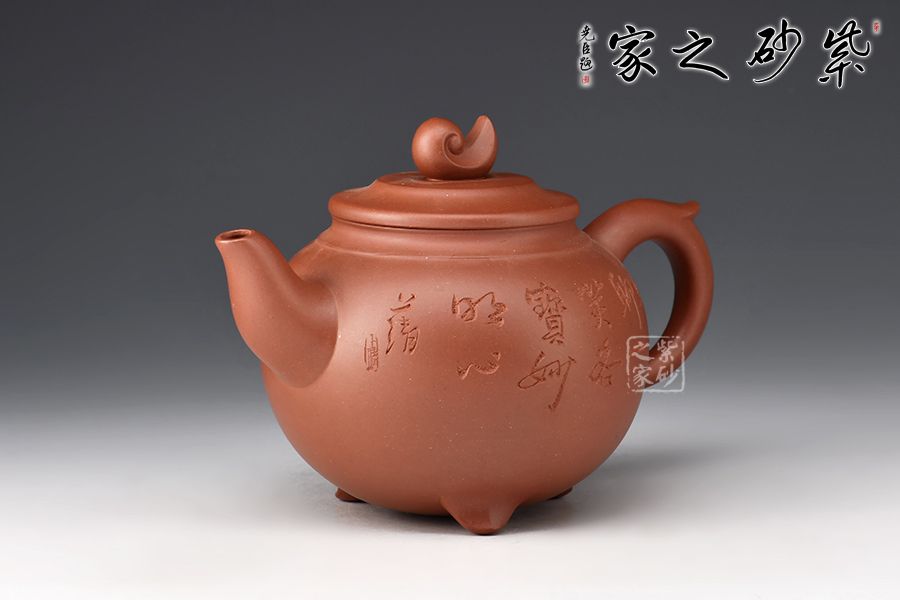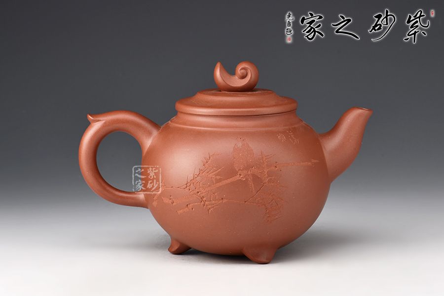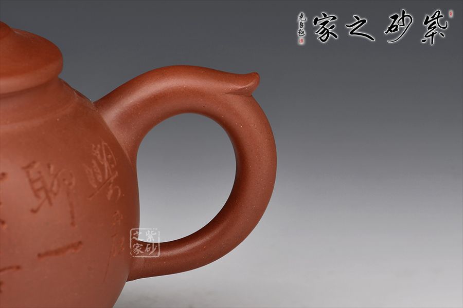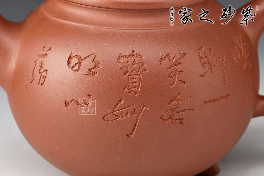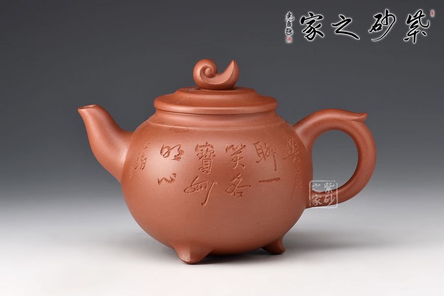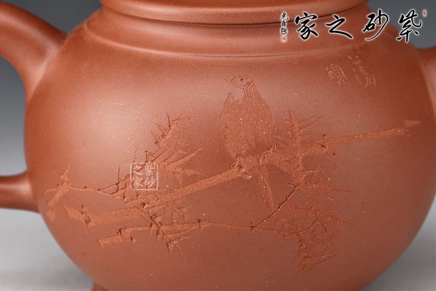 此壺器型為圓壺,壓蓋設計,氣密性良好,壺鈕形似浪花,似平靜水面上泛起的漣漪,盡顯生機。二彎嘴出水流暢,飛拿捏舒適,底部三足向外微翹,托起厚重壺體,更顯精巧。陶刻裝飾,文人氣息十足,佳器一把,推薦收藏!