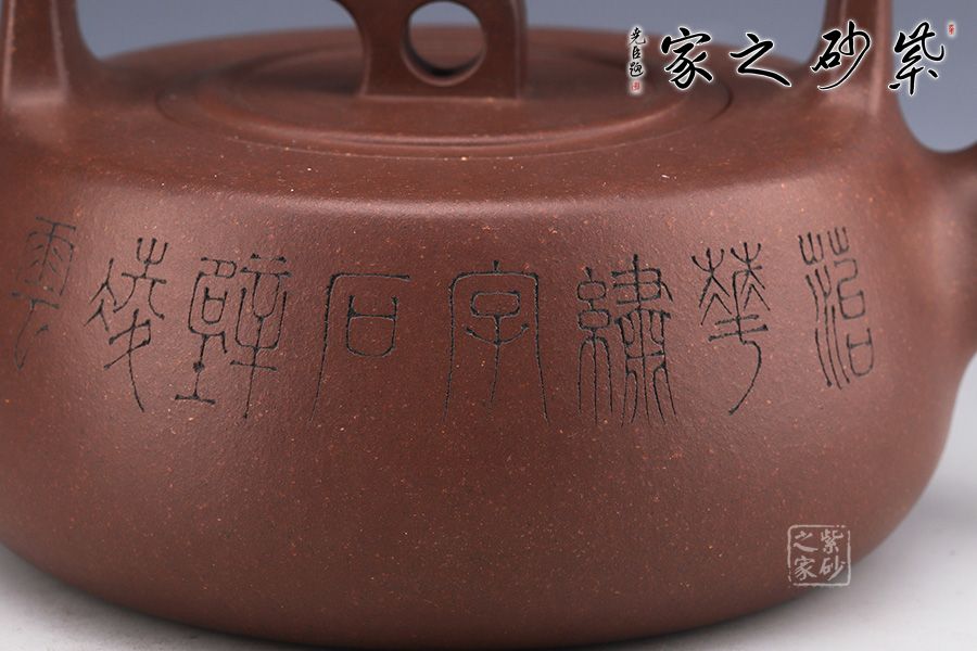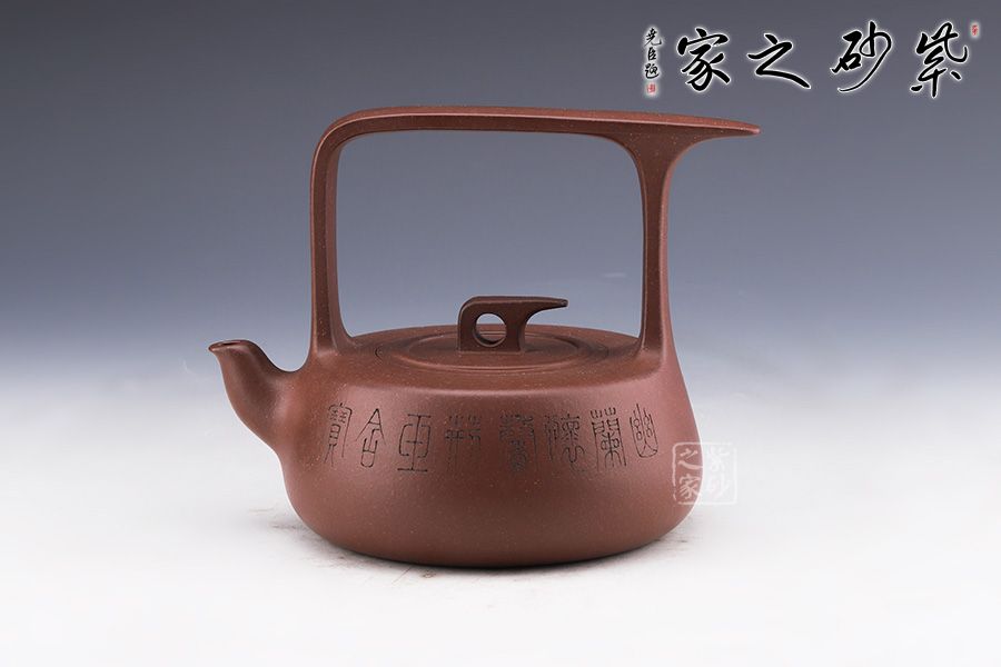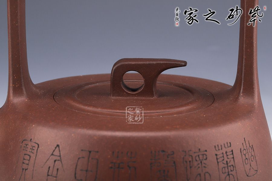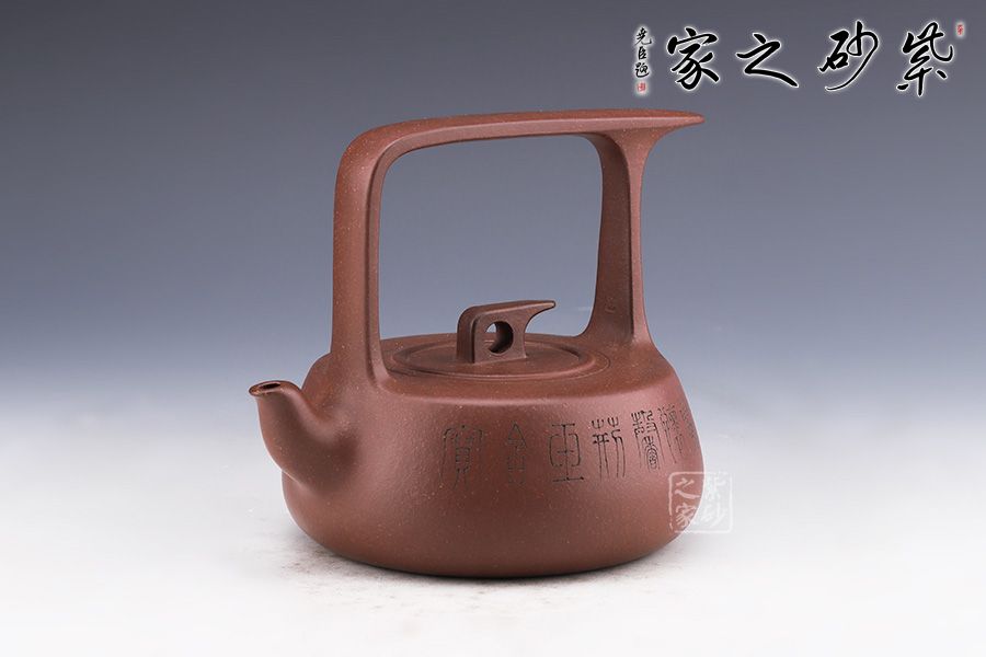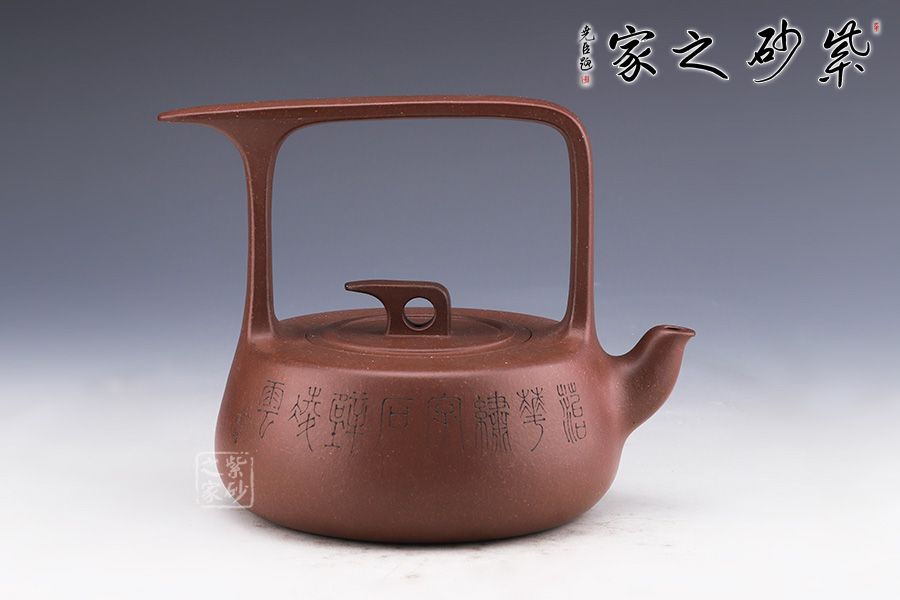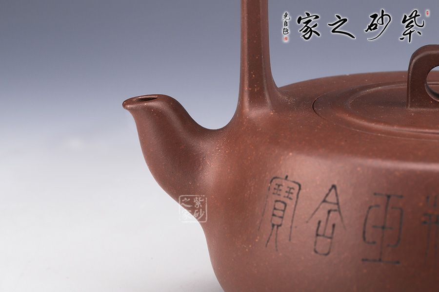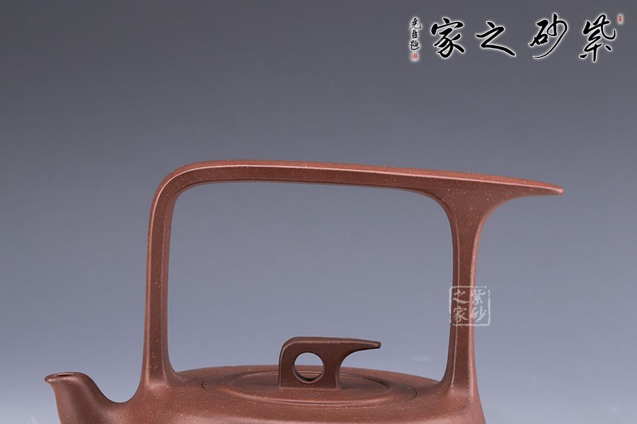 此壺摹古而作,造型古樸,壺體飽滿,平口,闊底,下腹略豐,臥足,短曲流。方形高提梁后出戟,壺蓋陷于壺身,蓋上方鈕造型同于提梁,使上下呼應(yīng),渾然一體,遠(yuǎn)看像是一只翱翔于天的飛鳥。壺身輪廓明朗,曲線張勁有力,于拙樸中見纖巧,整把壺呈流線型,猶如矗立風(fēng)中。壺身豐厚扁圓穩(wěn)住了上半部飛揚(yáng)的勁勢(shì),實(shí)乃雅俗共賞的精品!