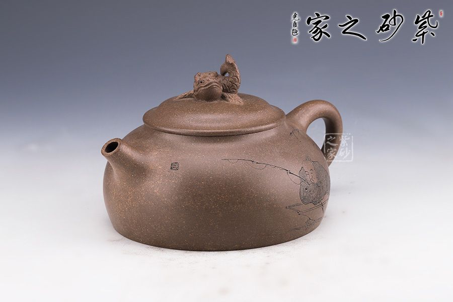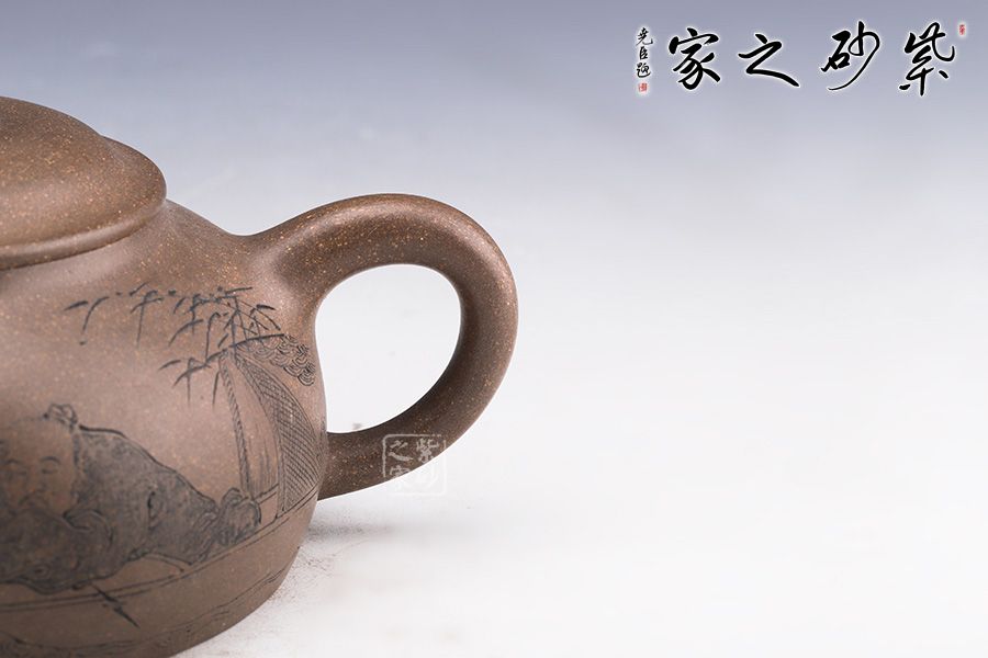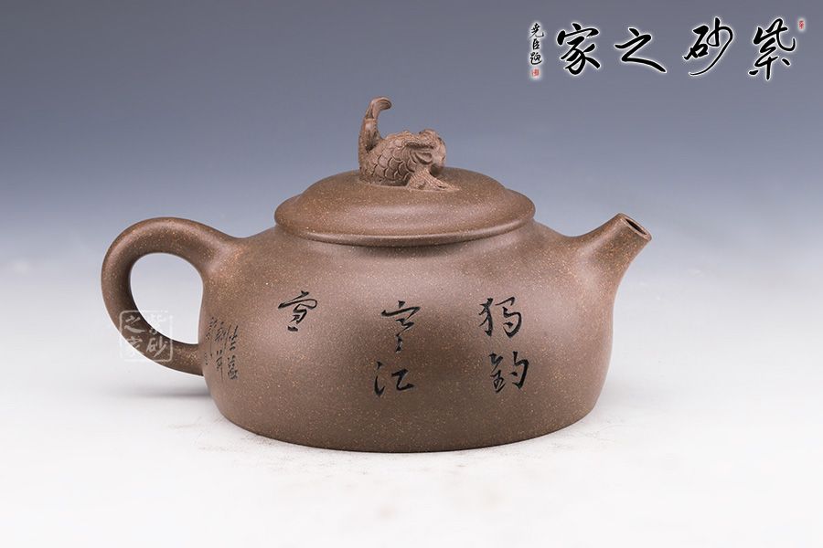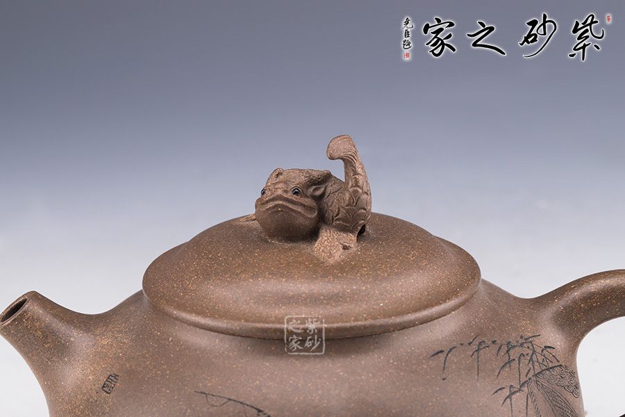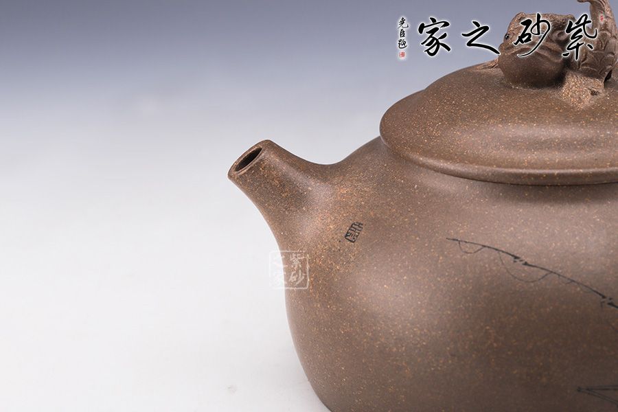 底與壺身過(guò)度平滑。身圓,由下至上逐漸豐滿(mǎn)。嵌蓋,身蓋一體,蓋面一圈圈圓線(xiàn)拾級(jí)而上,頂部螭吻做鈕。出水成股;