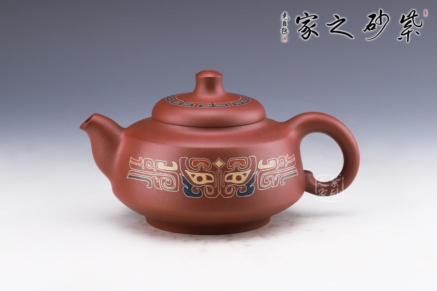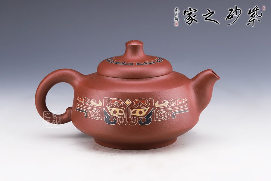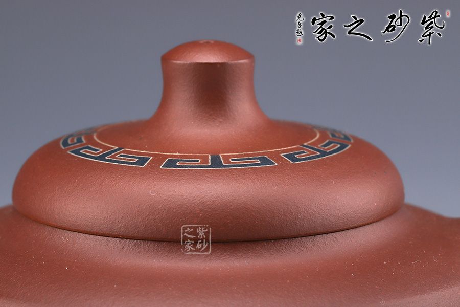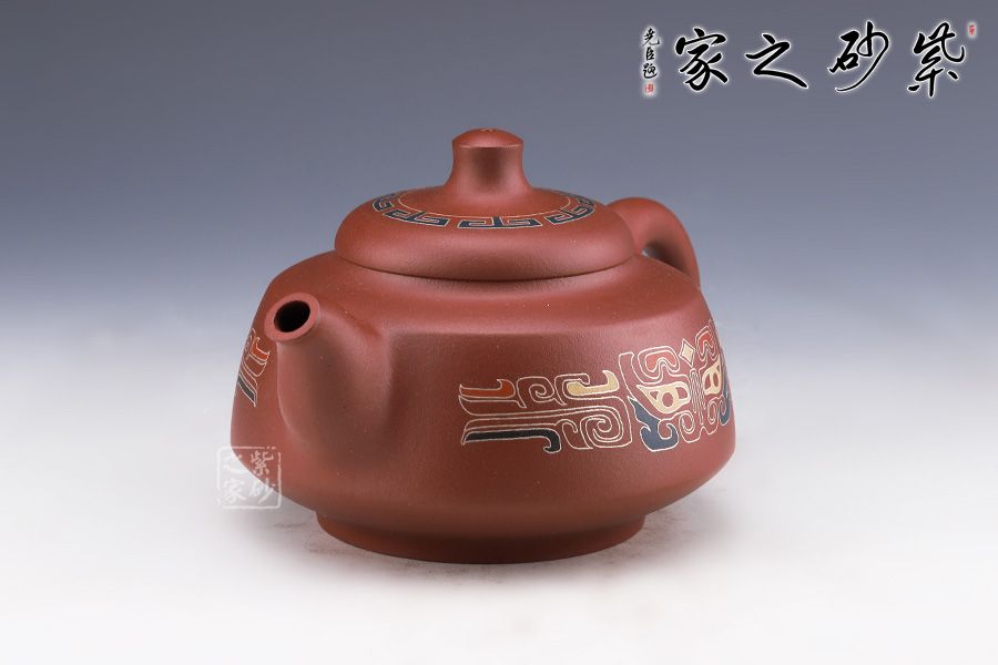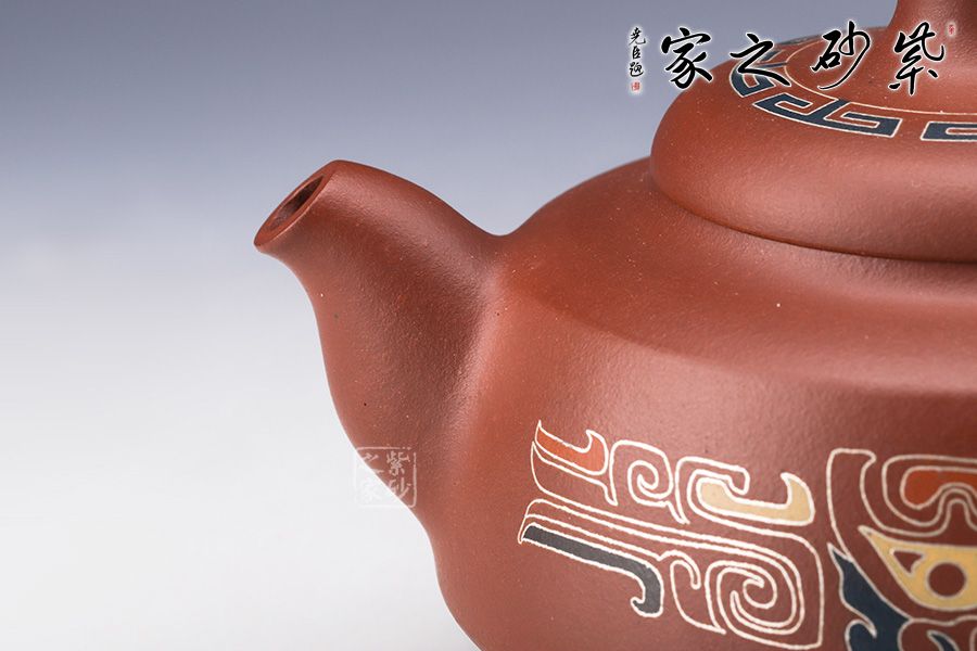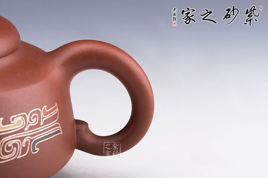 壺身扁圓,大口斜肩,直壁腹,腹以下又斜收,彎式圓流,耳式圓形耳,蓋采用虛嵌式結(jié)構(gòu),呈圓弧形凸起,橋形鈕,作品整體感強(qiáng),自然舒暢。線條干凈利落亦有柔和飽滿,非常大氣,如謙謙君子君子。壺身至壺蓋有嵌銀裝飾,構(gòu)思別致,值得收藏!