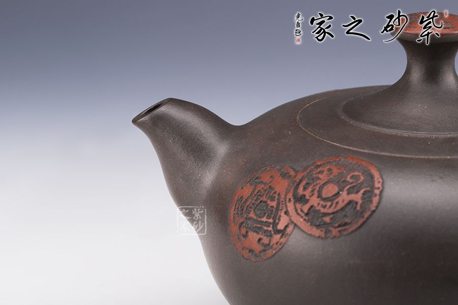 壺身以圓形為基礎,略有拉長,加入圈足,挺拔壺身。壺嘴和壺把造型工整,利落大方。截蓋設計,嚴絲合縫。蓋上壺鈕別具一格,設計巧妙。整體看此壺,氣質高雅而大方,讓人愛不釋手。