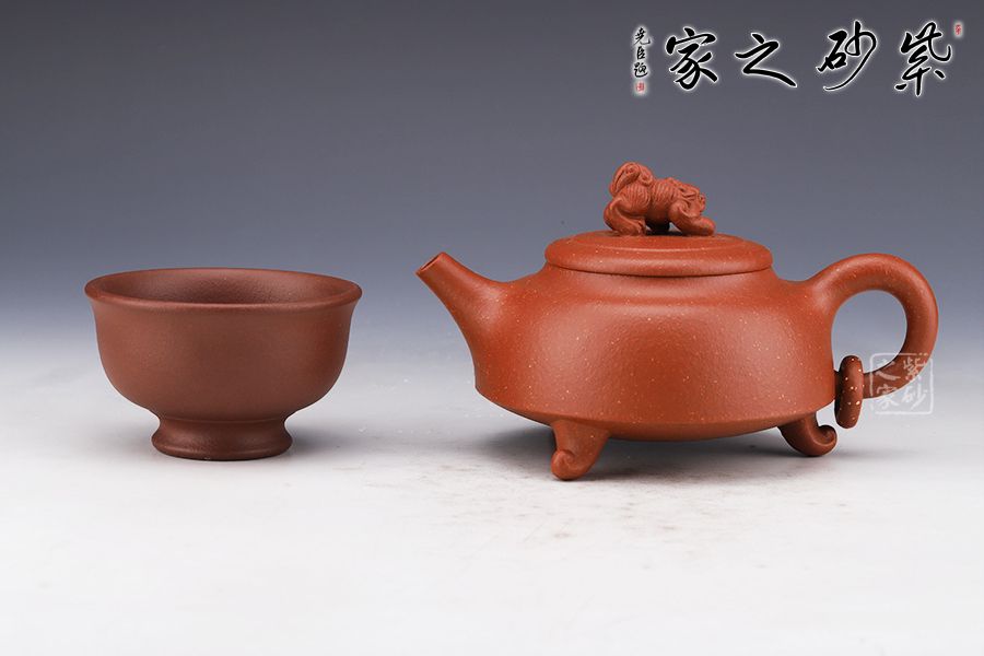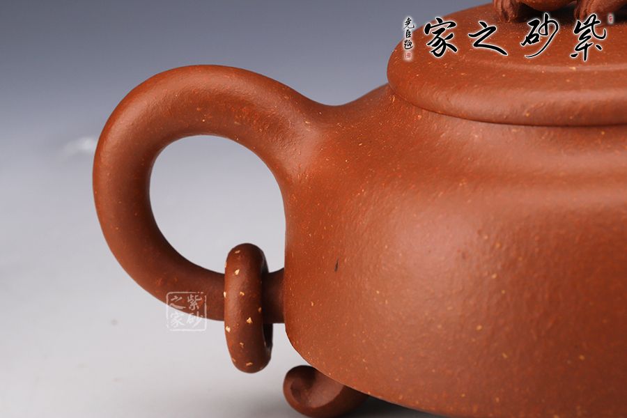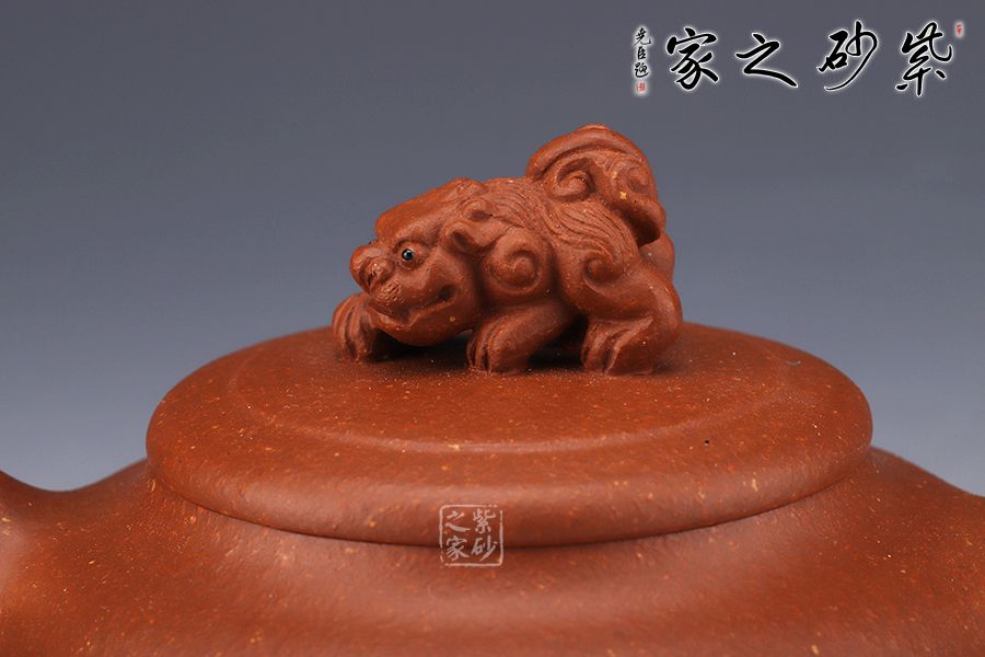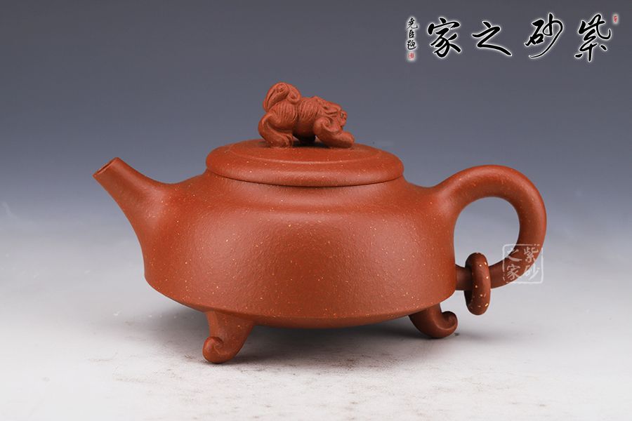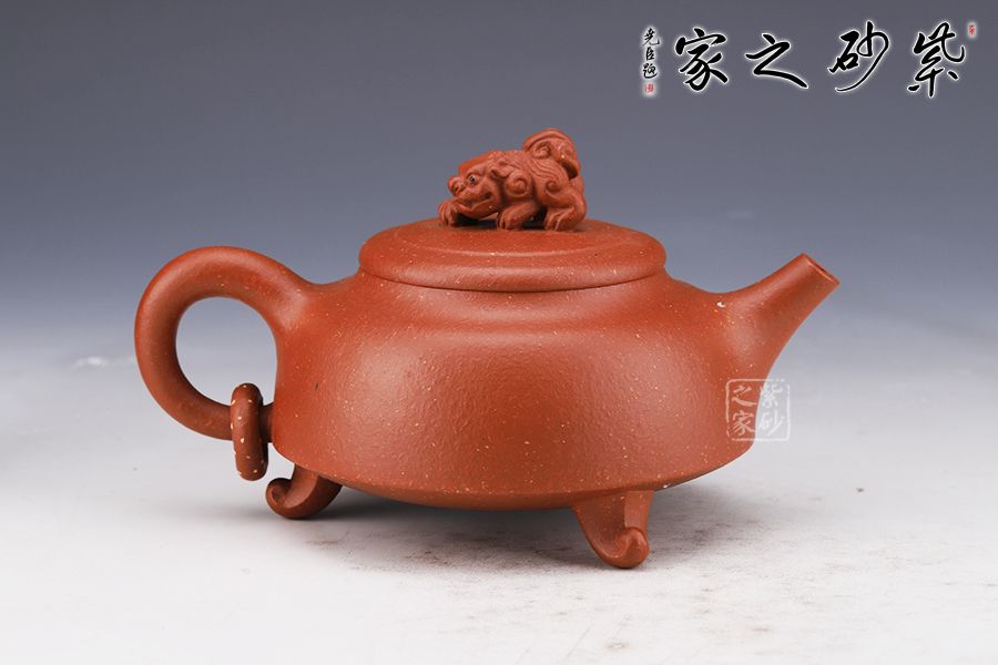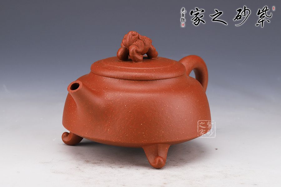 此壺簡練的造型凸顯大氣,壺身呈扁圓鼎形,三足佇立,穩(wěn)如泰山。直嘴尖銳胥出,銜接精湛,出水爽利。圓形把略微上翹,扣握有度,舒適稱手。蓋面如古錢,平和古雅,一頭瑞獸雄踞壺頂,氣勢雄渾,古拙而富有吉祥靈韻。