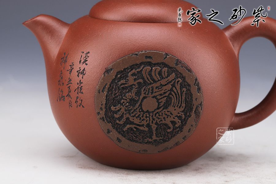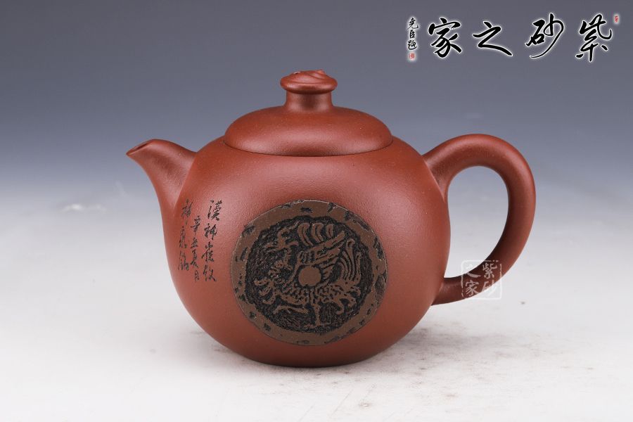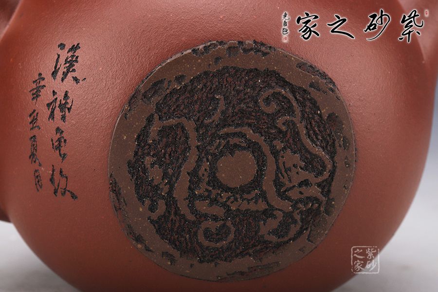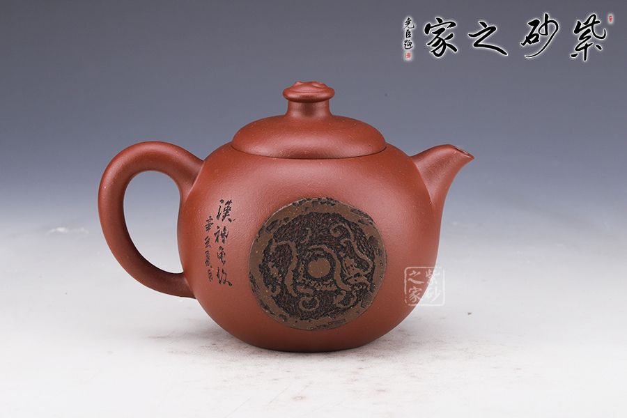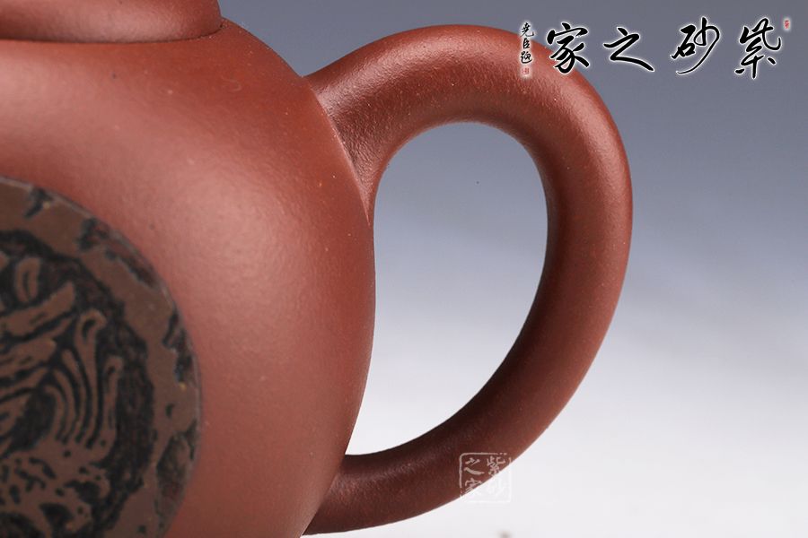 漢神瓦當(dāng)壺造型小巧,刻繪美妙,是一把上好的收藏作品。壺身造型有西施的余味,也有創(chuàng)新之處。球型的壺身依舊圓潤精巧,壺鈕同樣小巧精妙。小巧的壺嘴略有不同,明接于壺身,形狀上更加圓潤。把亦有不同,明接的環(huán)形,顯得更有工藝美感。通身刻繪的山水畫深沉悠長,似有無限的意味。