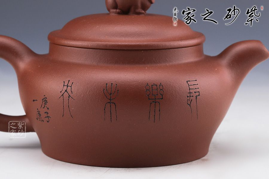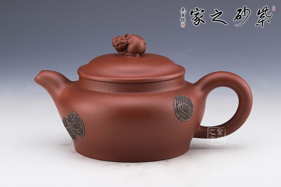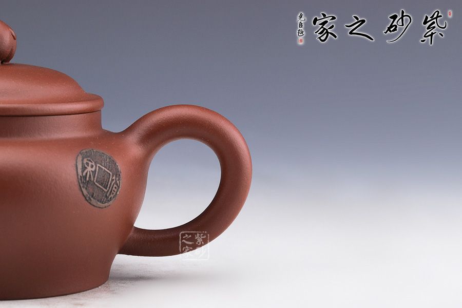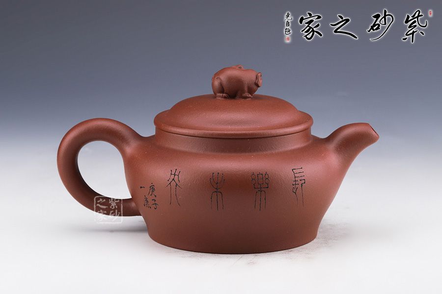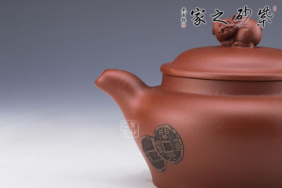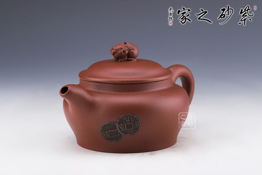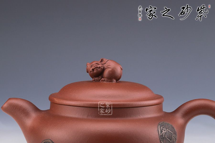 底與壺身過度平滑。身圓,由下至上逐漸豐滿。身蓋一體,蓋面一圈圈圓線拾級而上,頂部福豬做鈕。出水成股;