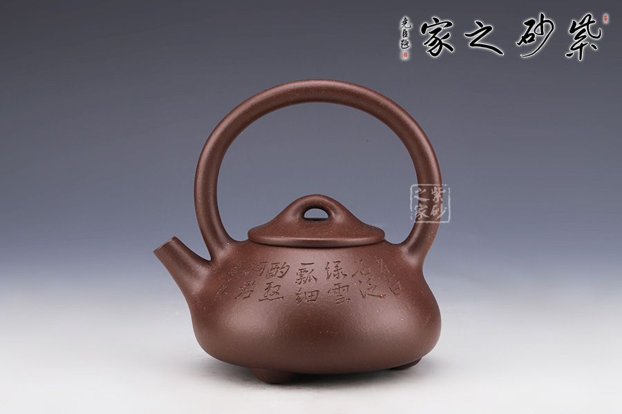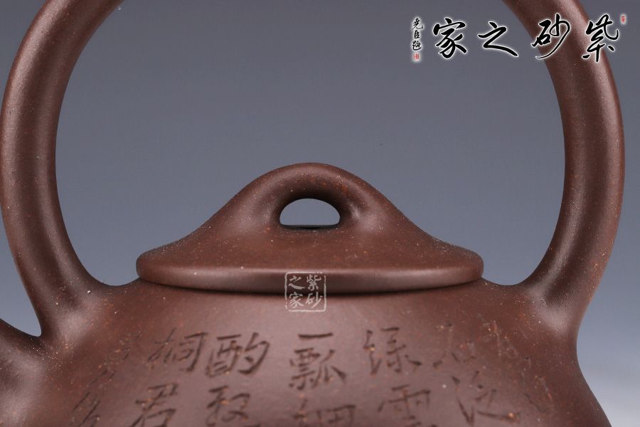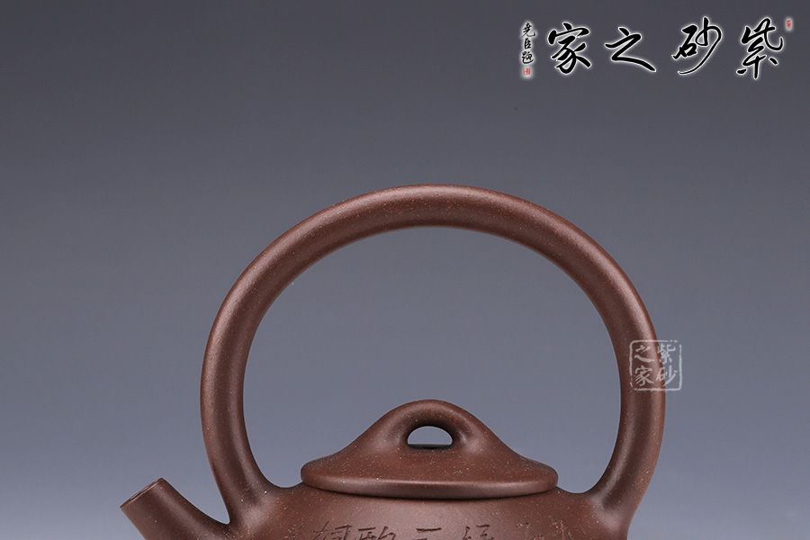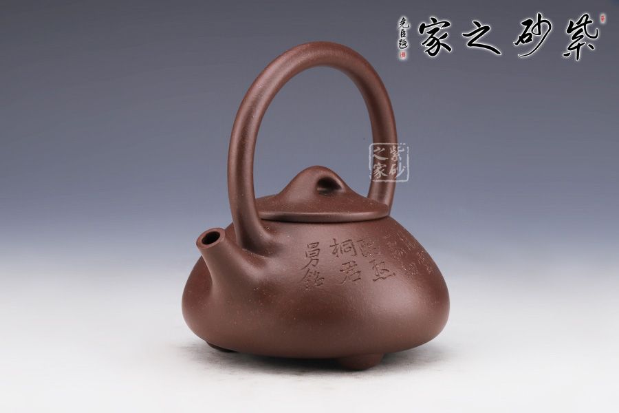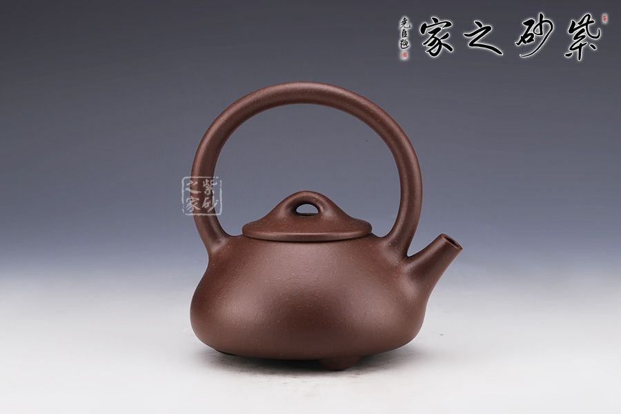 壺身是典型的石瓢狀,上窄下寬,壺腹飽滿有致,口蓋吻合嚴密,蓋上橋形鈕平緩過渡,直嘴挺拔向上;提梁把自壺肩一側拱起,連于壺身,與壺蓋略呈圓形,線條優(yōu)美,三只墩足憨厚可愛。此器選用紫泥精制而成,容量180cc,適合個人品茗,值得推薦!