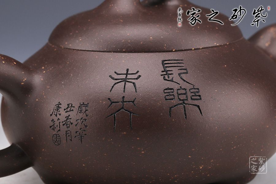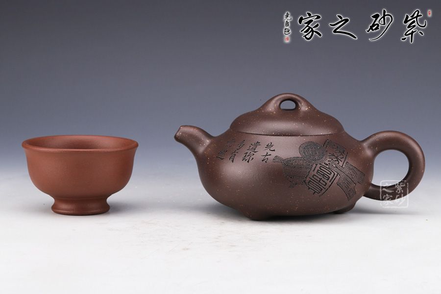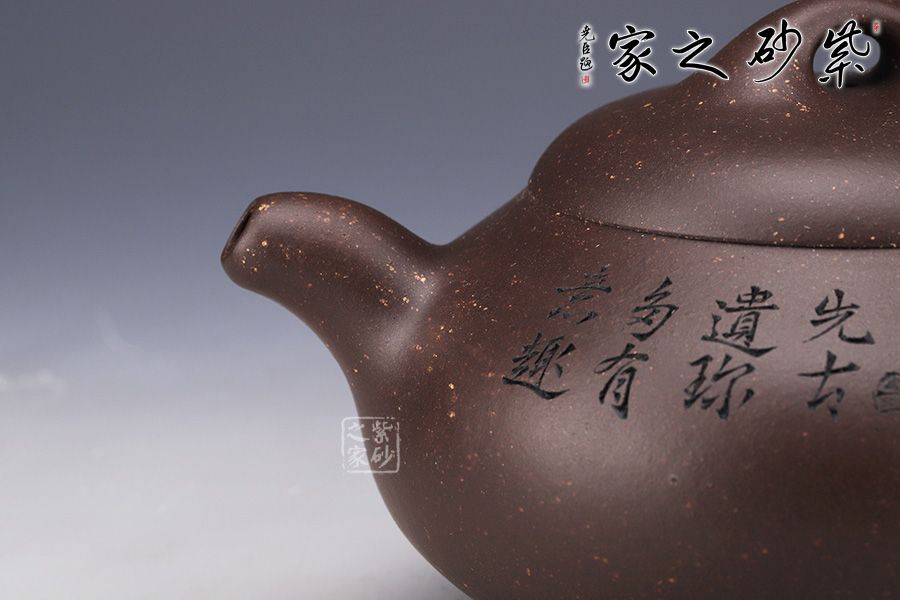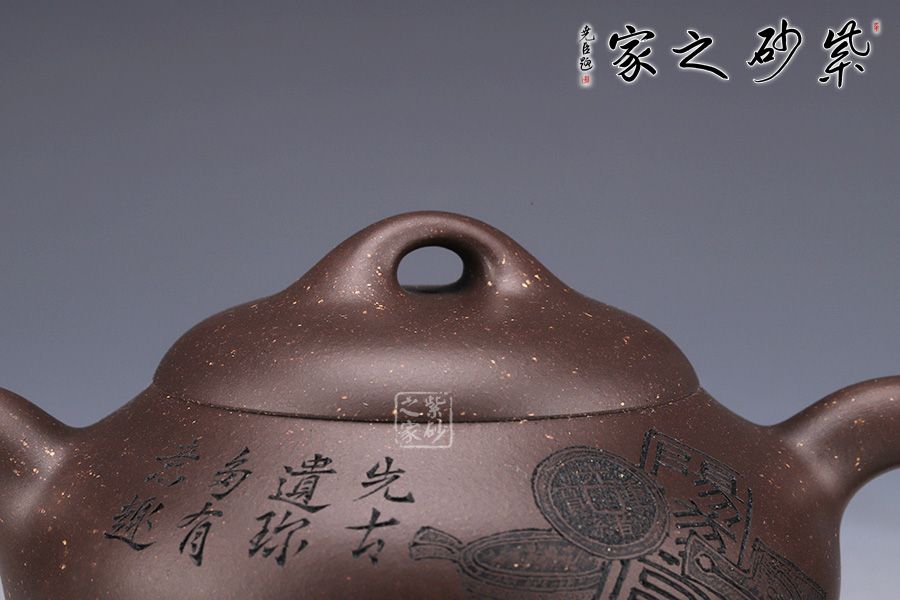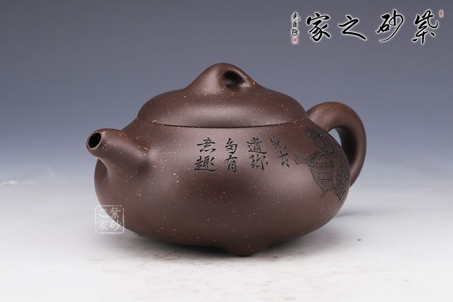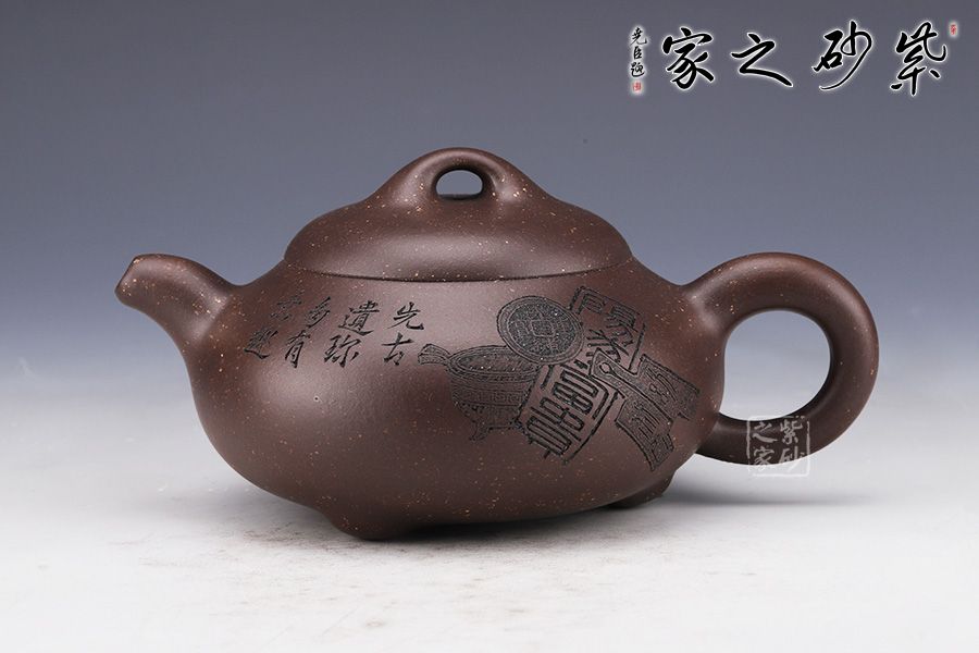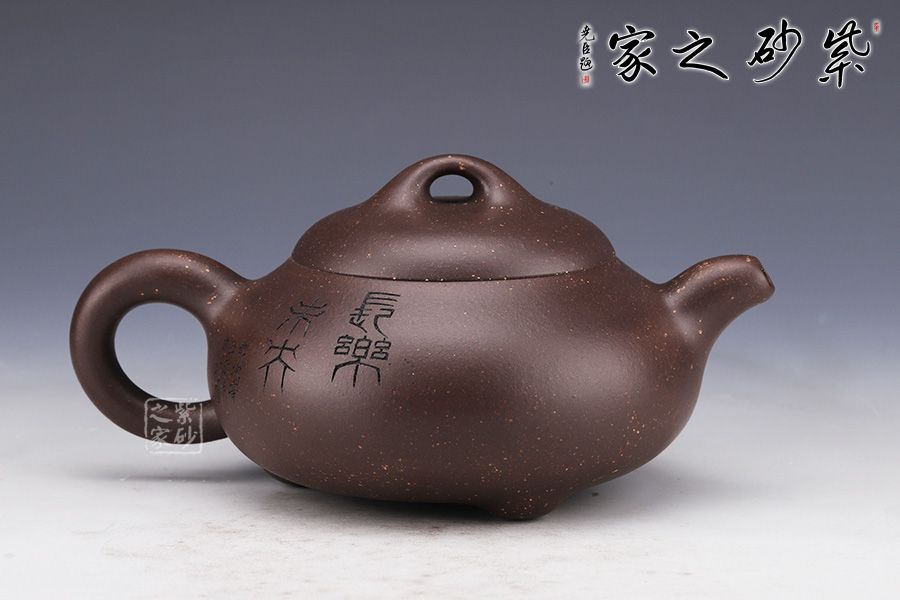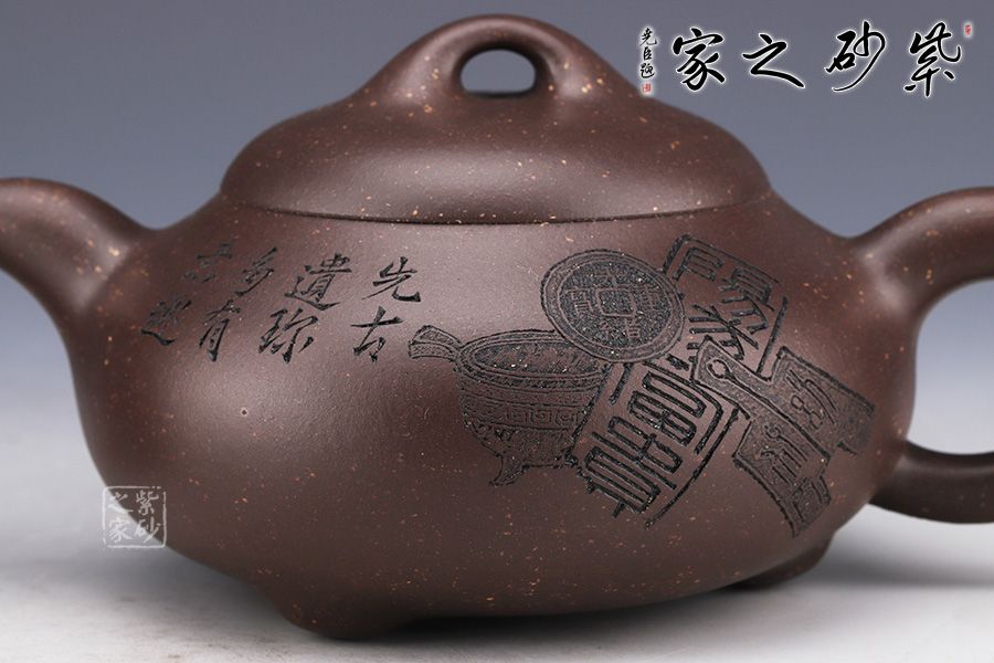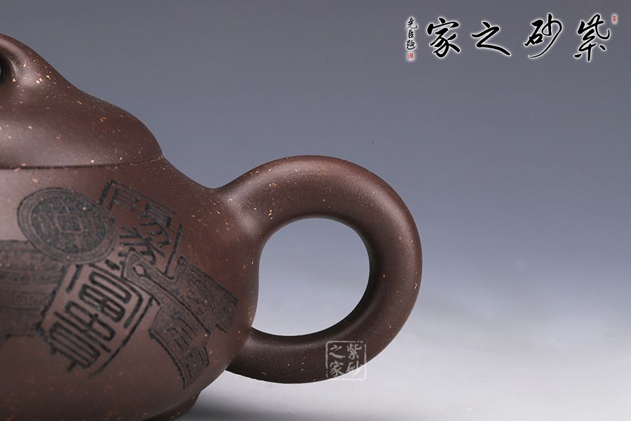 整壺采用了黑墩頭制作而成,壺容量為330cc。 由經(jīng)典石瓢壺演變而來,壺身的金字塔造型仍然十分明顯,別有一番風(fēng)味。壺身落地穩(wěn)重,格外踏實(shí);粗嘴、粗把、粗鈕,道洪風(fēng)滿滿。壺身刻繪裝飾,刀法利落,情趣韻味優(yōu)雅,經(jīng)典壺型,舒展挺拔,百年人氣紫砂壺型。