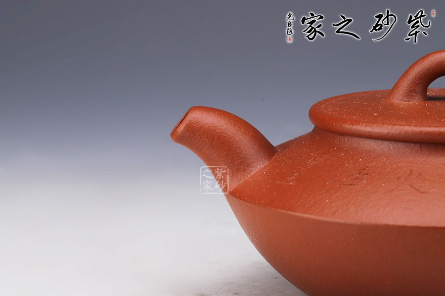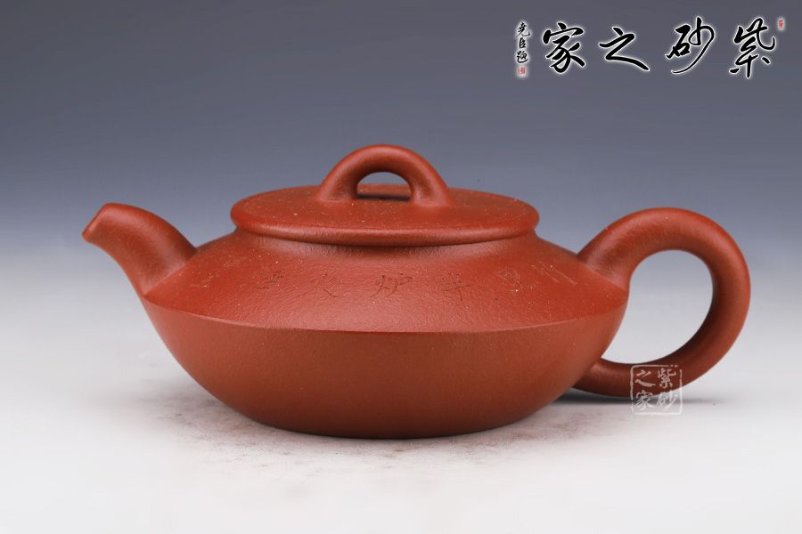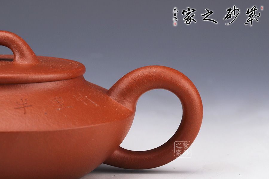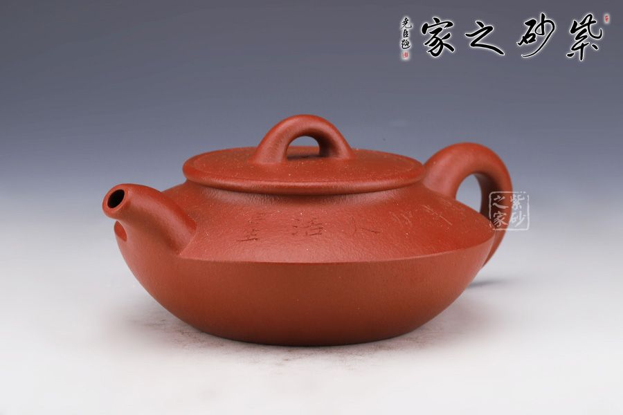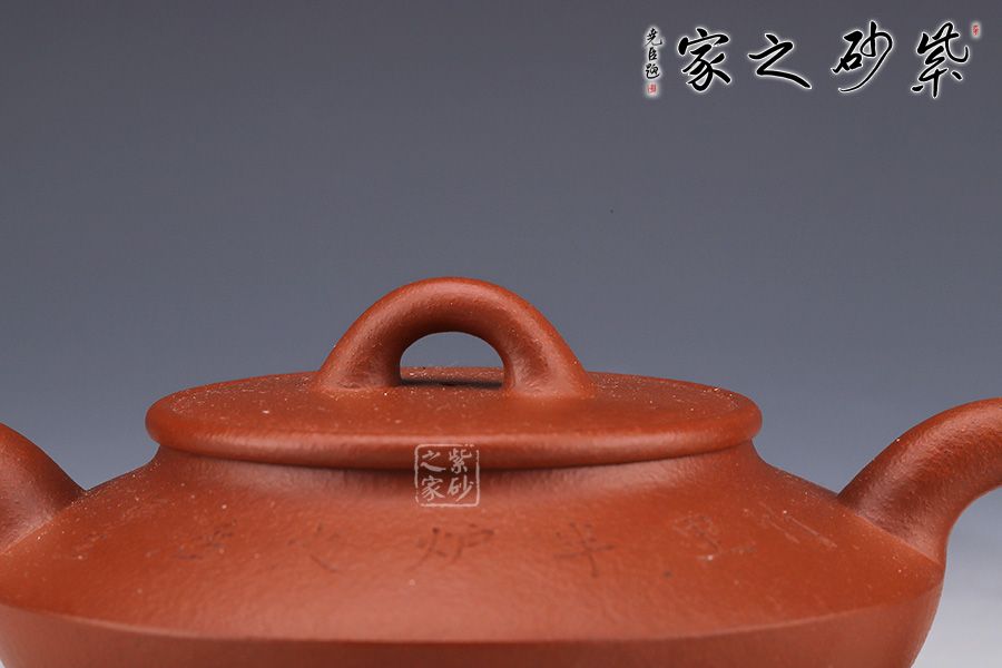 這是一個(gè)經(jīng)典的合盤(pán)壺,由原礦朱泥制成,泥色紅潤(rùn),精致典雅。壺身由上、下盤(pán)兩部分組成,上盤(pán)像個(gè)反扣著的碗,下盤(pán)像個(gè)小碟子。壺腰線鼓出,向上、下呈 反弧收斂。壺腹上部刻繪的文字,使得此壺古樸端莊,值得擁有!
