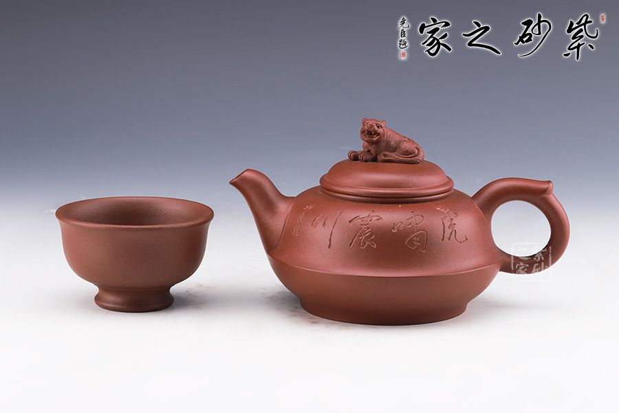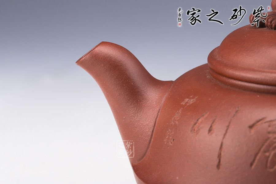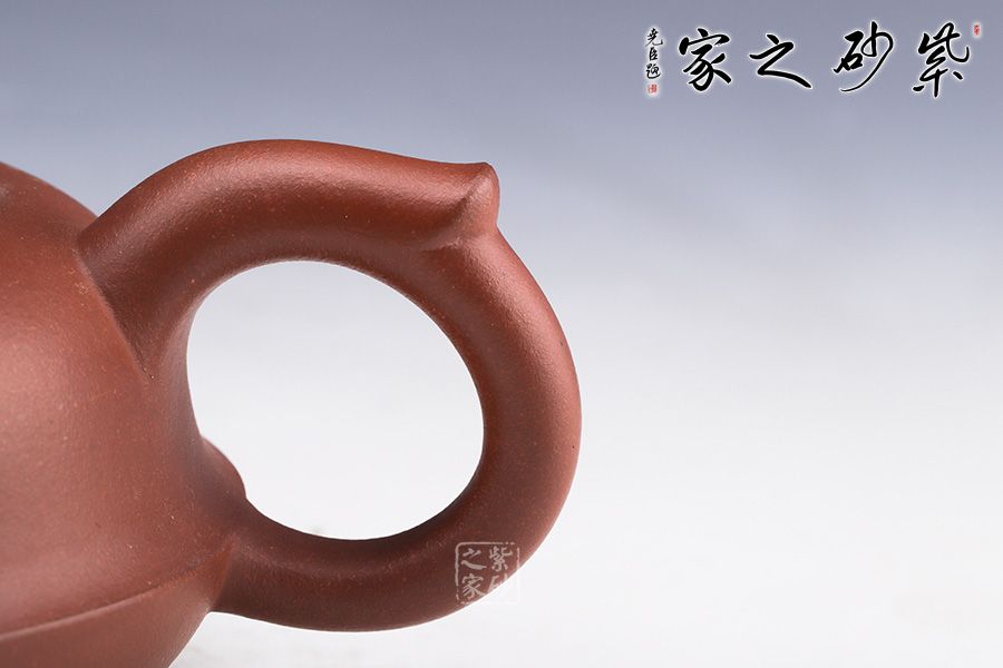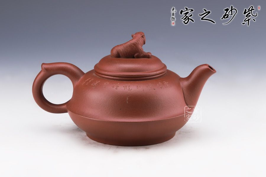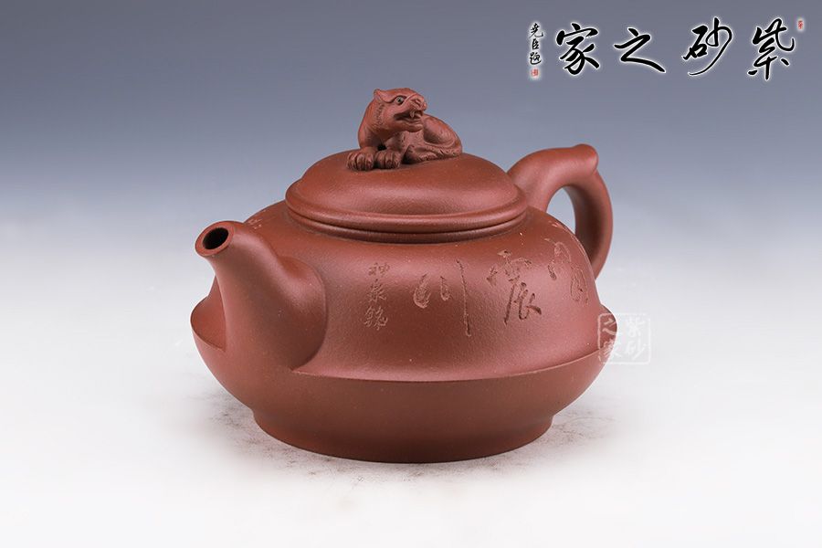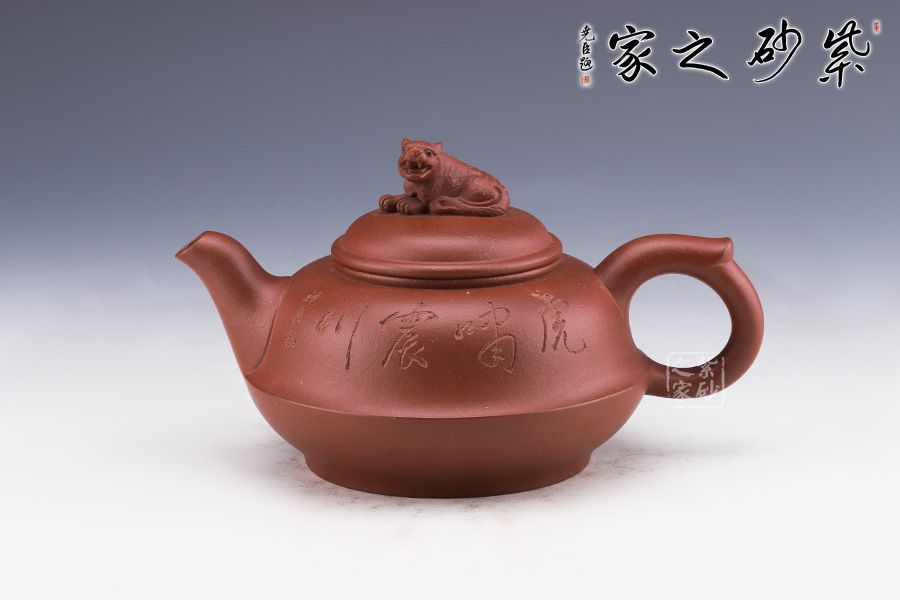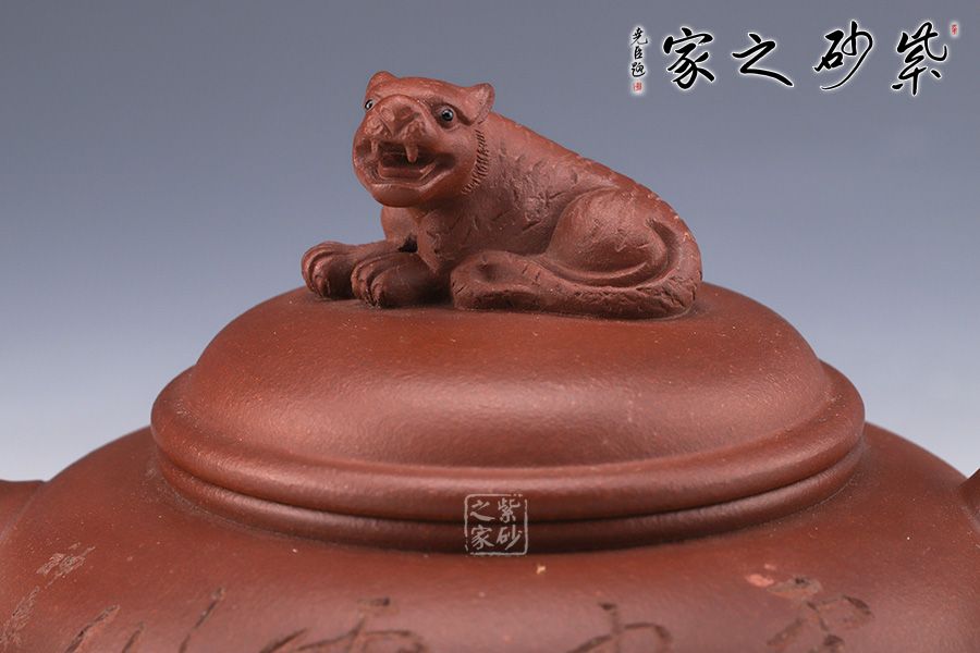 作品整體渾厚飽滿,飛把趁勢,適于執(zhí)握,壺嘴微彎,與把對稱協(xié)調(diào),壺身似上下兩半對接而成,圈足穩(wěn)重而厚實(shí),以虎為鈕切合主題,整器充滿一股力量感,并具神韻氣質(zhì),與作品的主題相融合。 整器風(fēng)格氣質(zhì)不俗,造型流暢靈活,其生動活潑的形象亦使得作品變成有生命的雕塑作品,富有活力與生氣。