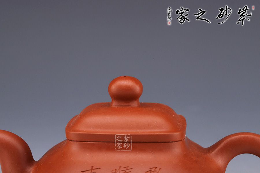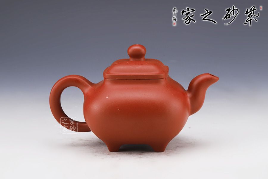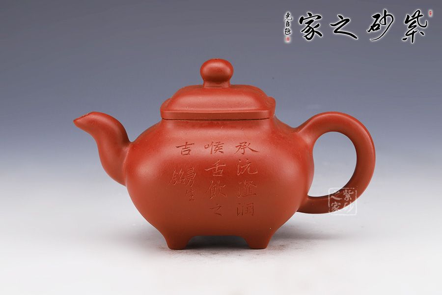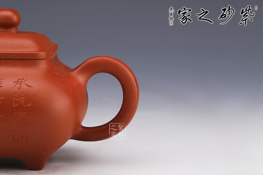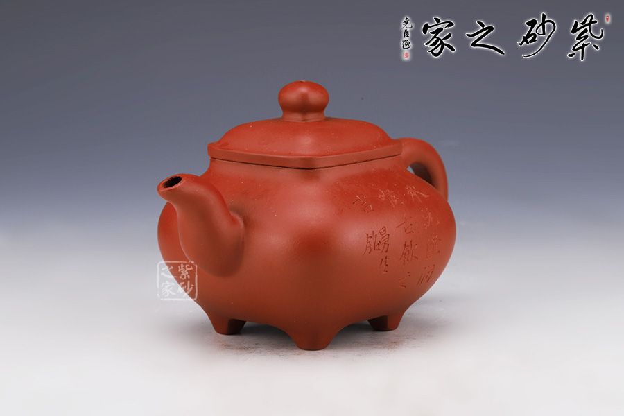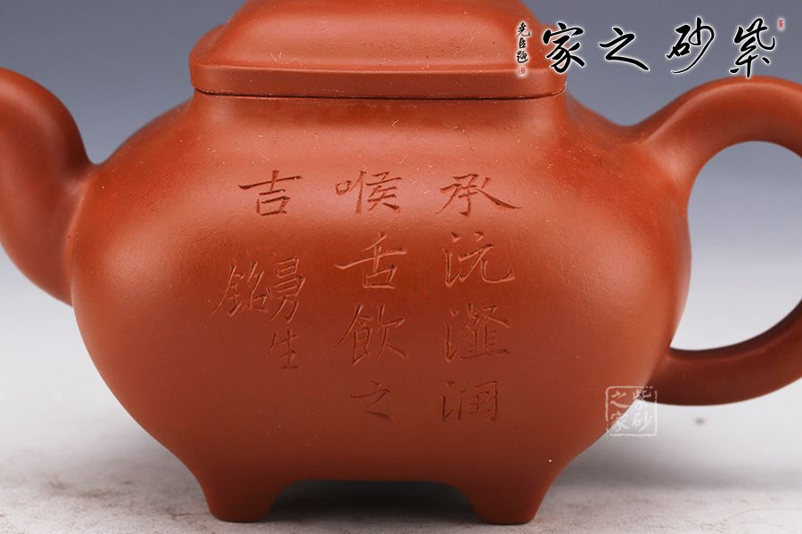 此壺仿若一個香爐,壺身骨肉亭勻,上豐下斂,輪廓清晰,線條流暢并過渡自然。底足皆采用四顆“釘足”形式,且多屬短柱型,精巧別致,落地穩(wěn)重。器身形狀以方器為基本形,但方中寓圓,比一般方器多了一份圓潤之美。