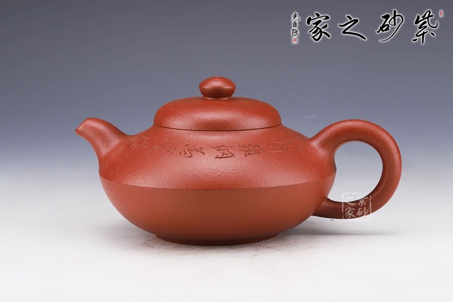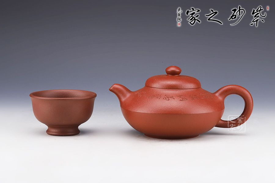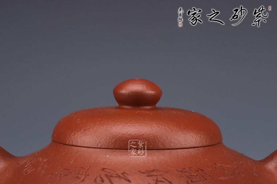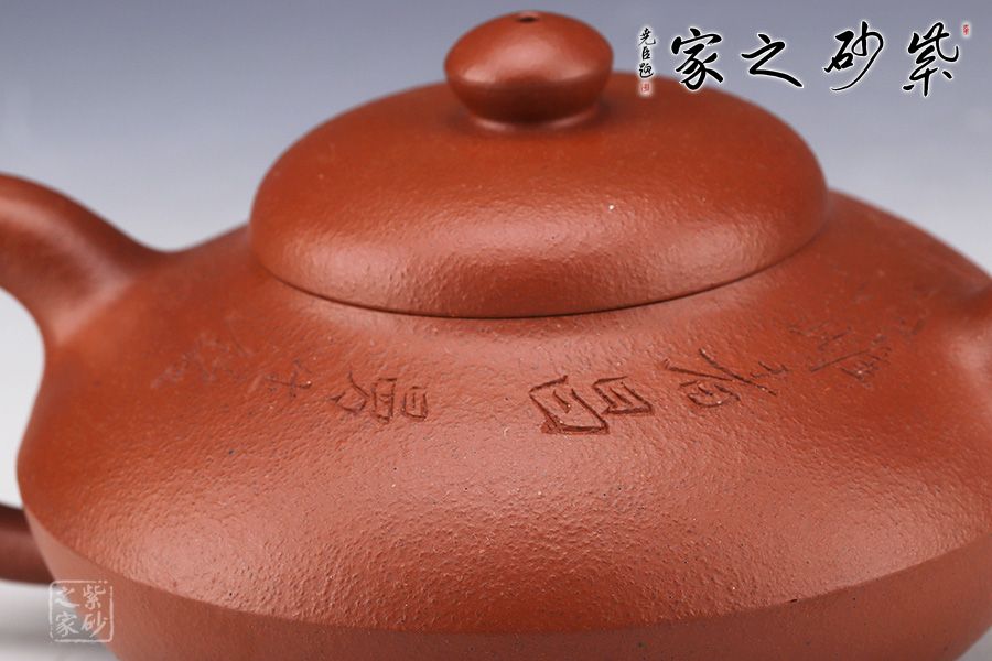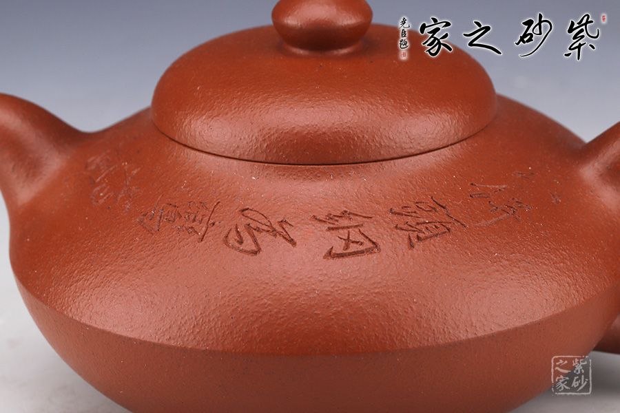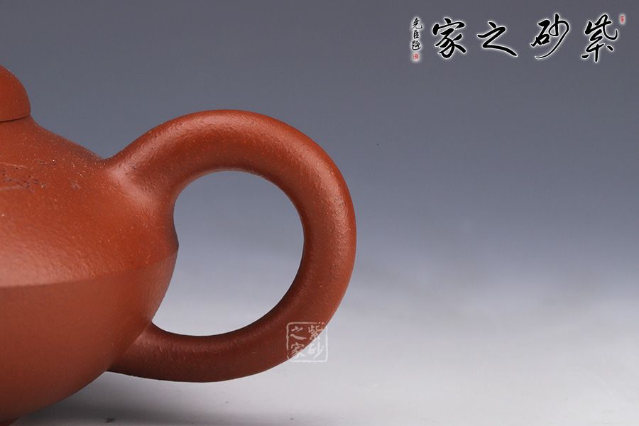 此壺精選原礦朱泥作胎,泥色泥色明潤(rùn)雅致。造型取自曼生經(jīng)典款型,壺身呈扁圓形,若兩器皿對(duì)合而成,腰線流暢順滑,過(guò)渡自然。坡蓋圓潤(rùn)精巧,壺鈕似壺身之形,兩者巧妙呼應(yīng)。挺拔上揚(yáng)的彎流嘴,出水爽利,秀麗的圈把,與壺嘴對(duì)稱向外延展,氣韻盎然。底部圈足托起壺身,平添輕盈,更顯雅致。