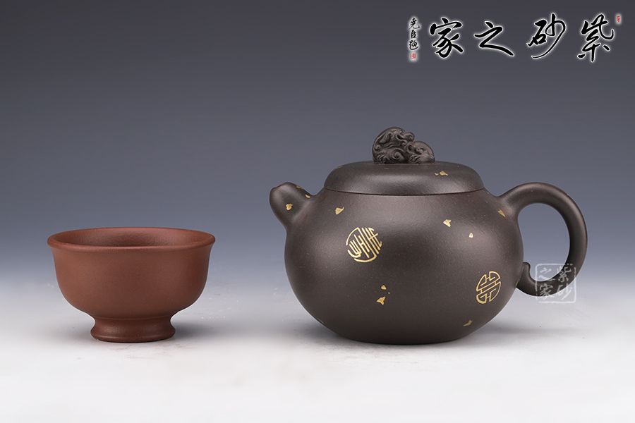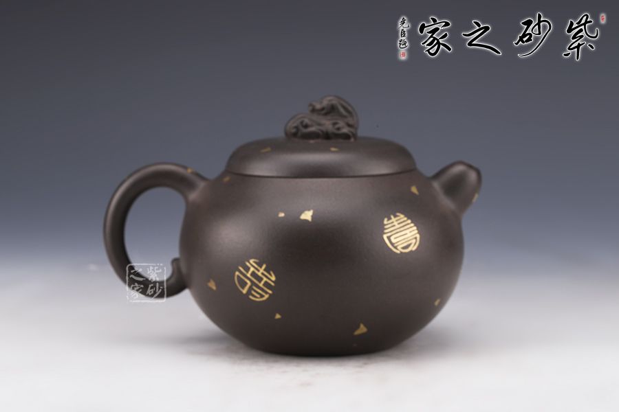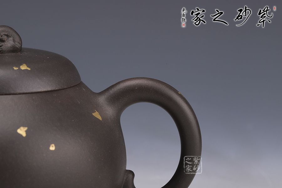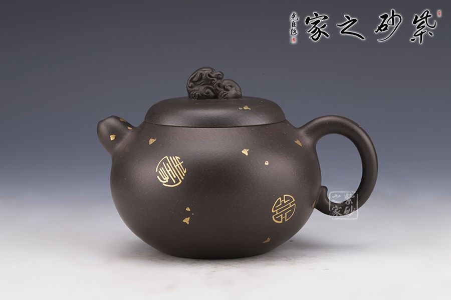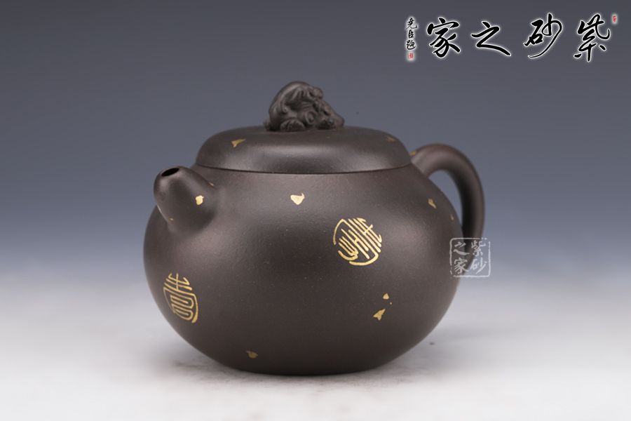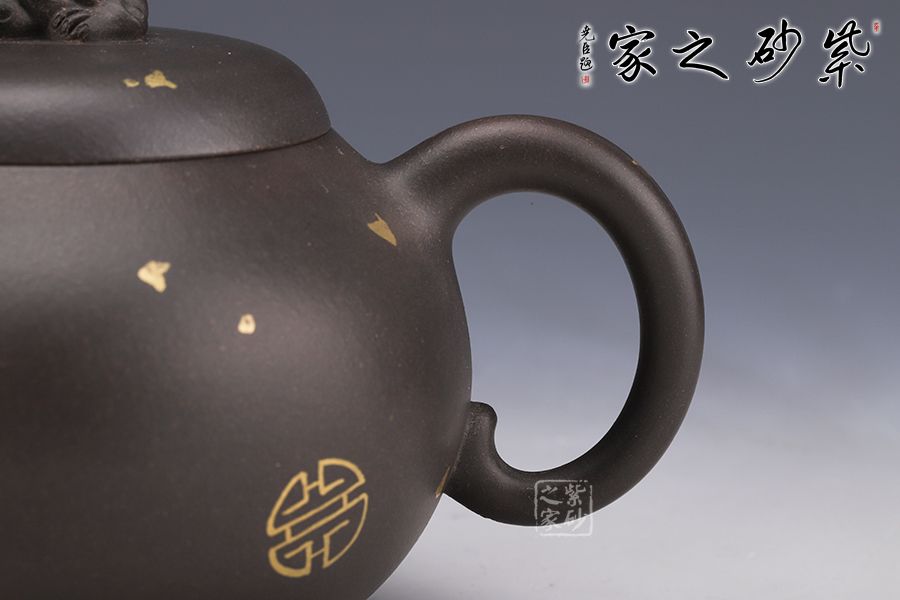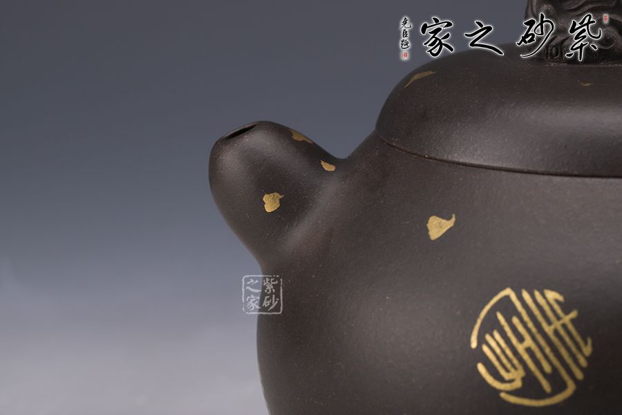 作品嚴(yán)謹(jǐn)規(guī)整,洗練精巧,凝重樸實(shí),神韻俱足,線條圓潤(rùn)自然,簡(jiǎn)潔流暢,質(zhì)樸大方,手感舒適,出水流暢,斷水利落;一只祥獸躍然壺蓋之上,寓意吉祥如意,安定和諧,通身灑金裝飾,猶如黑夜之中點(diǎn)點(diǎn)繁星,讓人無(wú)限遐想。