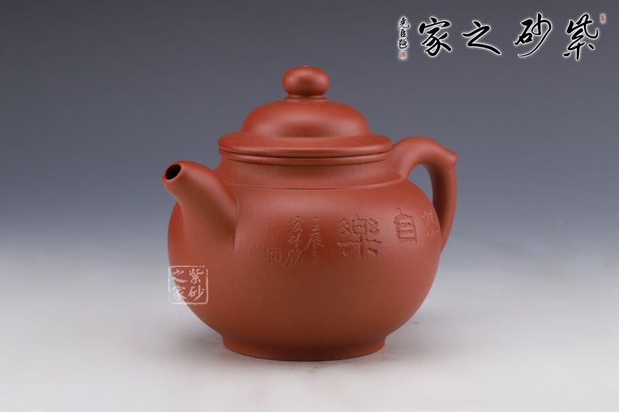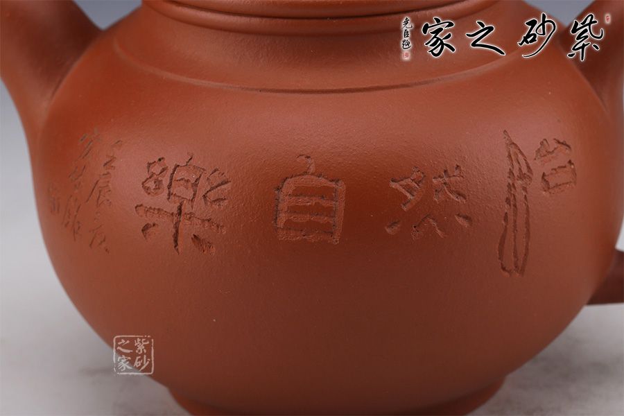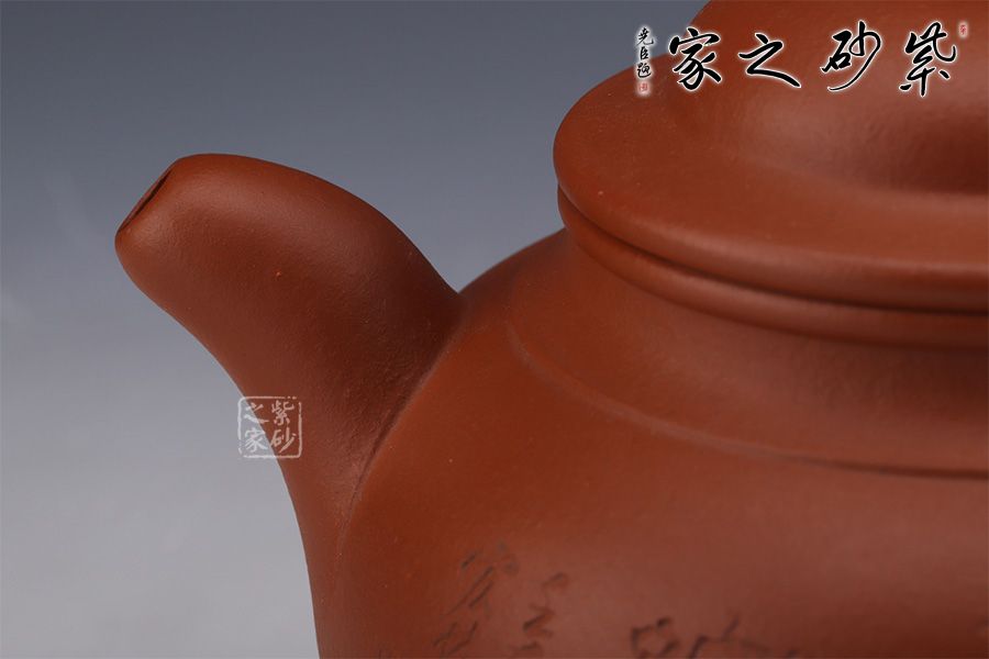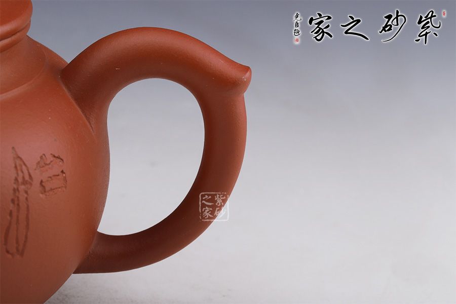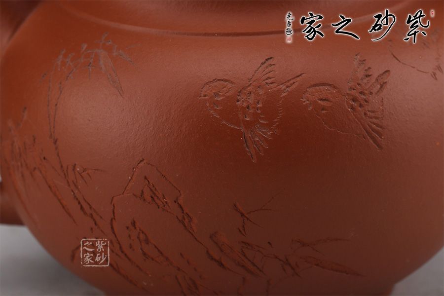 喜慶壺選用原礦朱泥制作而成,泥色溫潤醇和,砂質(zhì)細(xì)膩,溫文爾雅上等好泥。此壺有著渾圓的壺身,半圓的壺蓋,圓鈕,線條流暢,比例得當(dāng),壓蓋略微渾厚,點(diǎn)線之間見出魅力,子母線口蓋溫和嚴(yán)密,骨肉亭勻,簡練大方,制作頗見功力。彎流嘴胥出,在端頭下壓,柔美之姿明顯,壺柄略微上抬之后優(yōu)雅滑落而下,形成一條圓潤飽滿的弧線,樸雅大方。壺腹裝飾刻繪,極具把玩價(jià)值,值得推薦。