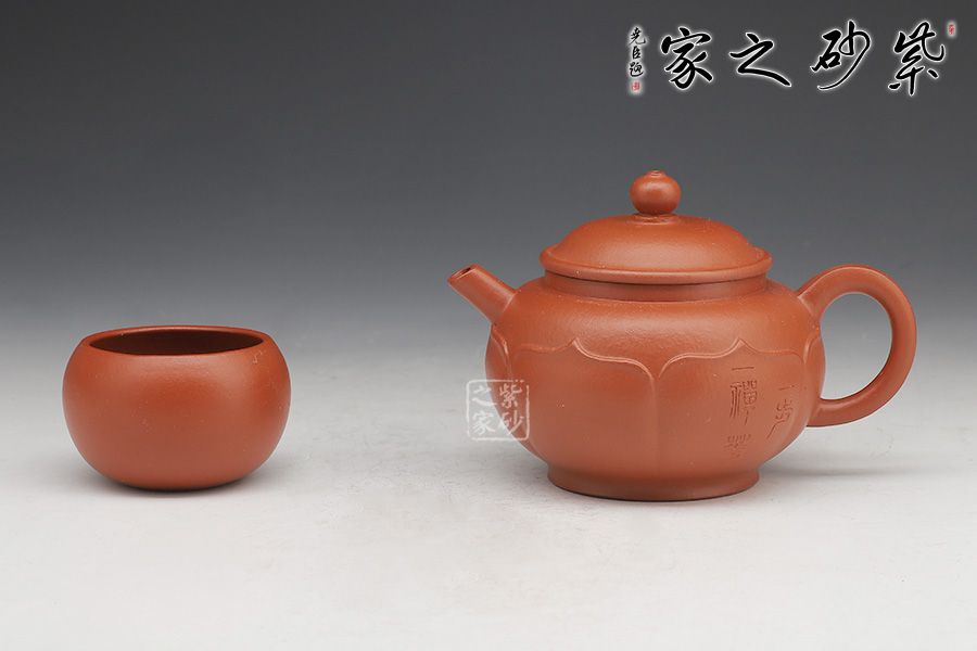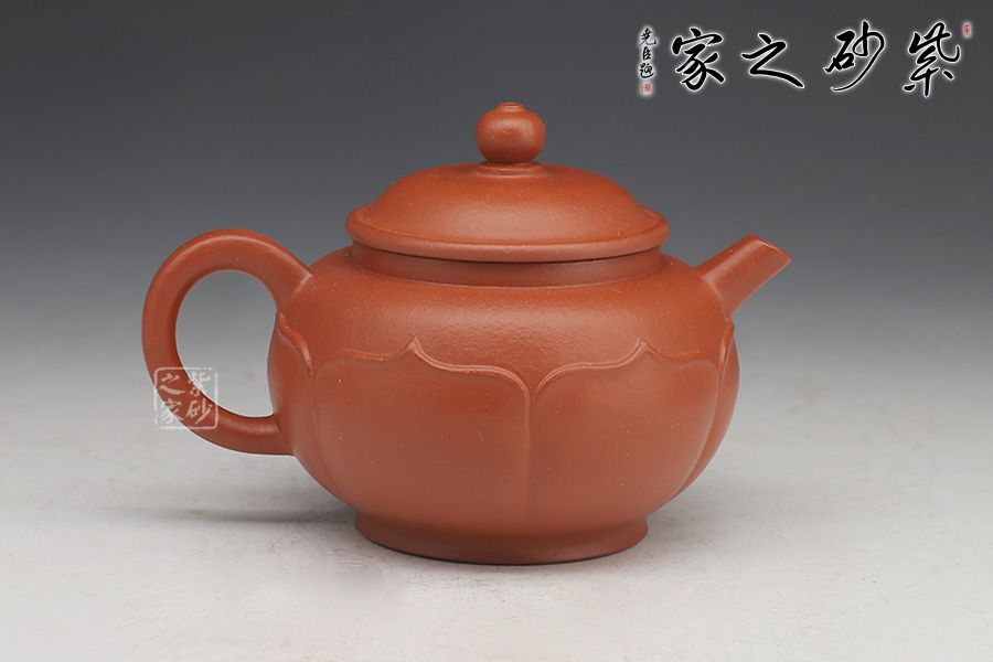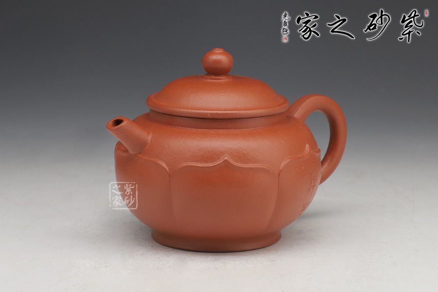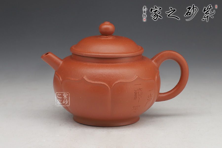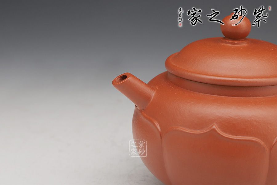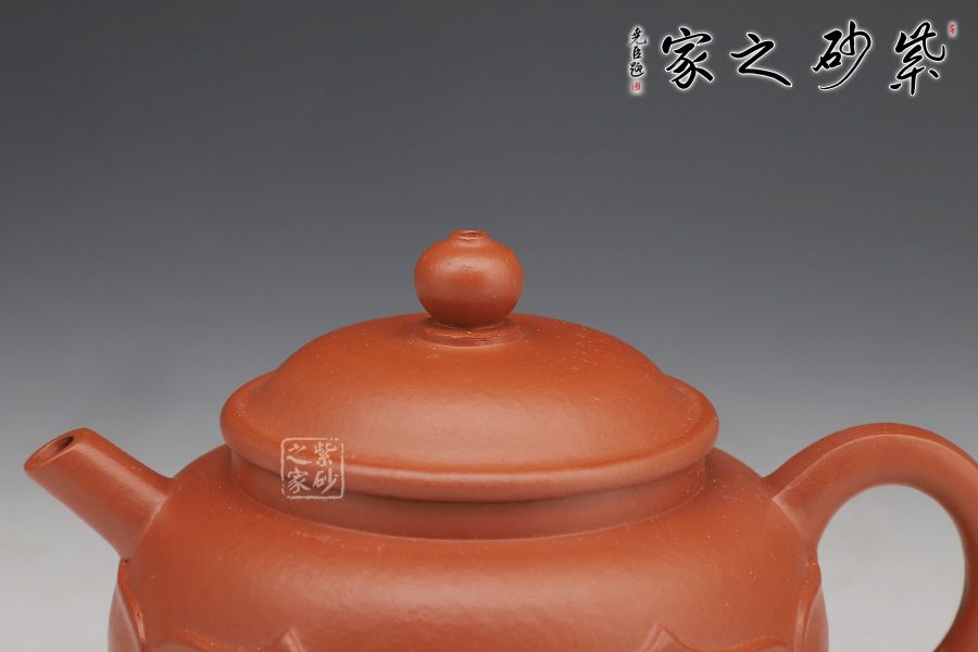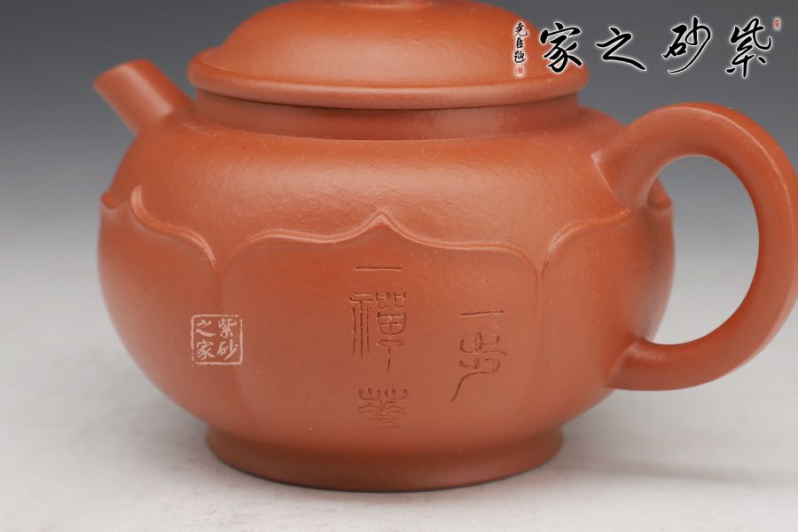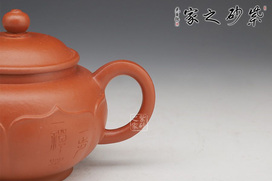 此壺圈足底,壺身圓潤光滑。壺口外張,嵌蓋入里,蓋面拱起。壺嘴微彎,出水利落;壺把粗出細(xì)收,精致巧妙。最獨(dú)特之處在于有蓮花自壺身底部出,將壺緊緊包裹,禪意無限。