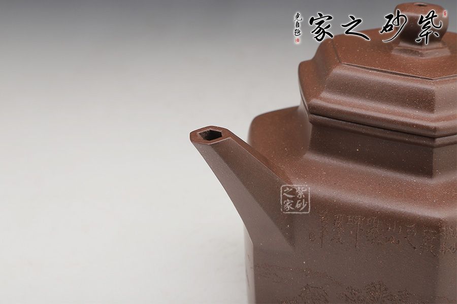 此壺以德鐘為基礎(chǔ),以方器來展現(xiàn),造型新奇,威嚴(yán)大方。壺身六方造型一絲不茍,方中寓圓,工整精細(xì),足見制作難度和用心程度。六面工整光滑,線條筆挺,氣魄雄偉。扁柱形鈕制作精細(xì),壺嘴亦為六方造型