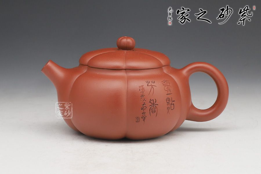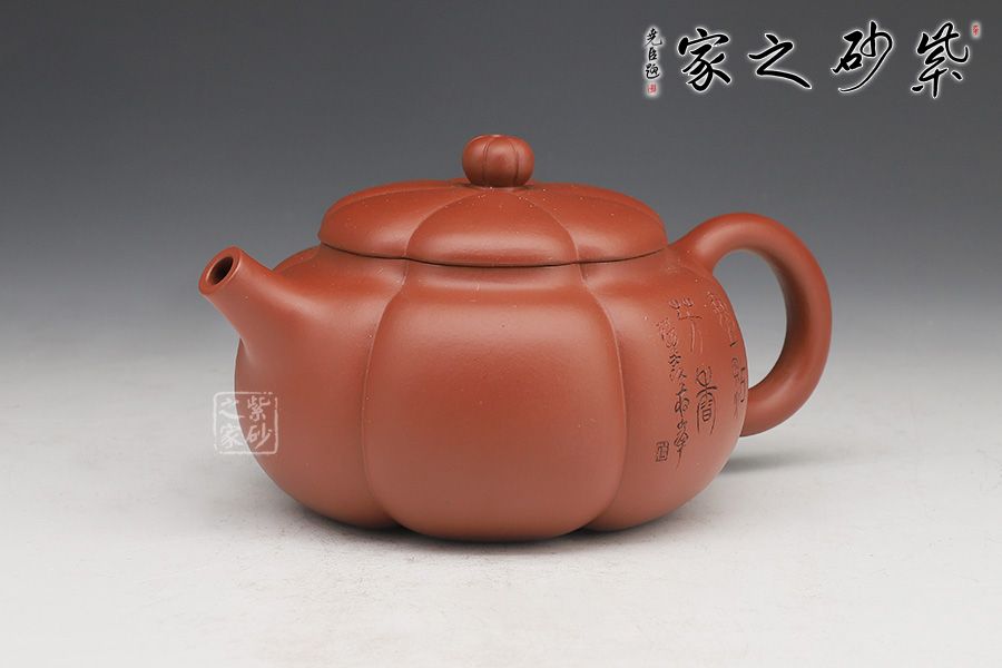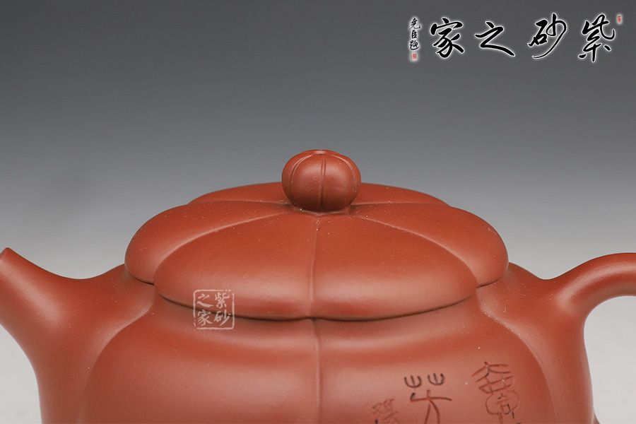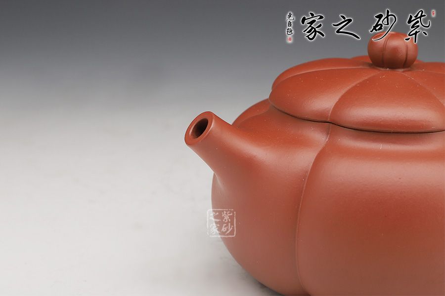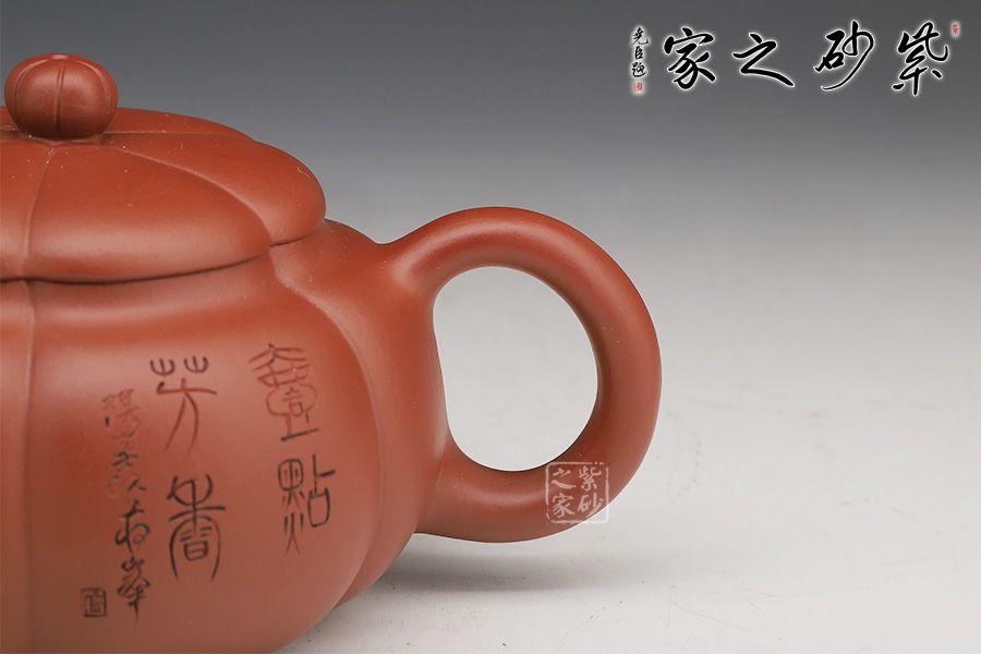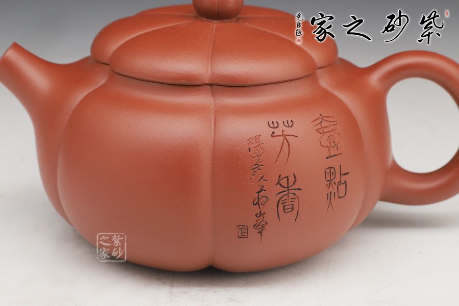 此壺以瓜形為壺體,筋脈逼真,構(gòu)思和諧巧妙,取材自然,雅而不俗。整體色澤古樸,形態(tài)逼真,饒有趣味。壺身圓融作筋紋狀,取南瓜之型。為六瓣依次圓弧起伏,別有韻味。