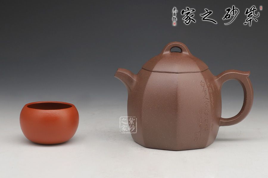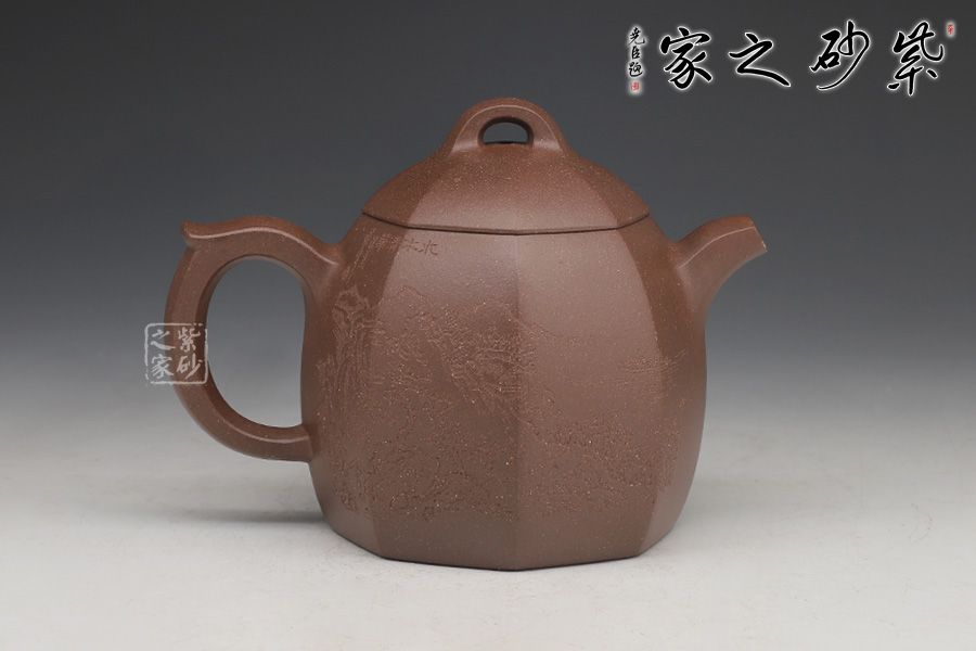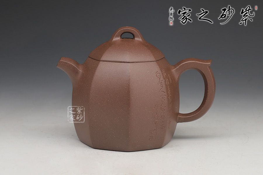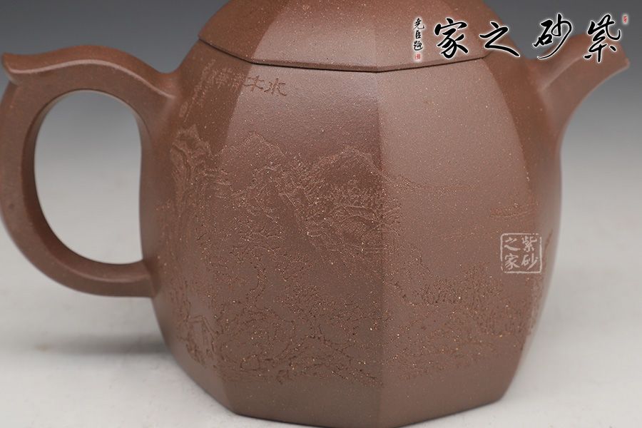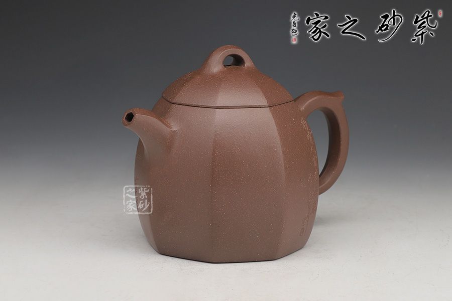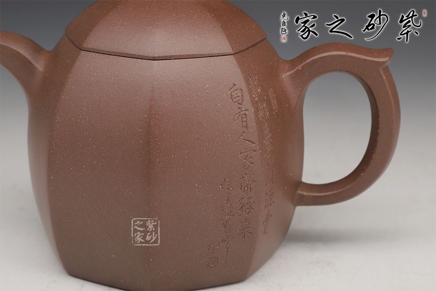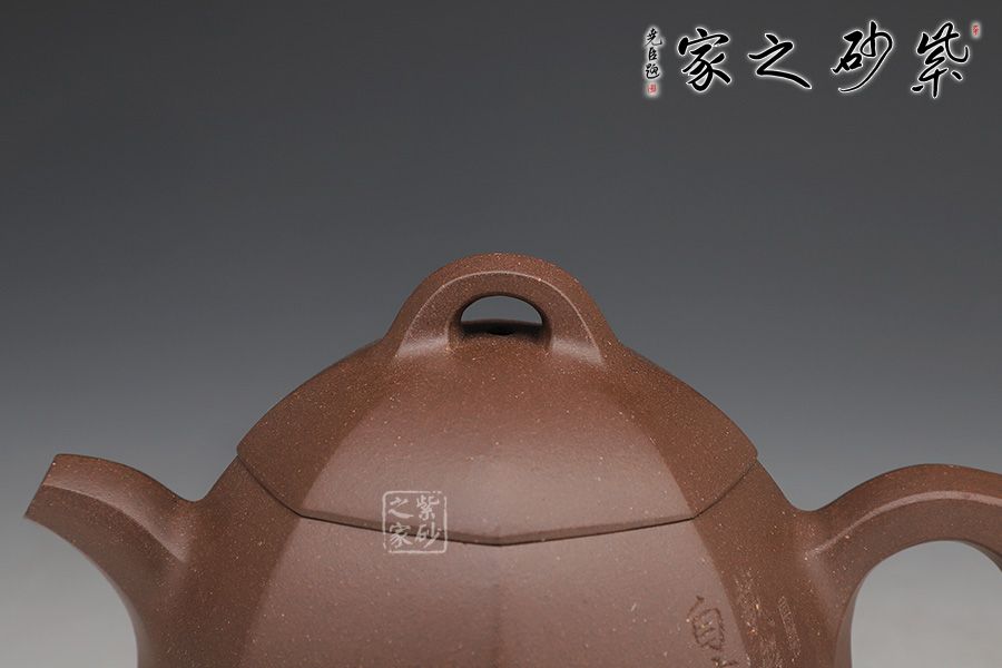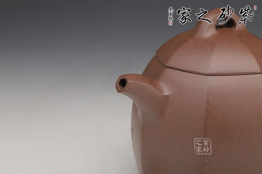 壺身為八邊形,八個面用柔和的線條過渡;壺鈕、壺把、流是八邊形的設計,線條挺括,涇渭分明,為此壺增添了陽剛的氣質;區(qū)別于傳統(tǒng)的圓身造型,改為八方形的造型,方中寓圓,陽剛中帶有雅韻氣韻。