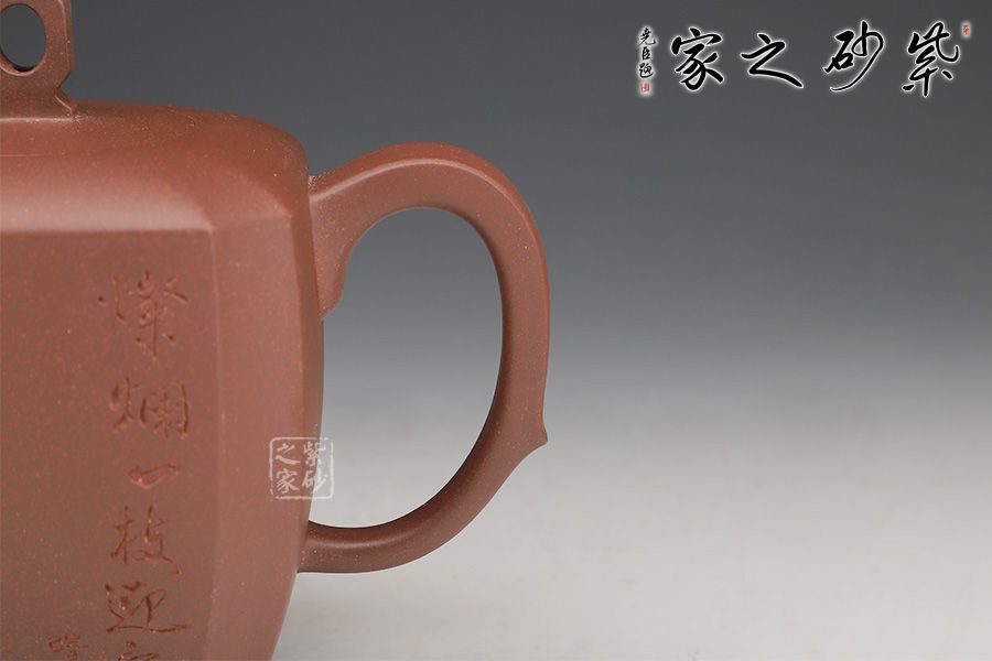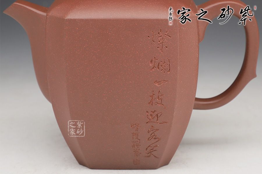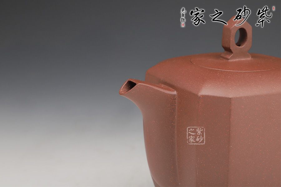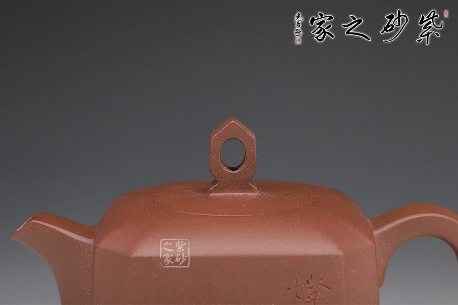 壺型在方器中融入弧線,將圓的美妙帶入方的工整,十分有趣。壺身本是工整的梯形,四面鼓起,切面更加圓潤細膩。棱角抽掉,不露鋒芒,但工整的意味卻愈發(fā)突出。壺蓋圓滑自然,蓋上的壺鈕有筋紋器的韻味。方形線條使用,給彎流壺嘴和環(huán)形把加入工整的感受。