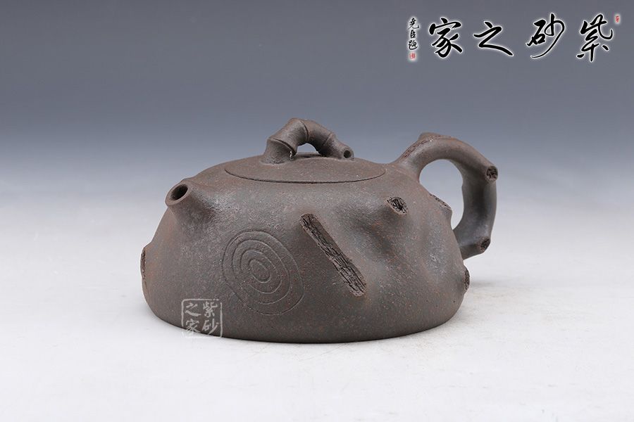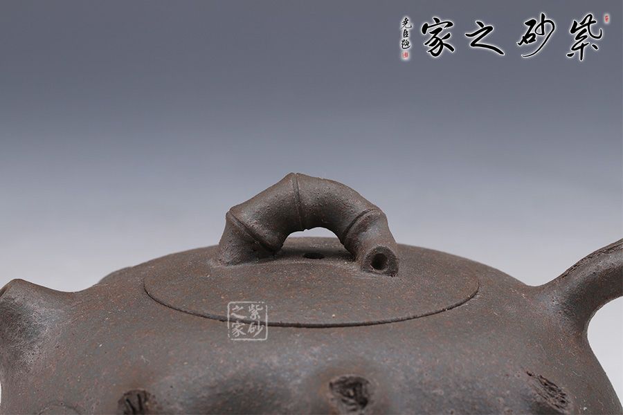 此壺做工精良,造型別致。壺身似半月虎,間以竹節(jié)、松枝飾之,壺底平足,壺蓋圓弧飽滿以壓線圍邊,于質(zhì)樸圓渾中帶有幾分靈巧。以竹、松為題,壺把與壺嘴皆以裝飾, 壺身癭節(jié)裝飾,細(xì)節(jié)滿滿。