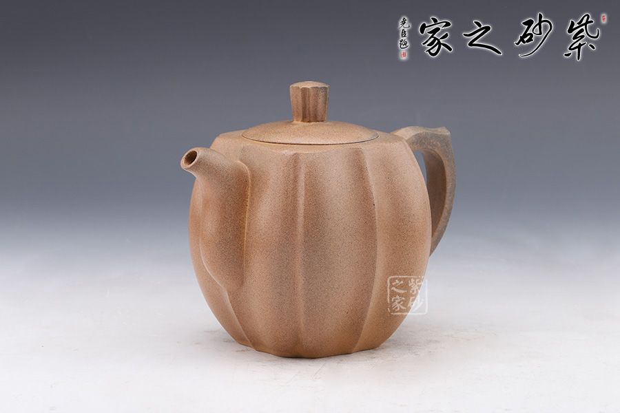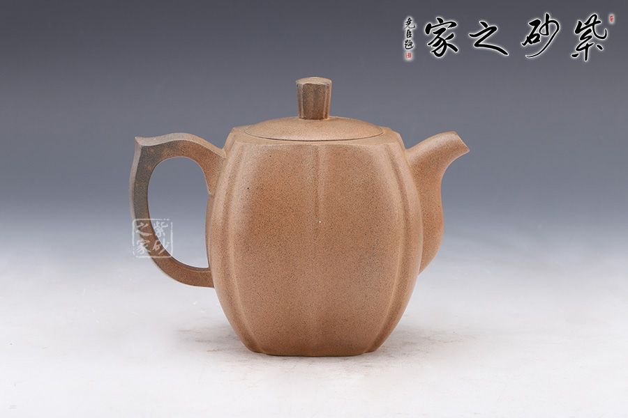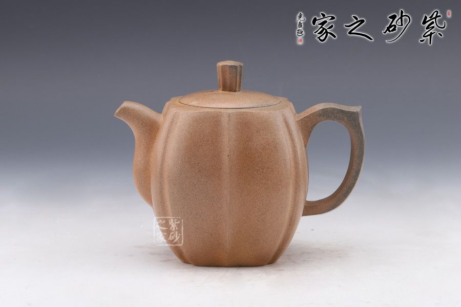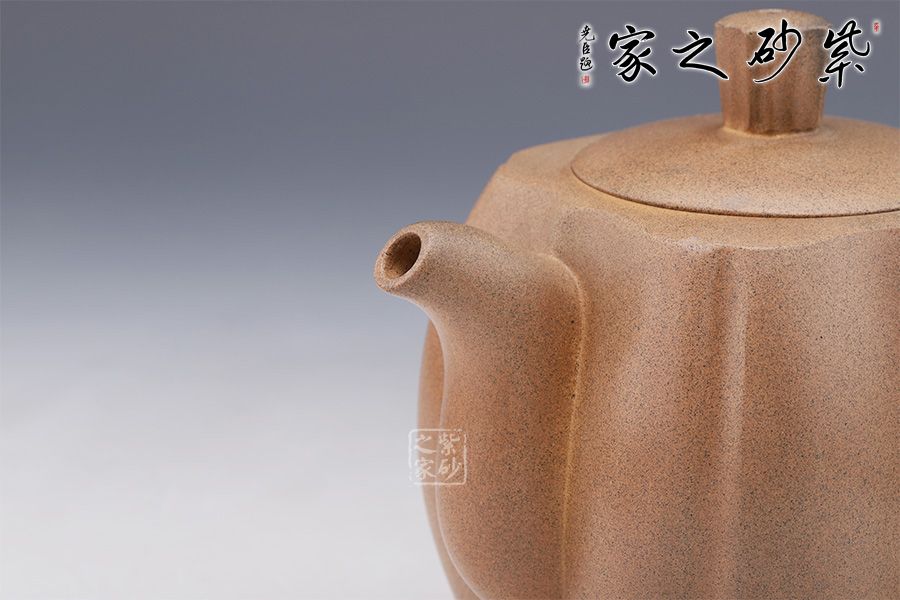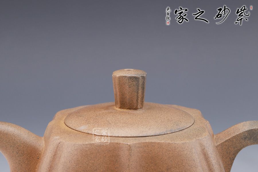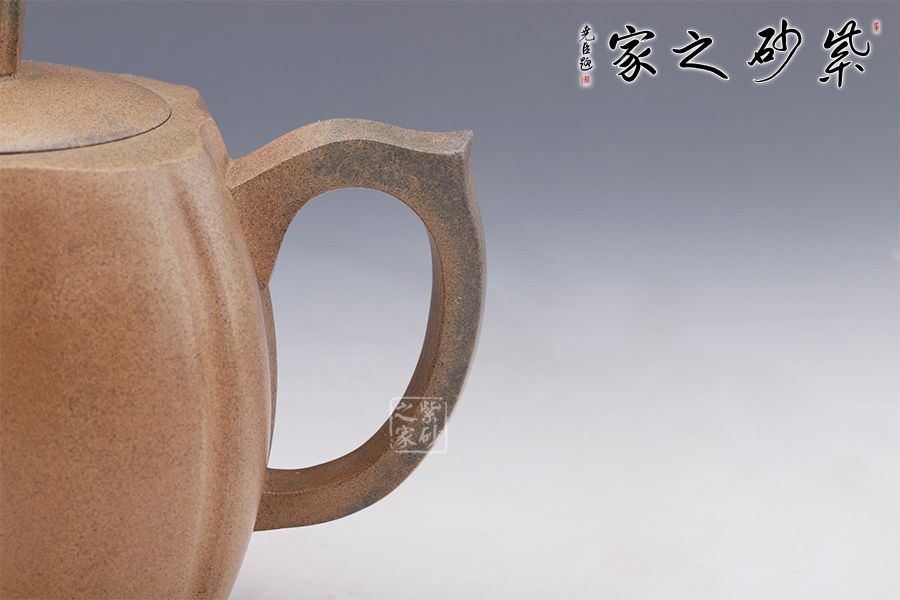 筋紋器在紫砂壺中為常見壺型,實(shí)際上筋紋器制作并不是一件容易的事,在筋紋器中尋求創(chuàng)新更是一件難事。筋紋勾勒出壺身,狀若菱花,生動、流暢的線條變化就是優(yōu)美的花瓣,在筋紋的基礎(chǔ)上又加入方器元素,要求工藝極高,可見老師制壺功底。彎流與耳形飛把對應(yīng),以暗接手法融合于壺身。壺鈕十分具有特色,分為八塊面,對應(yīng)每個壺面,十分具有巧思。