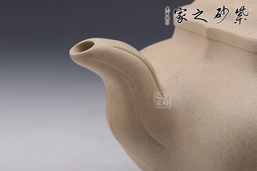 此壺名為傳爐,底蘊(yùn)儒雅,神形氣韻兼?zhèn)?。該壺仿若一個香爐,壺身骨肉亭勻,上豐下斂,輪廓清晰,線條流暢并過渡自然。壺嘴呈彎流狀蜿蜒上翹,優(yōu)雅自然,出水爽利。耳形壺把端莊自然,壺底處四個乳足高挺,襯托了壺的高俊挺拔之氣。靜觀此壺,仿若有裊裊青煙從優(yōu)雅端莊的壺中飄散開來,令人心曠神怡,好似進(jìn)入了另一個層次的人生境界中,耐人尋味。此壺,值得珍藏。