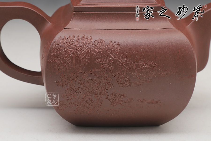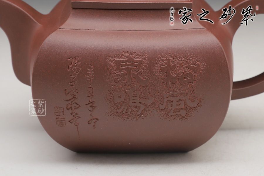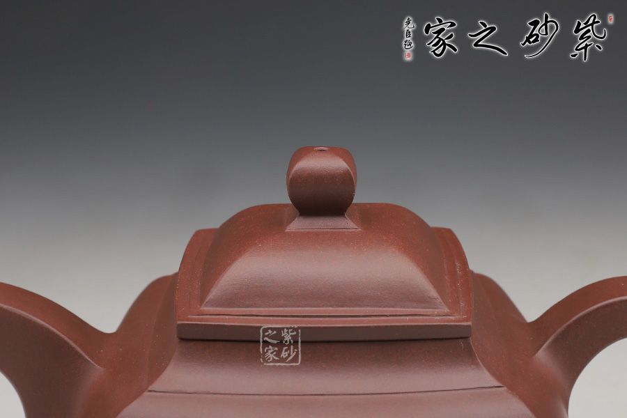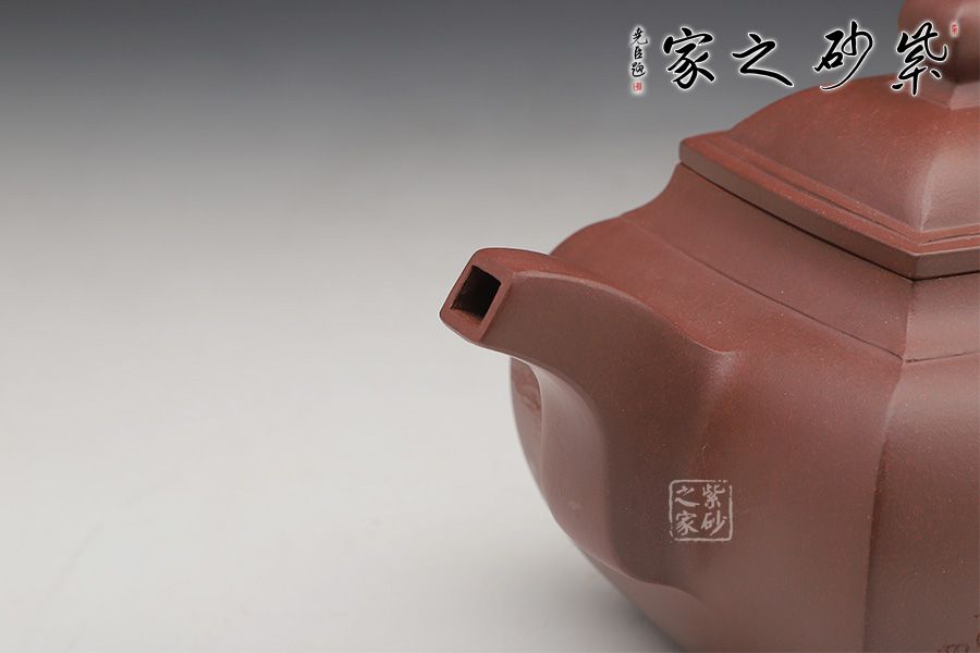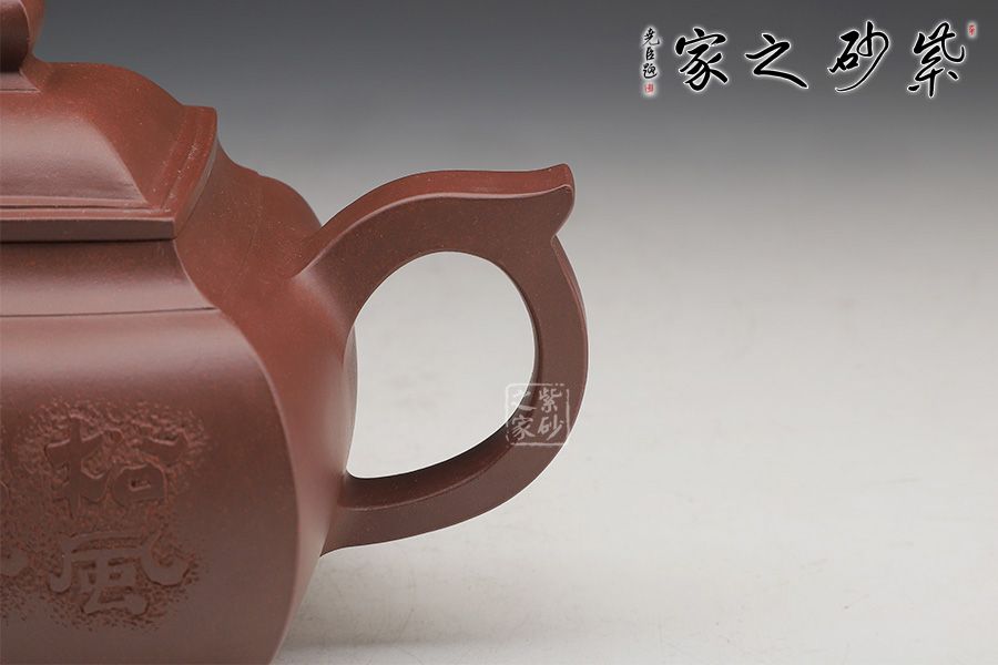 這款壺器在造型方面,彎曲的弧度與挺括的直線完美的結(jié)合在一起,相互承載,達(dá)到方中有圓,圓中有方的感覺。在壺把與壺嘴的設(shè)計(jì)中不難看出。壺蓋好似寶鼎,壓蓋與壺口融合為一體,氣密性良好。整體彰顯了此壺獨(dú)到的氣質(zhì)和神韻。