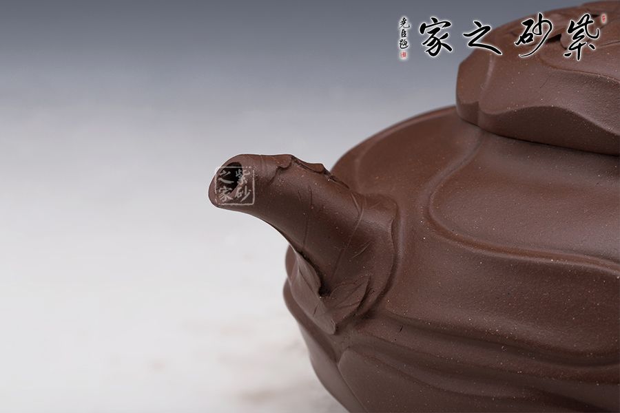 原礦紫泥所制,多年陳腐,色澤潤亮有光,充滿歲月沉淀之美。壺蓋、壺把、壺嘴形似錦葵,與壺身渾然一體。造型簡潔明快,曲線順暢自然。壺鈕仿若錦葵花之蕊,壺蓋若錦葵之殘瓣落英,壺把若錦葵彎曲之莖桿,筋紋細(xì)節(jié)刻繪傳神。整個壺身觀之若風(fēng)卷殘云,錦葵花傲然挺立,即便玉體摧傷,嬌枝凌亂,仍不懼驟雨狂風(fēng)。