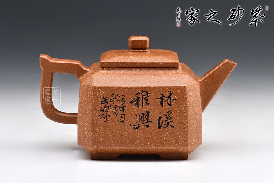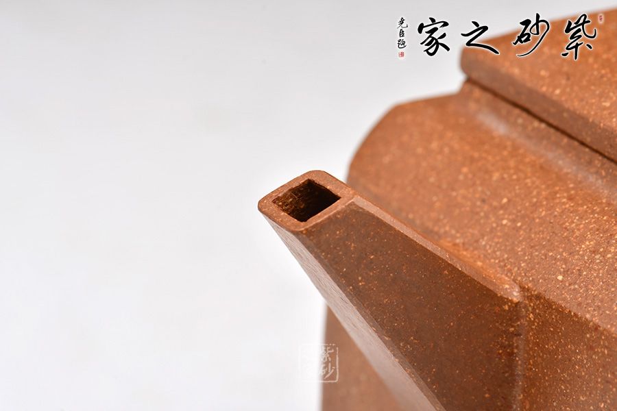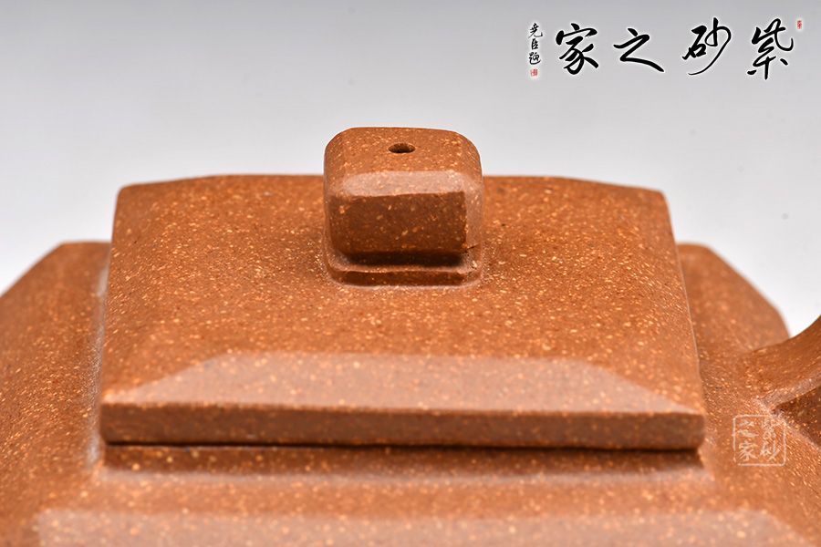 壺體造型方體,型制方正,平蓋橋形鈕,短直流,方圈把。整體造型比例協(xié)調(diào),棱角分明,給人以挺拔硬朗的氣勢,于穩(wěn)健中見大氣度。