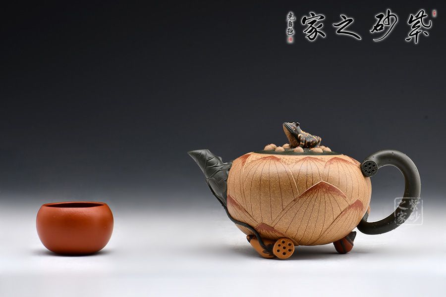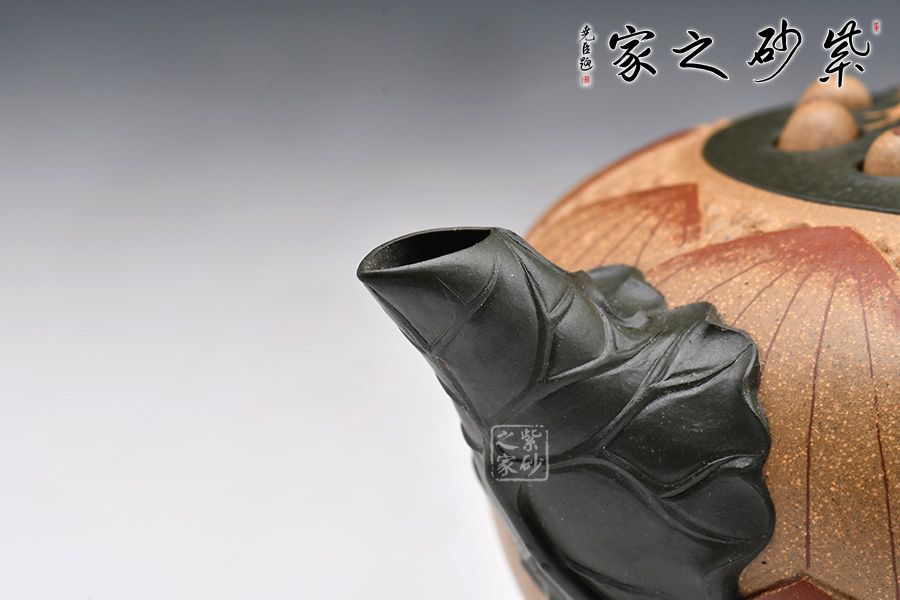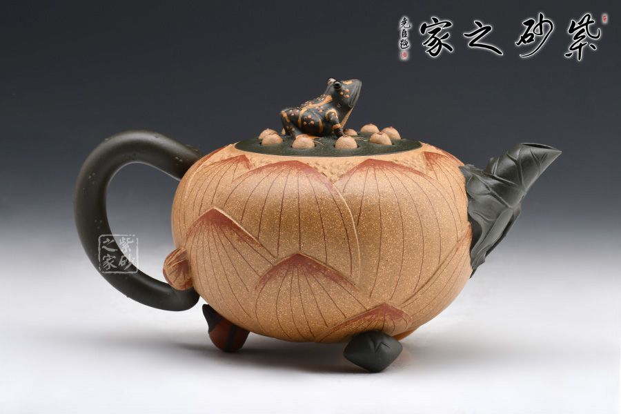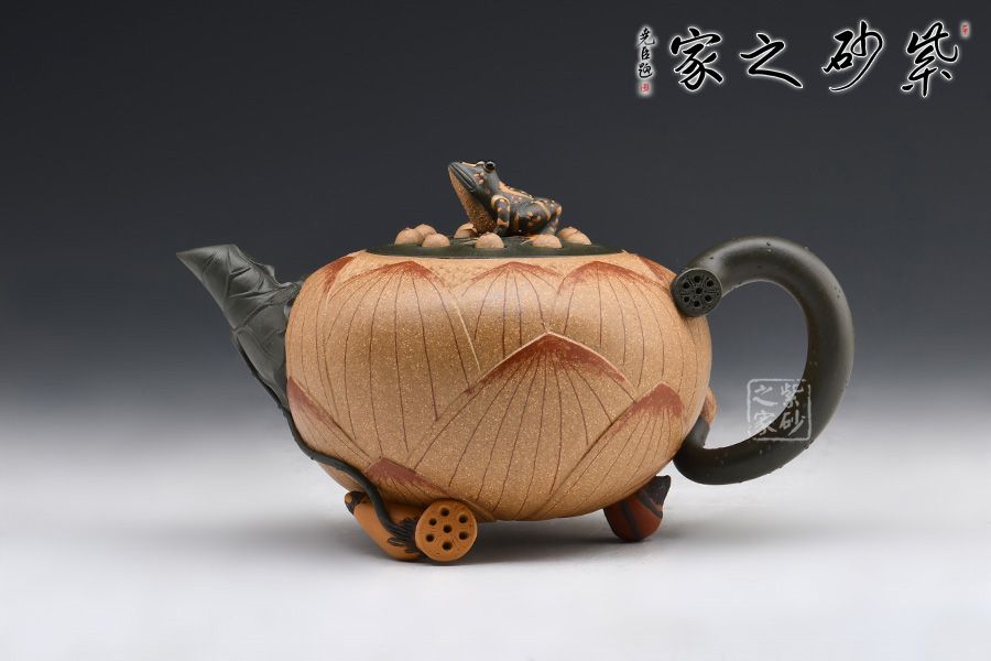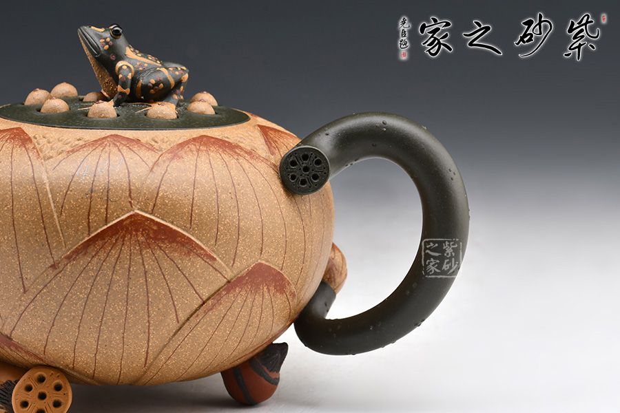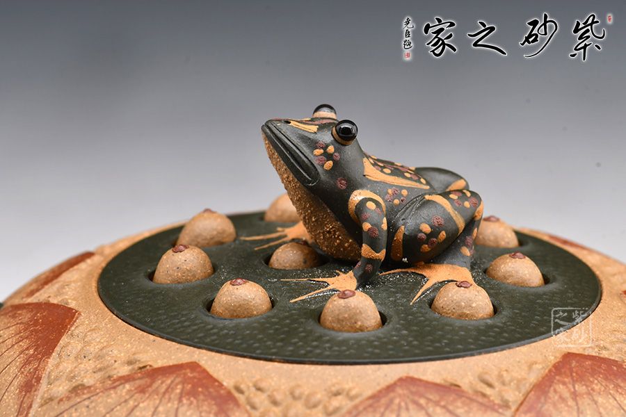 蔣菊芳,正高級(jí)工藝美術(shù)師,曾受蔣蓉大師指點(diǎn),被蔣蓉大師評(píng)價(jià)為“未來花器傳承人”。此壺亦是花器,壺蓋做成蓮蓬的樣子,稀松的蓮子非常逼真,蓮蓬上站著一只小青蛙,栩栩如生。壺身也是按蓮蓬的紋路制作。橫向看,整把壺就是一個(gè)蓮蓬,壺底上還非常細(xì)節(jié)的做了一個(gè)蓮藕,使整把壺不僅是在外觀上相似,在生理上在自然界也一模一樣。