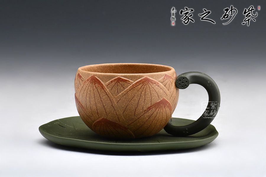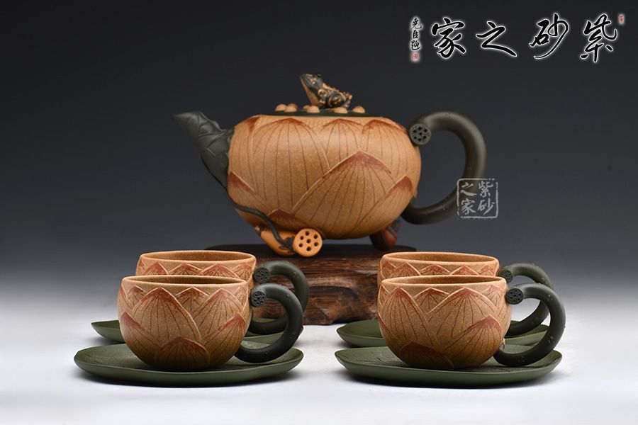 此壺是套壺,一壺四杯四杯墊九件套,這也極大的提升了制作難度,成型也是紫砂器中非常難得一部分,杯子跟壺配套,杯身同樣也是蓮蓬的紋路,縮小的蓮蓬。一家四口可用此套壺品茶,其樂融融。