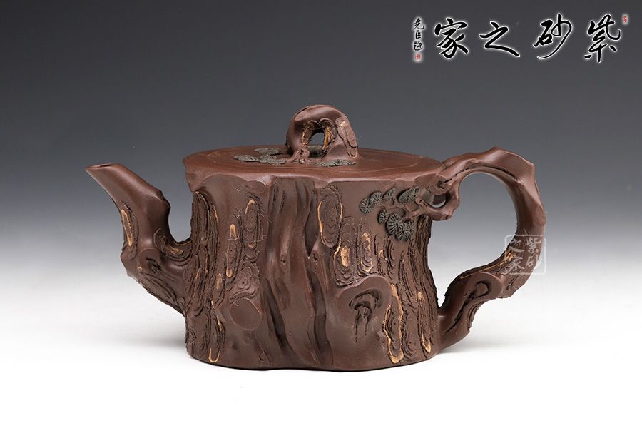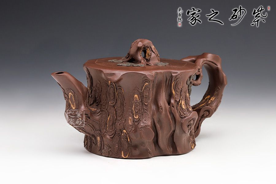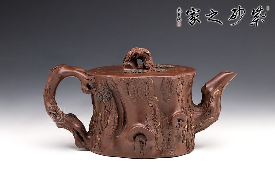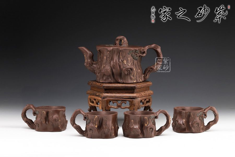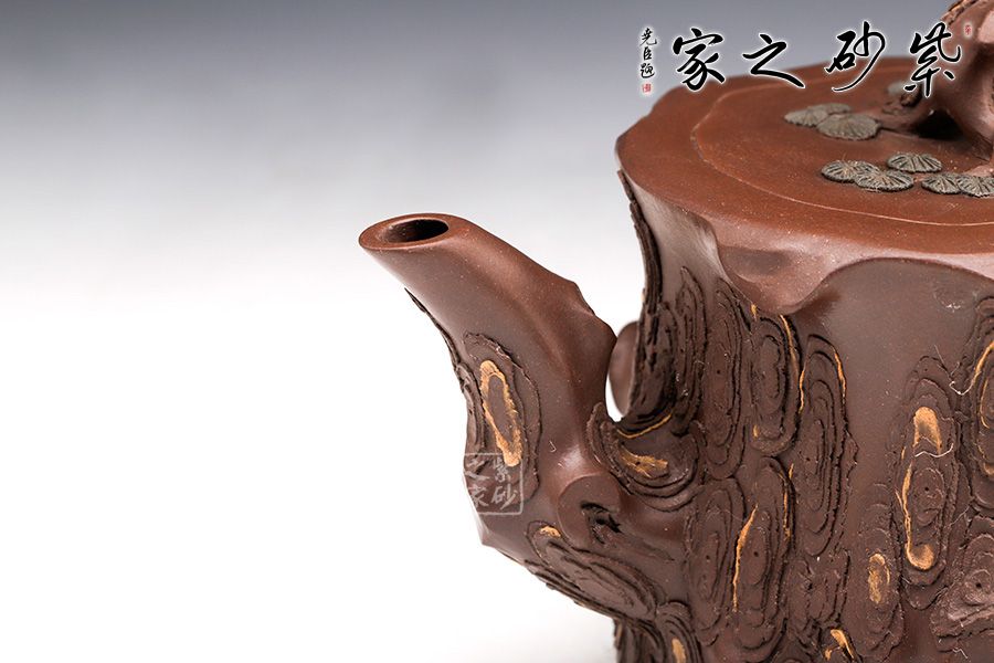 花器,非常經(jīng)典的器型,深受眾多壺友喜愛,優(yōu)雅永不過時。此壺造型上是松樁的形狀,采用老紫泥的泥料,更添松樁的韻味。壺身凹凸不平肌理感十足,壺嘴壺把彎曲似松枝,壺身出再實用少許綠泥貼花,春意盎然,意境十足。不得不提的是此壺是套壺,做了酷似松樁卻肌理感毫不相同的四個杯子,實用觀賞皆是上品,跟幾位好友一起喝茶賞松,一大快事。