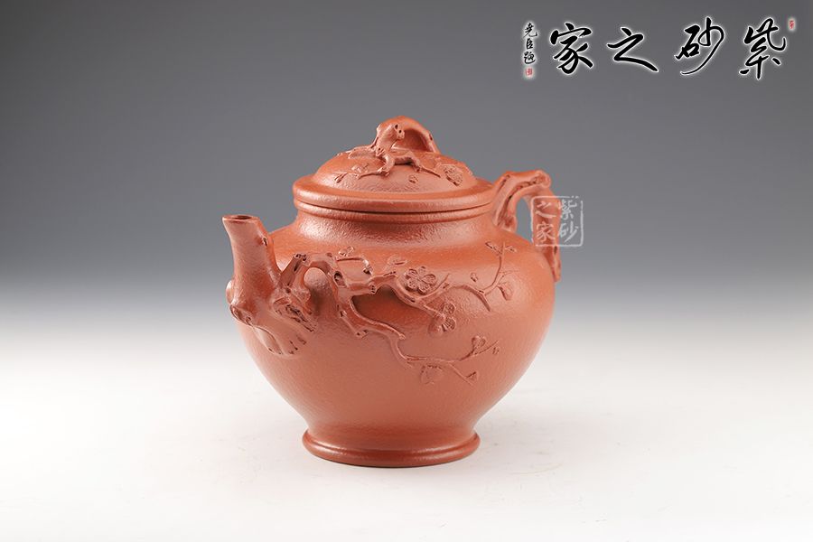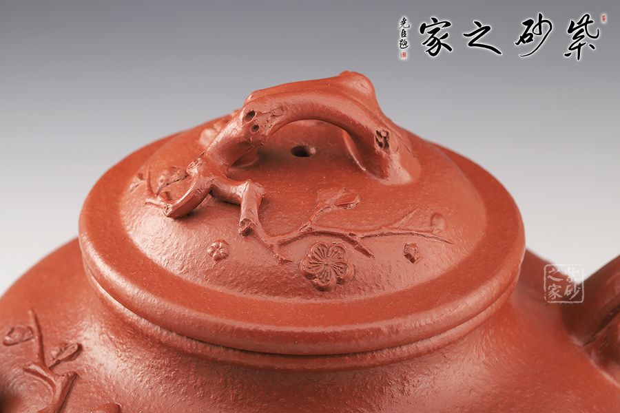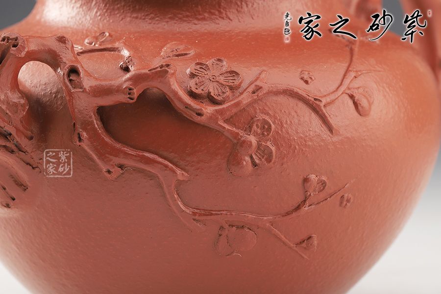 此壺以梅花枝梗作嘴、把、鈕,枝,節(jié)疤布置合理,伸展自然,暗香浮動(dòng)。挺秀飽滿的圓形壺身上幾支梅花枝條伸展,昂然綻放。此壺運(yùn)用多種手法,生動(dòng)地刻畫了梅花不畏風(fēng)霜嚴(yán)寒,俏麗優(yōu)雅的姿態(tài),兼具實(shí)用性和觀賞性,值得收藏。