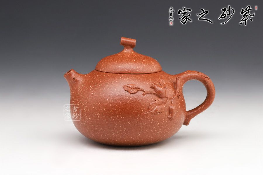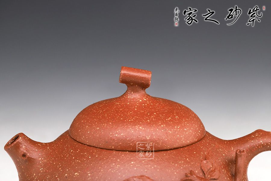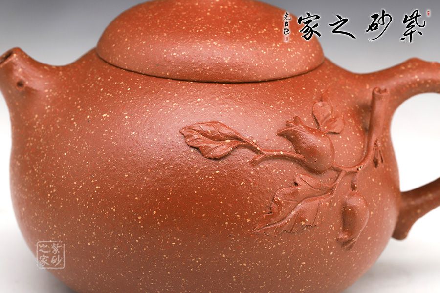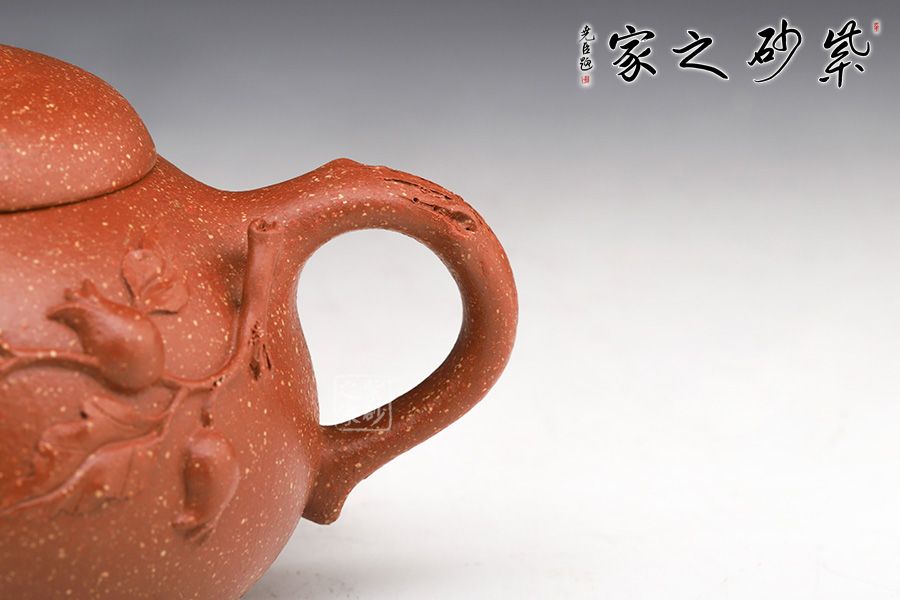 此壺是石榴花器,壺身是石榴果實(shí)的形狀,壺鈕的木蒂讓整個(gè)石榴增添了活力,就像剛從樹上摘下的石榴,整把壺采用降坡泥,砂質(zhì)感極強(qiáng),降坡泥的紅色跟成熟石榴的紅色相近,非常的逼真,鮮嫩紅潤的石榴果實(shí),令人垂涎欲滴。壺嘴和壺把皆似石榴樹的莖,蒼勁有力,古樸素雅。此外,該壺還采用貼花制壺工藝,于壺嘴處胥出一枝石榴葉子,葉茂花美,耀眼奪目。壺身飽滿圓潤,把玩舒適。