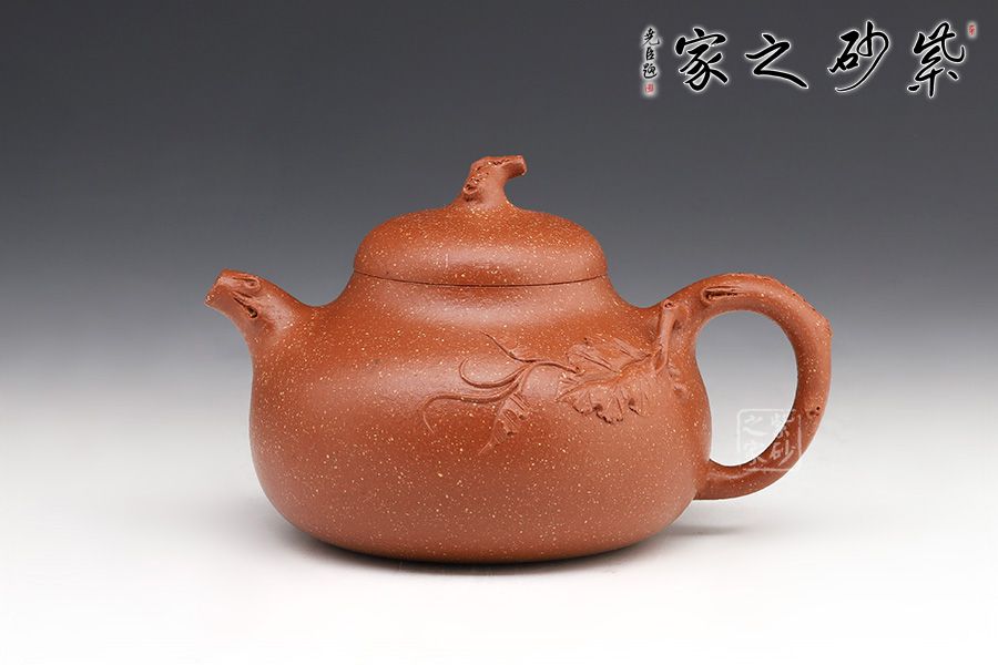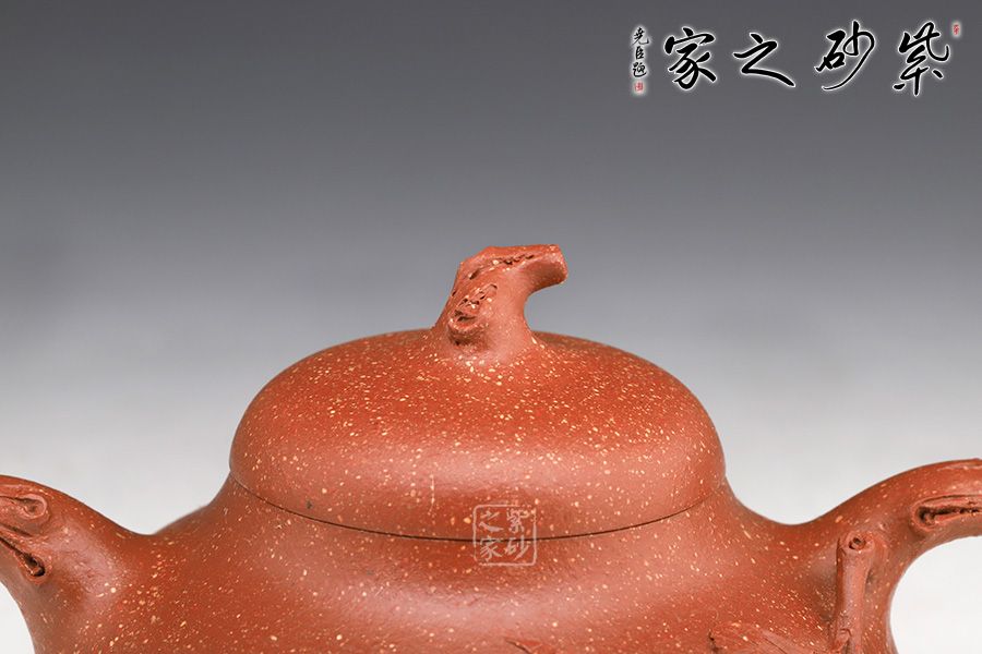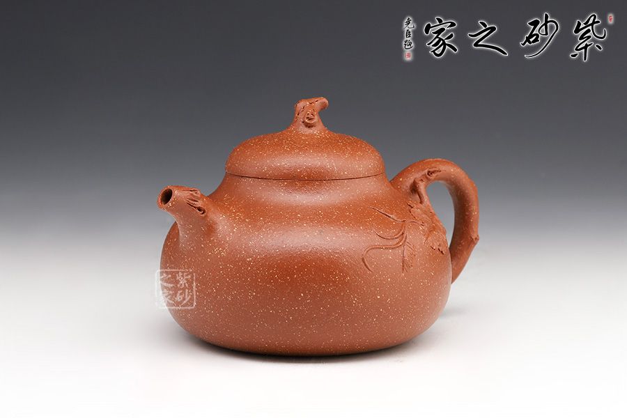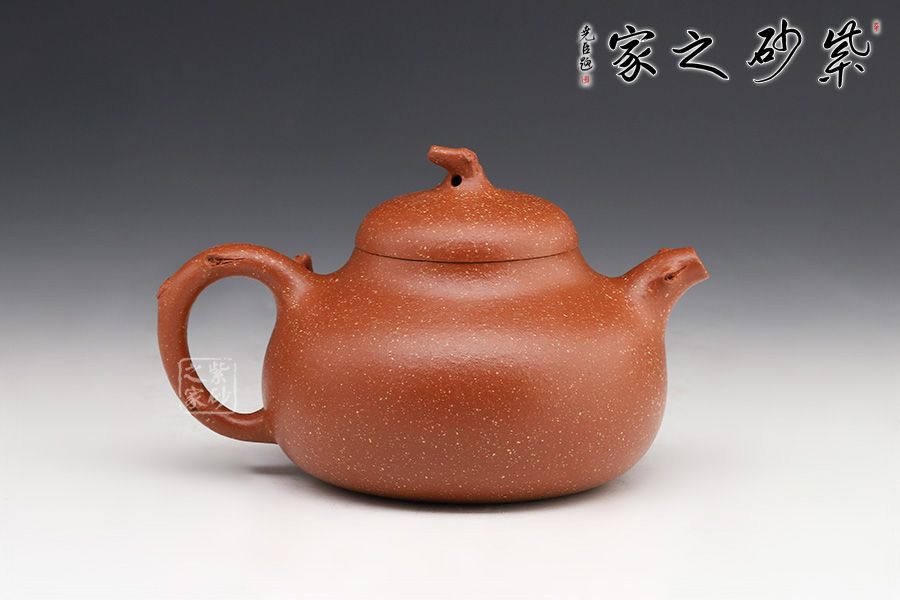 葫蘆同音福祿,是中華民族最原始的吉祥物之一,上至百歲老翁,下至孩童,見(jiàn)之無(wú)不喜愛(ài)。此壺同樣是根據(jù)葫蘆的造型制作,上小下大,逼真形象。壺鈕呈葫蘆蒂狀,壺嘴壺把是葫蘆的根須,壺把還有藤蔓蔓延出來(lái),給飽滿的壺身增添了肌理感,同樣也使葫蘆更加的逼真。降坡泥星星點(diǎn)點(diǎn)的砂子仿佛像葫蘆籽溢出一般,韻味十足。