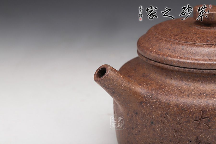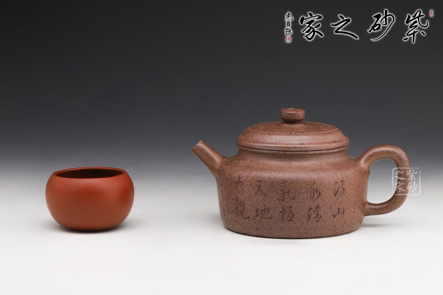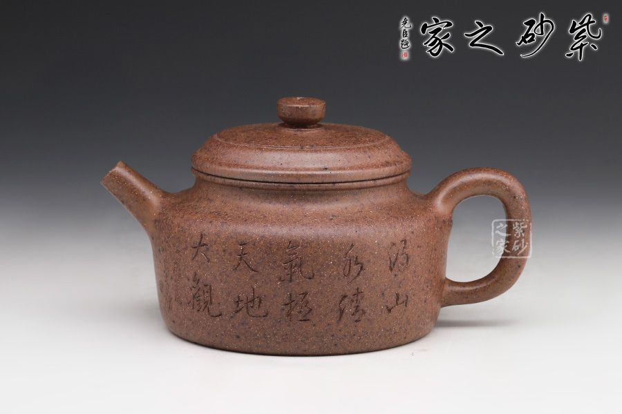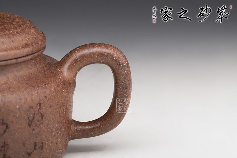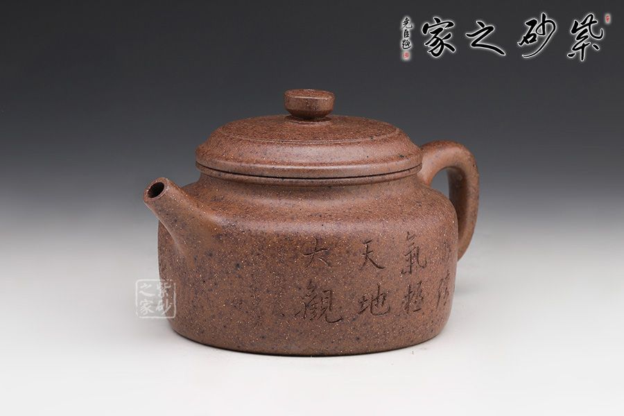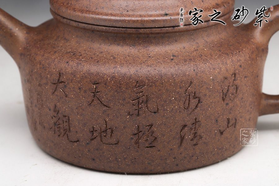 德鐘是紫砂光素器中的經(jīng)典器型之一,這款“德鐘”器形端莊穩(wěn)重,比例協(xié)調(diào),結(jié)構(gòu)嚴謹,造型簡潔質(zhì)樸,令人沉醉在其典雅的氣韻之中慢慢回味;采用的是獨有共生礦制作而成,古樸典雅、老味十足;壺身挺括,壺蓋又比較高聳,更添了一番清瘦高古之美;明接直流嘴修長昂揚,出水迅猛有力;端把方圓結(jié)合,端握起來舒適有力;傳統(tǒng)壓蓋嚴絲合縫,氣密性良好,扁柱鈕與壺身造型相稱。壺身刻繪“得山水清氣,極天地大觀”更添霸氣的韻味。