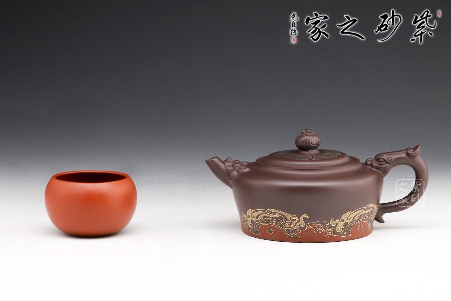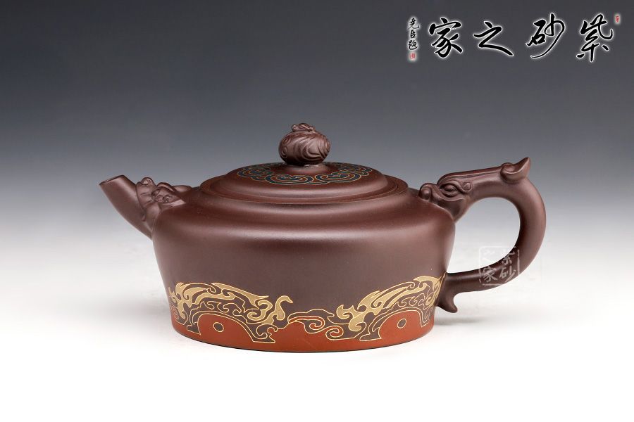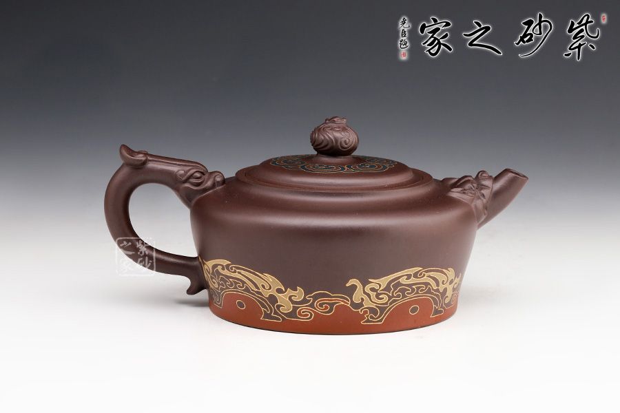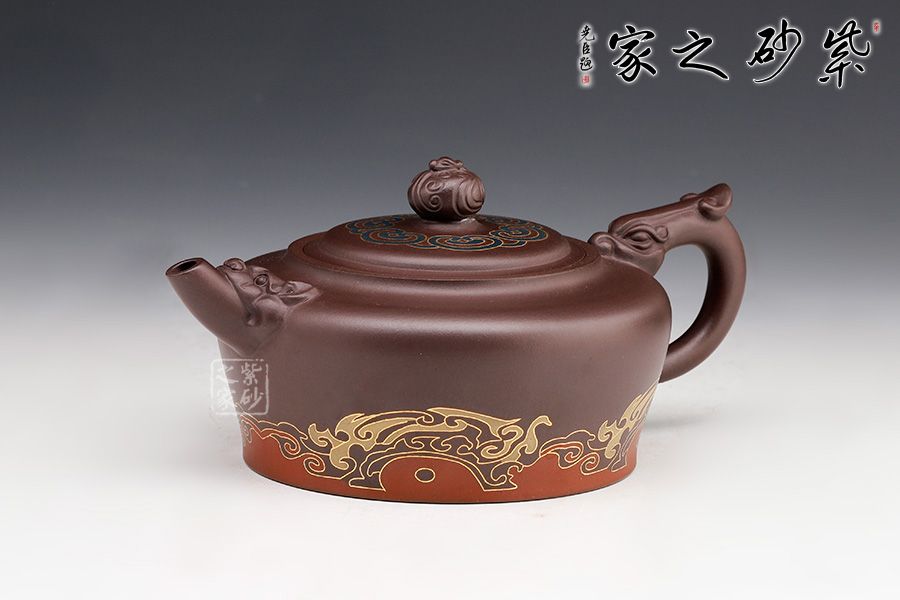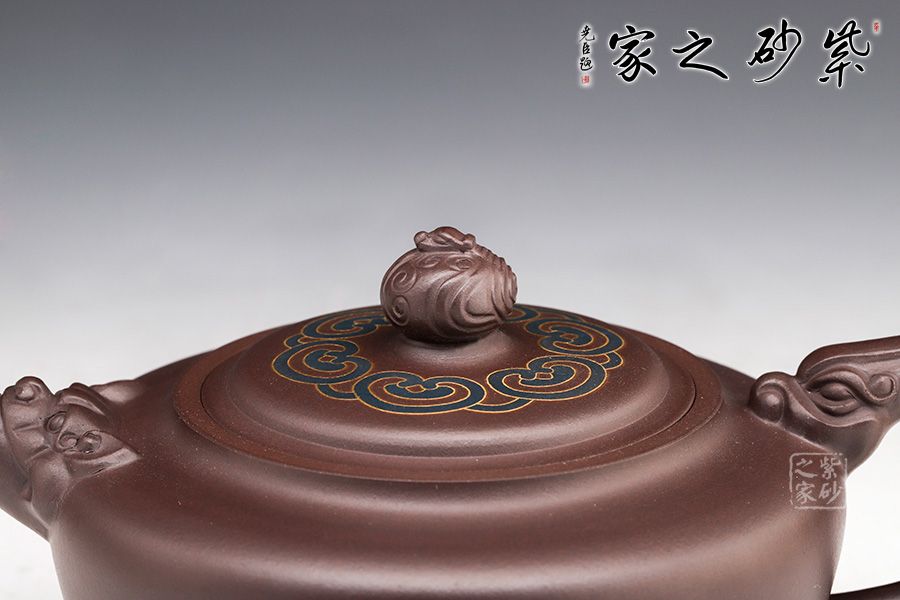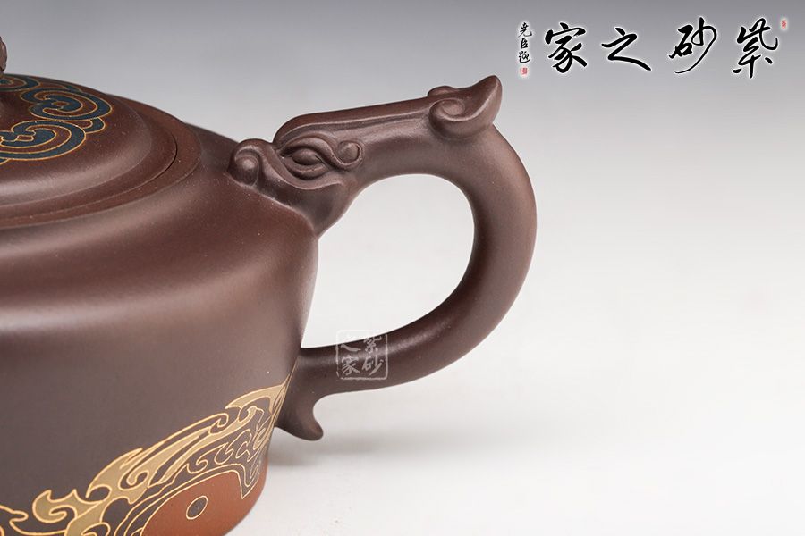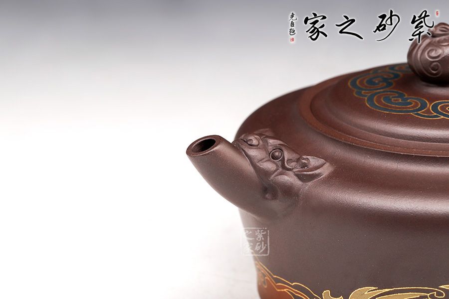 此壺砂質(zhì)細(xì)膩溫潤,設(shè)計(jì)巧思,寓意吉祥,造型華美大方,形制豐滿。壺鈕雕塑云紋圖案,神韻靈動,極具生氣,極富藝術(shù)表現(xiàn)力。鑲金的工藝更具富貴華麗的感覺,美觀實(shí)用。