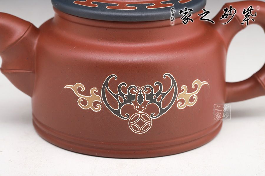 此壺壺身圓柱狀,壺鈕一只蝙蝠代表“福”,肥嘴的設計憨態(tài)可掬,壺身采用鑲銀的工藝做了扁腹的圖案,觀賞性十足。
