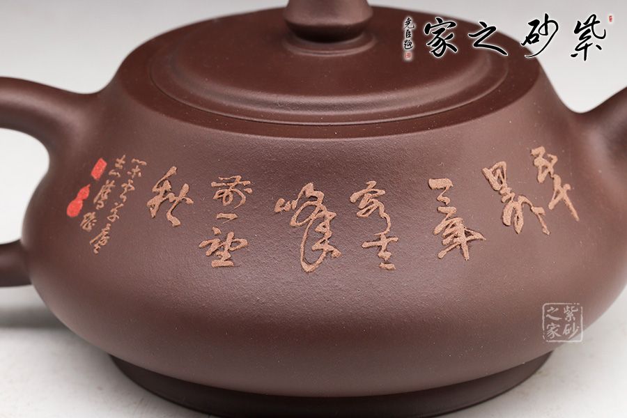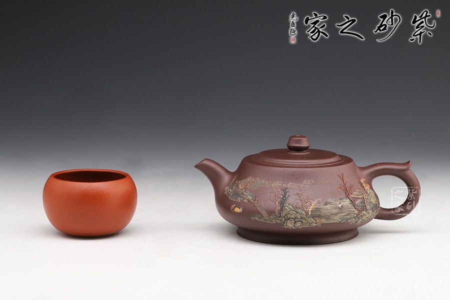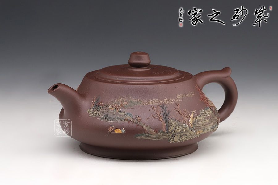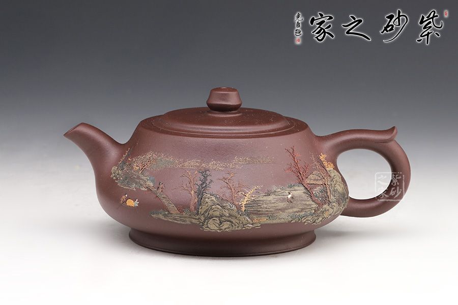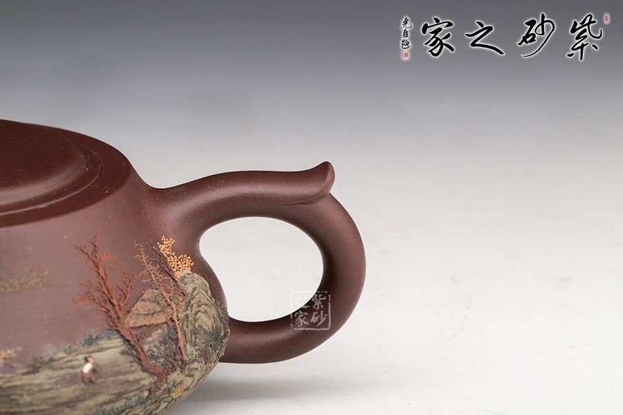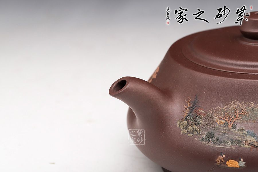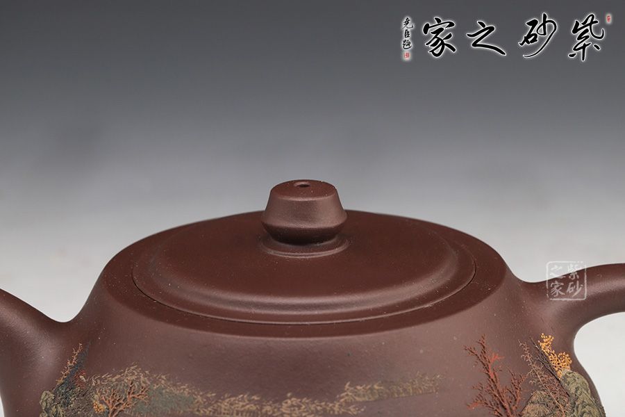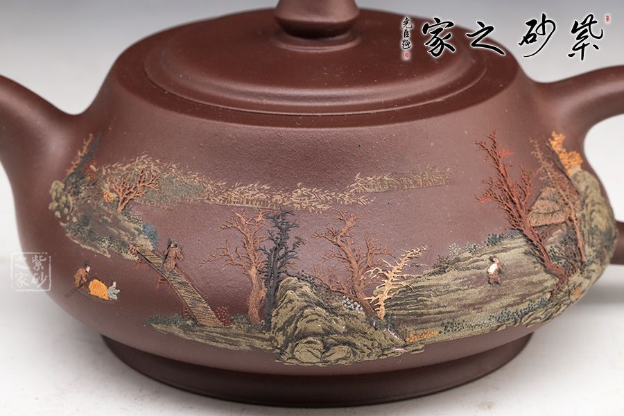 此壺同樣著重于泥繪,圈底端莊穩(wěn)重,壺身飽滿圓潤(rùn),壺身上的樹(shù)木立體感十足,風(fēng)景美如畫(huà)。鈕的設(shè)計(jì)拿捏順手,嵌蓋嚴(yán)絲合縫銜接自然,值得收藏。