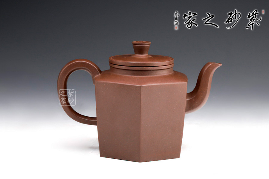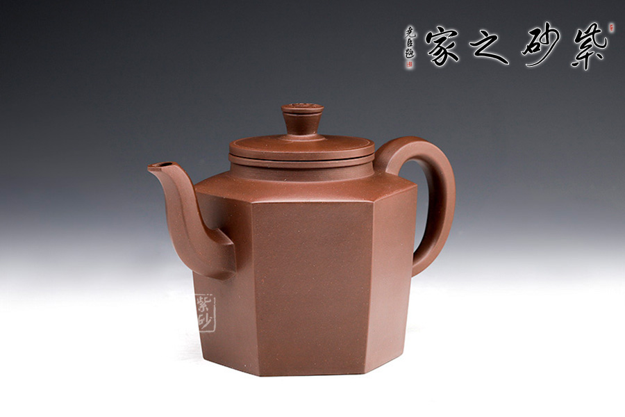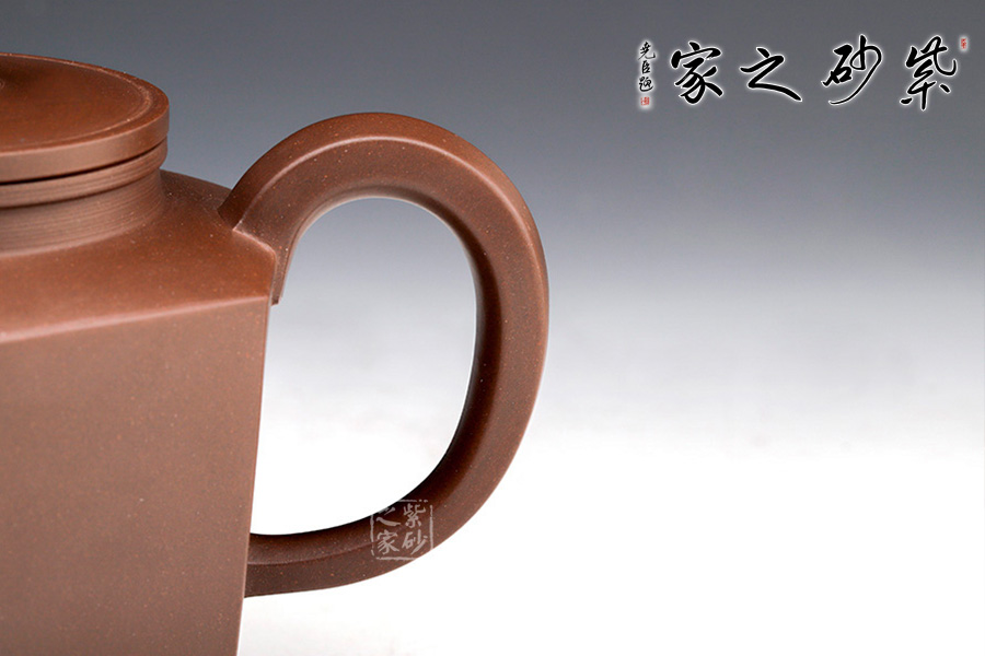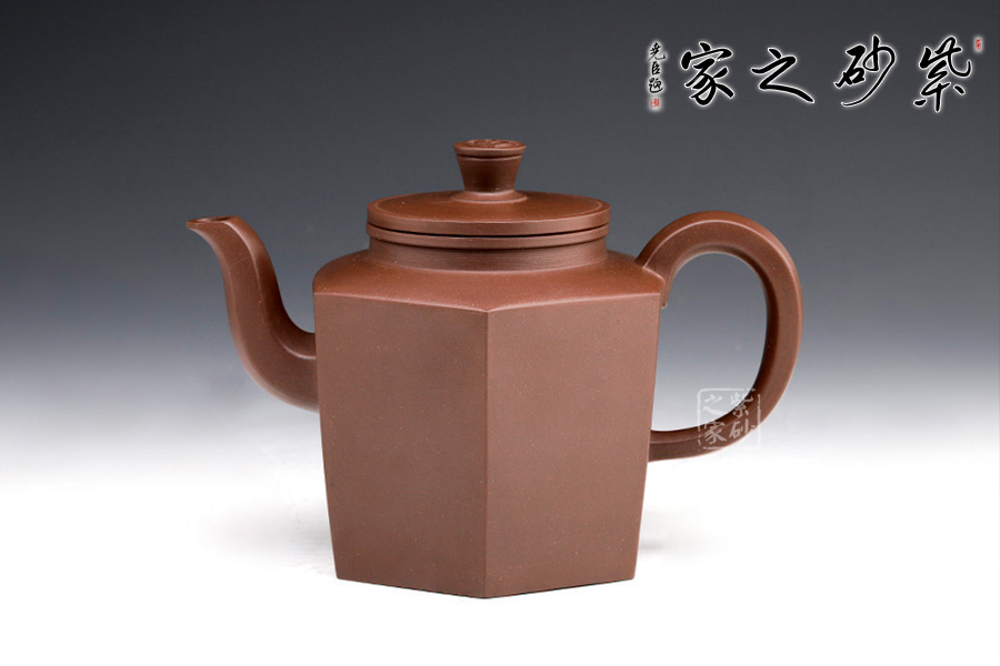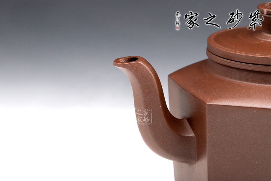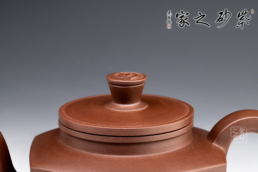 此壺以揚州出土的大彬六方壺式為藍本,在傳統(tǒng)壺式上的微創(chuàng)新之作。壺體六方,高身筒,壺肩微隆富有張力,較高的圓壺頸微微凸起的壺口線條與圓壺蓋以字母線密合。平蓋上壺紐略呈錐形,便于提拿。耳形壺鋬,三彎流,鋬流圓中有棱線與壺體呈呼應(yīng)之態(tài)。壺泥色純正,壺體干凈自然,尤顯紫砂材質(zhì)美。