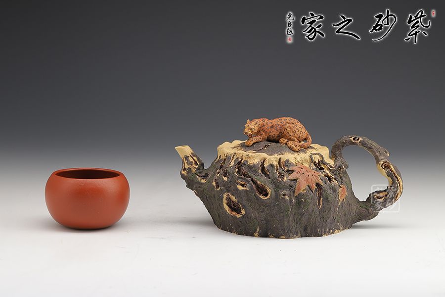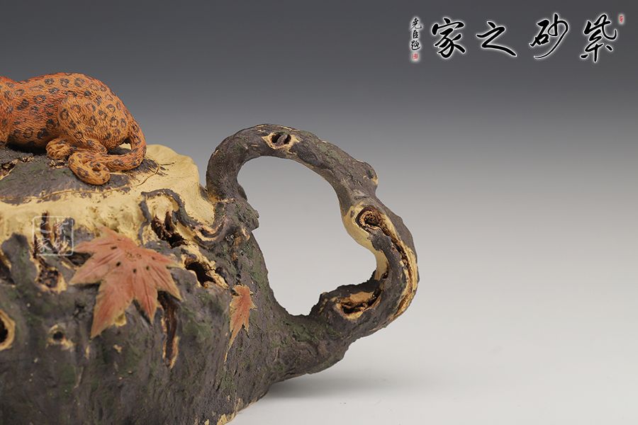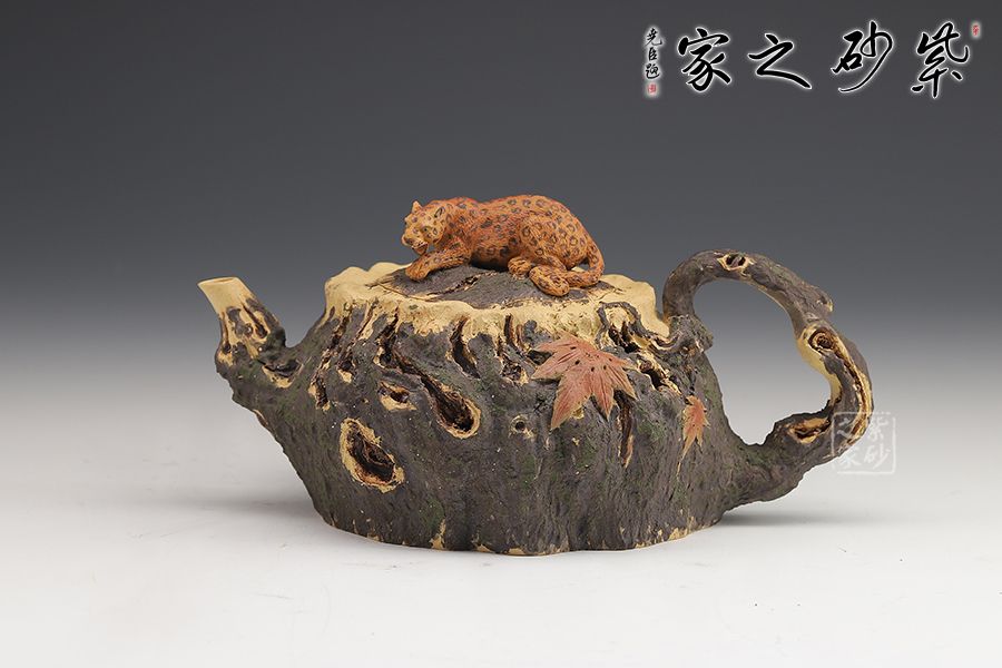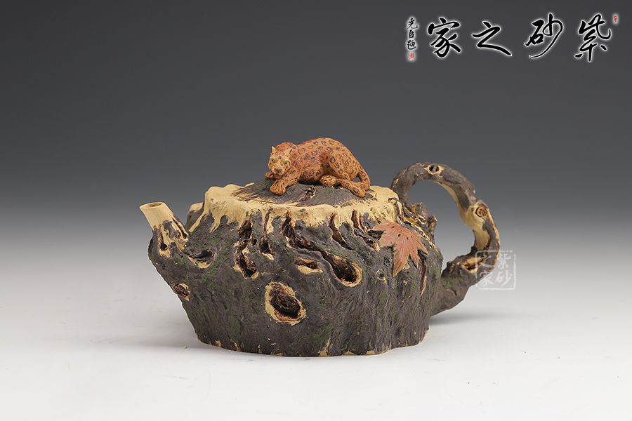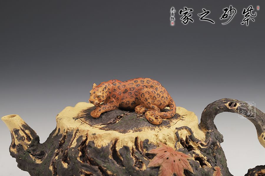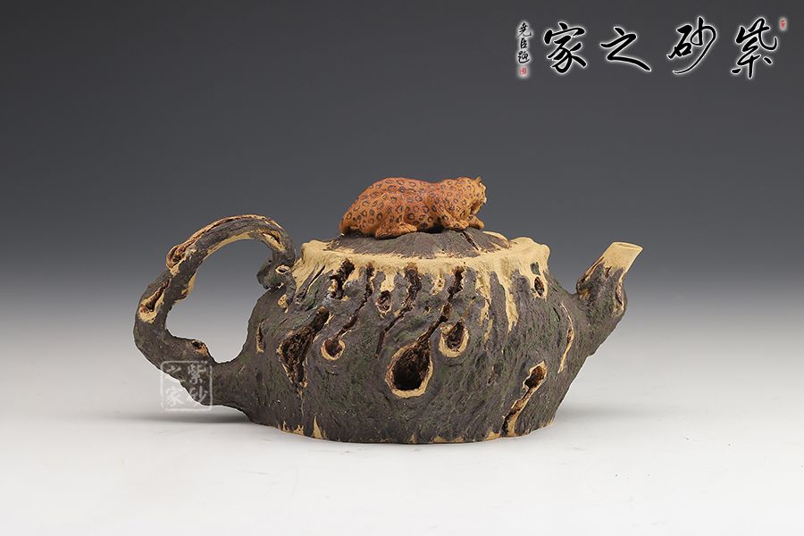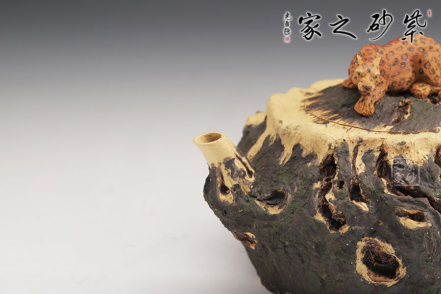 此款紫砂壺是經(jīng)典的仿生器,壺身似枯木,淋漓盡致的體現(xiàn)自然生成斑駁蒼勁的歲月感,設(shè)計(jì)巧妙、制作精良。嵌蓋設(shè)計(jì),與壺身融為一體。壺鈕十分特別,一只小花豹臥于壺蓋上,契合壺名知恩圖報(bào)的美好寓意。