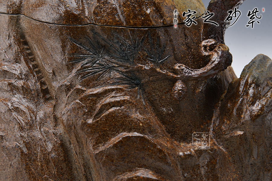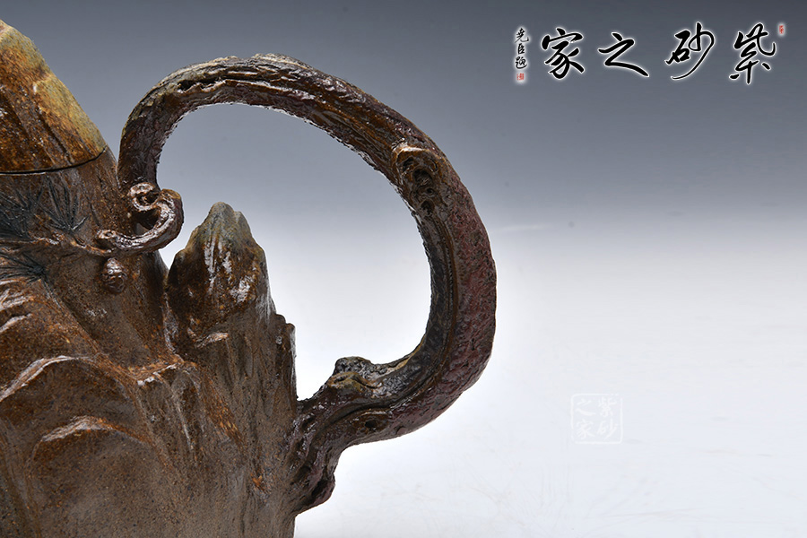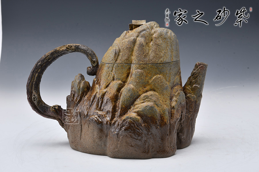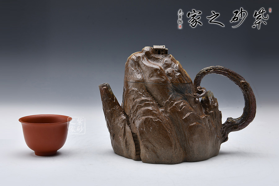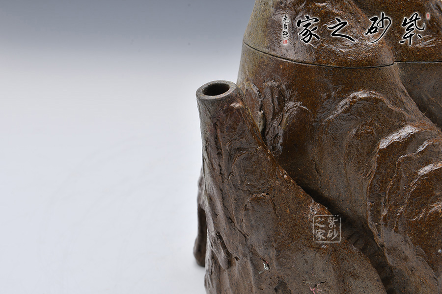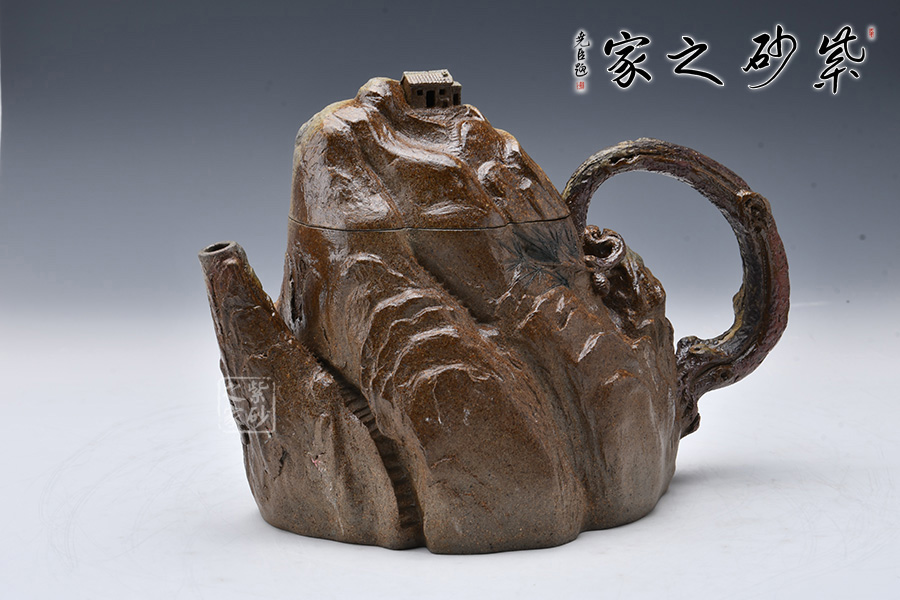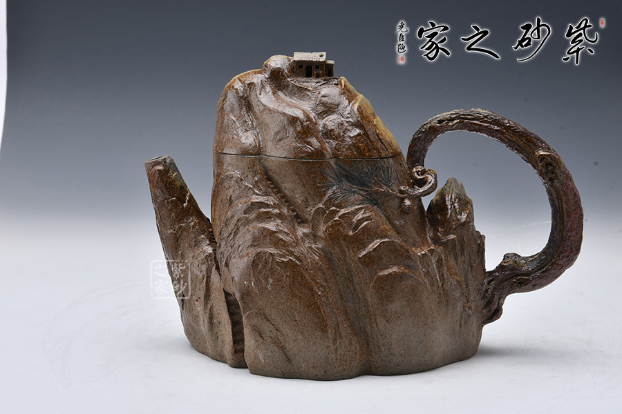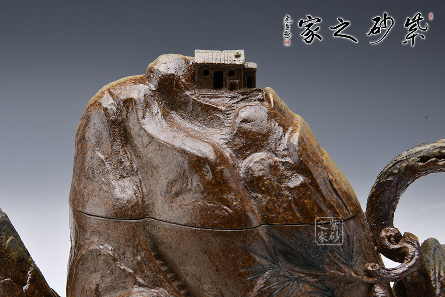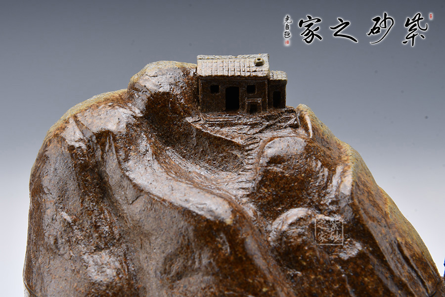 此壺采用青灰段泥制制成,眼觀酷似一座大山,山頂小屋給人一種世外桃源的深林感受,意境滿滿。