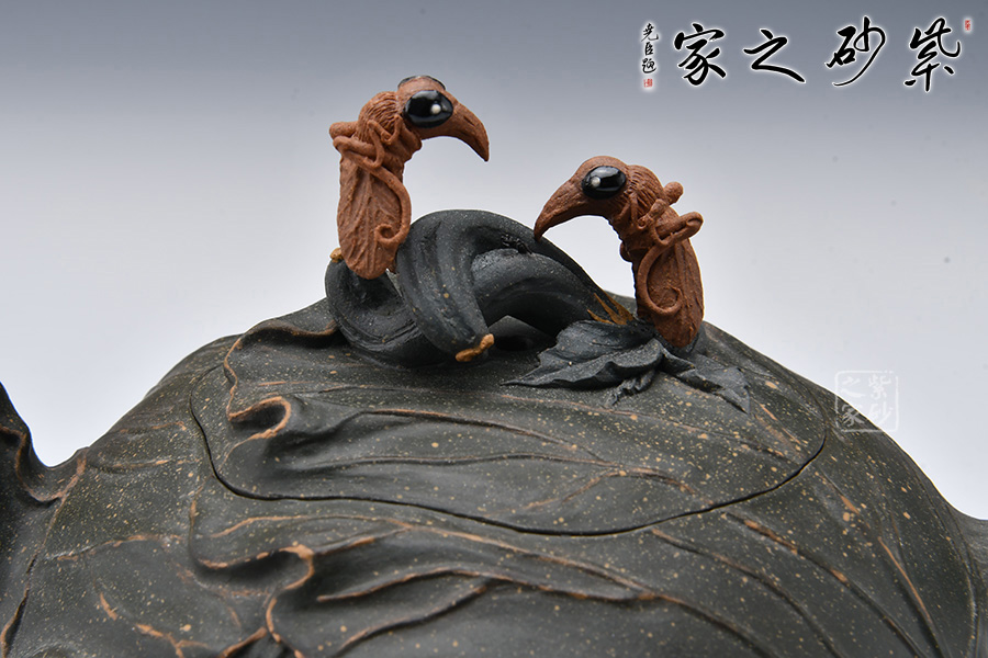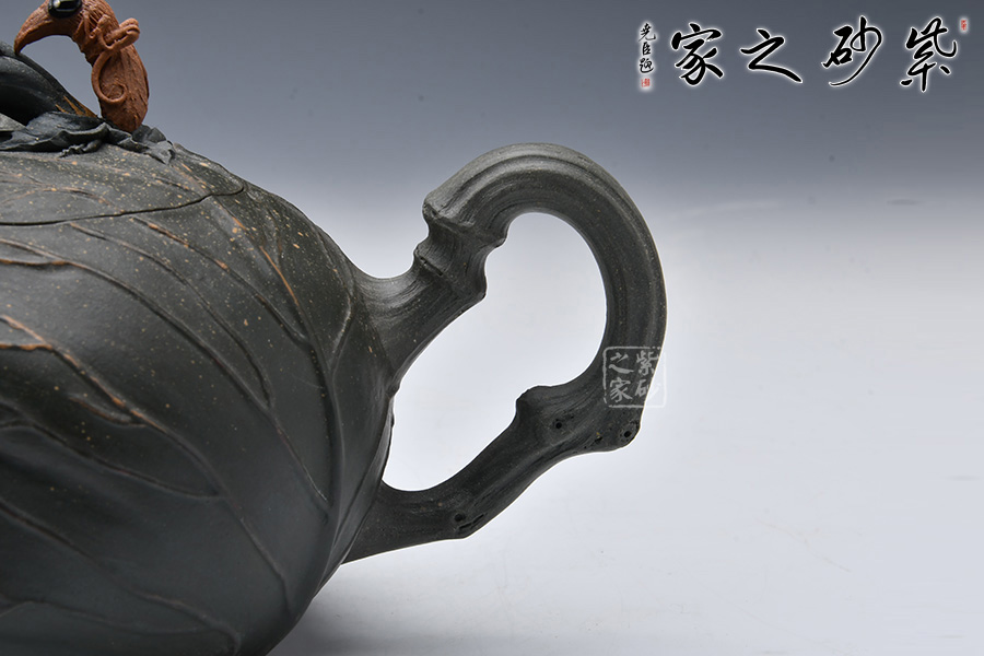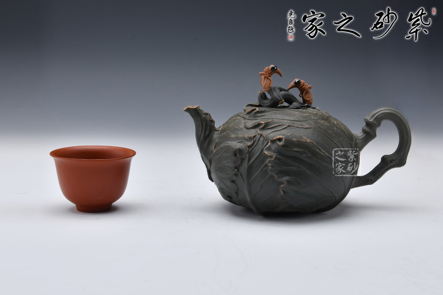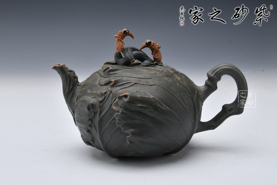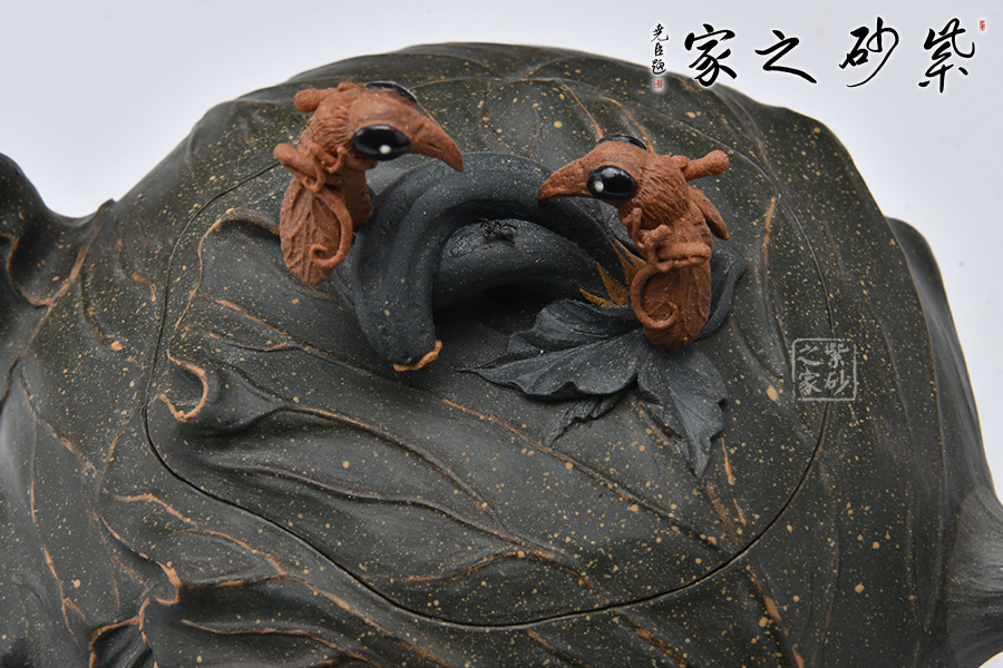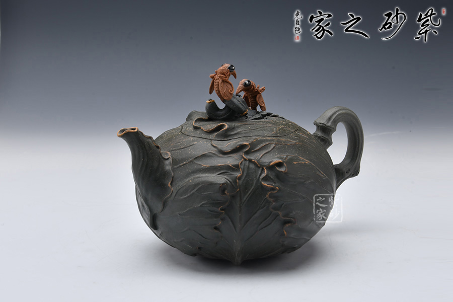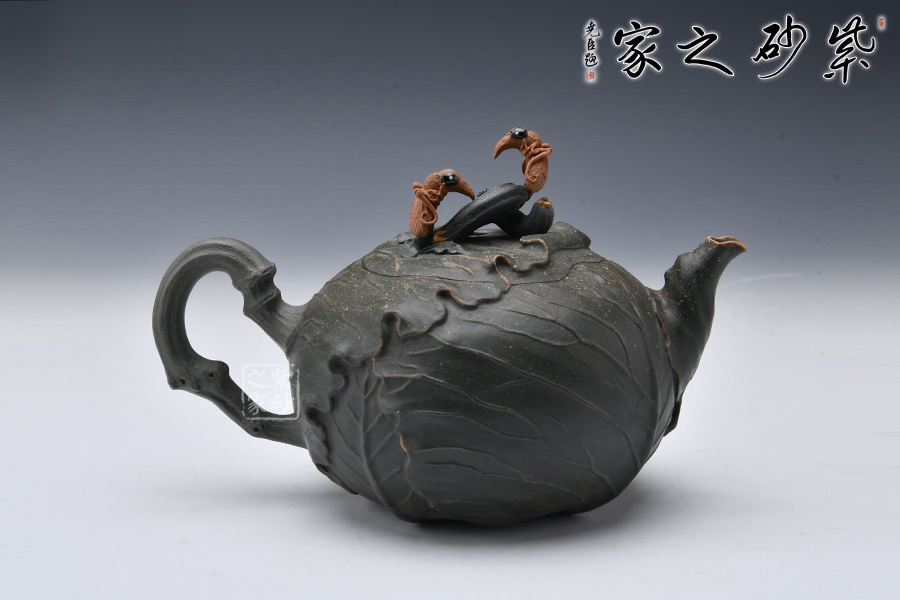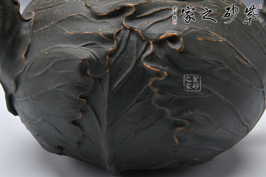 整壺如一顆圓潤(rùn)的白菜,采用泥料色澤十分合適,壺鈕為兩只勤勞的蜜蜂,寓意奉獻(xiàn)與豐收,藤為把,卷曲的菜葉為二彎流,構(gòu)思精巧,令人嘖嘖稱奇。