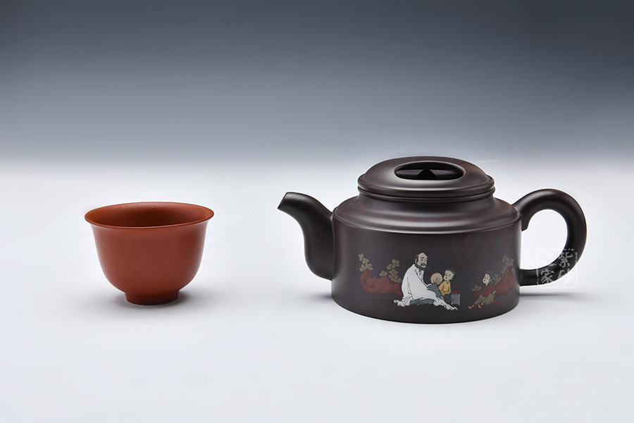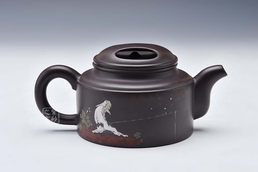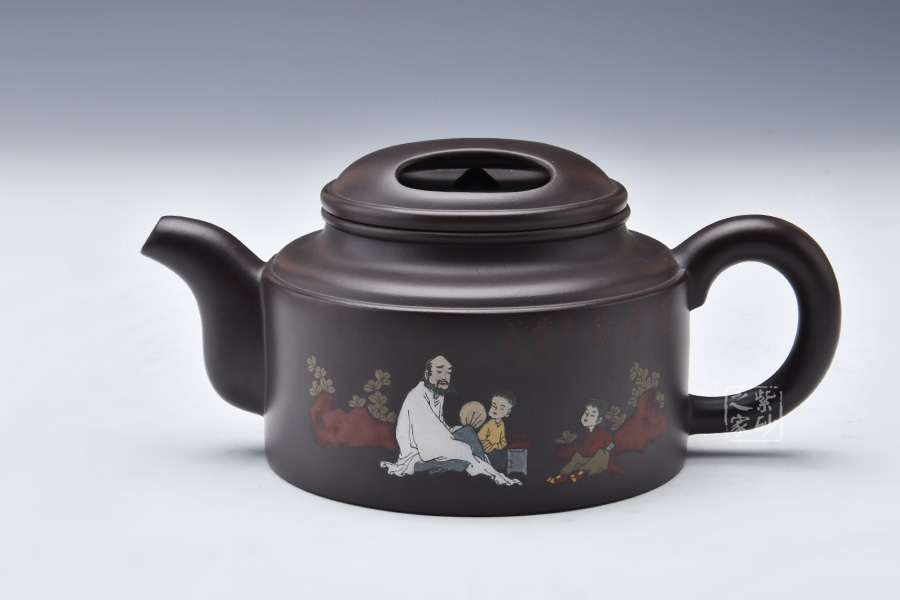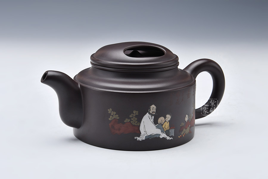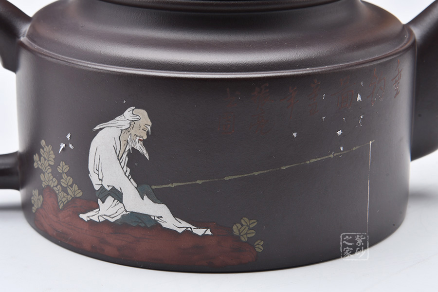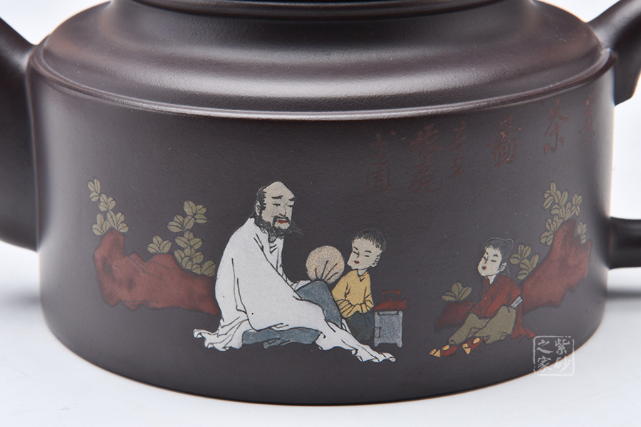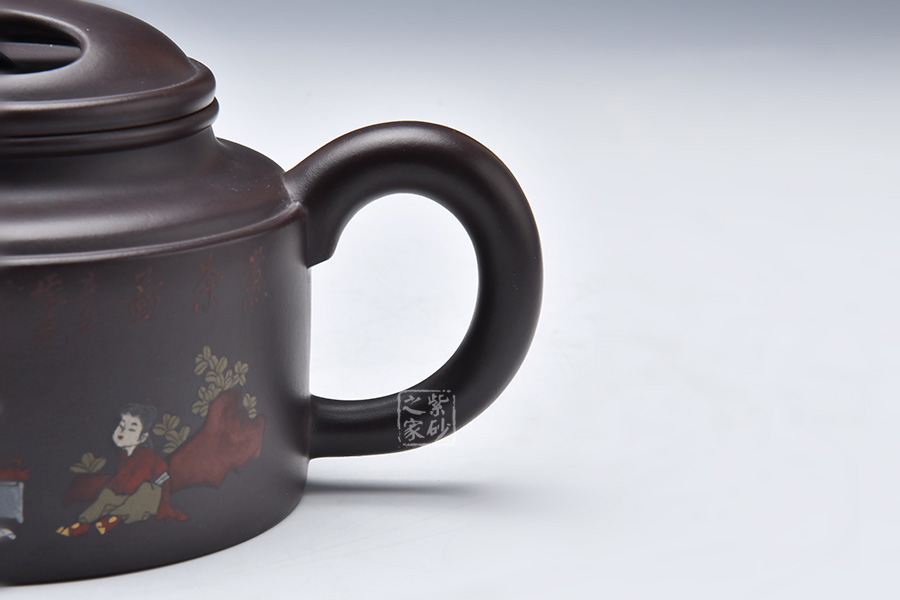 這款大洋桶壺跳出了以往牛蓋蓮子給人以笨重、樸拙的感覺,而是在細(xì)節(jié)處利用線面的銜接以及壺體各部分銜接來追求一種細(xì)致的感覺。但是同時老師又采用沉郁柔和的光色以及犴門式壺嘴、柱形壺身來追求大氣的效果,所以壺體雖小,氣韻不減。泥繪的人物非常逼真,色彩運用尤其鮮明,展現(xiàn)出的情調(diào)十分悠閑。