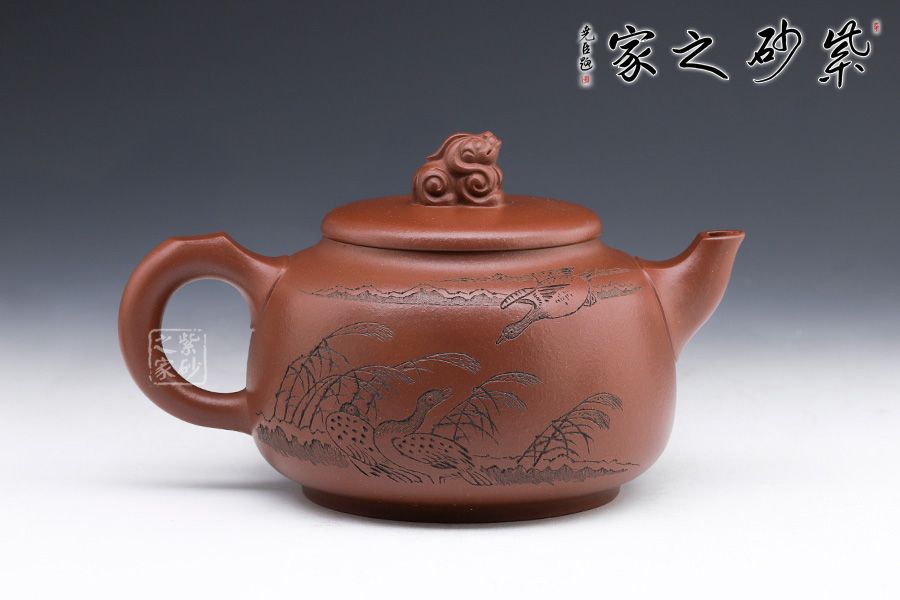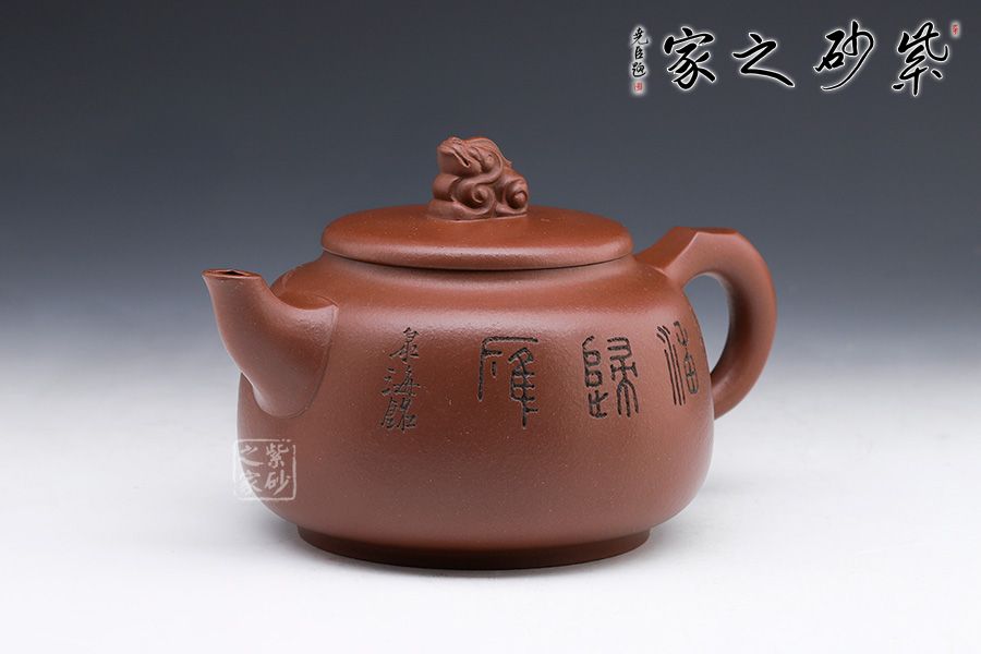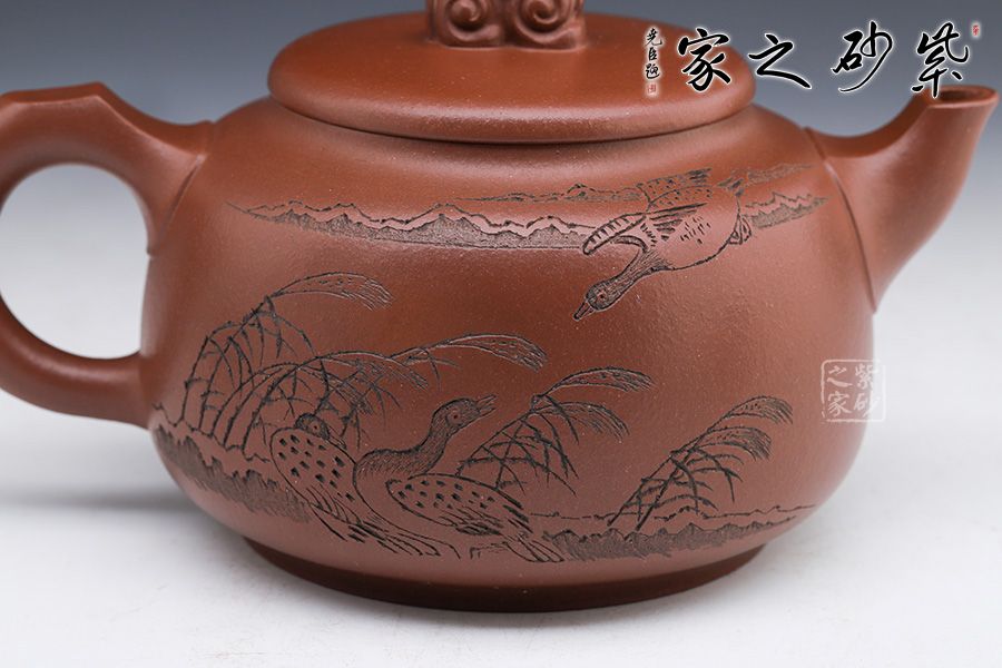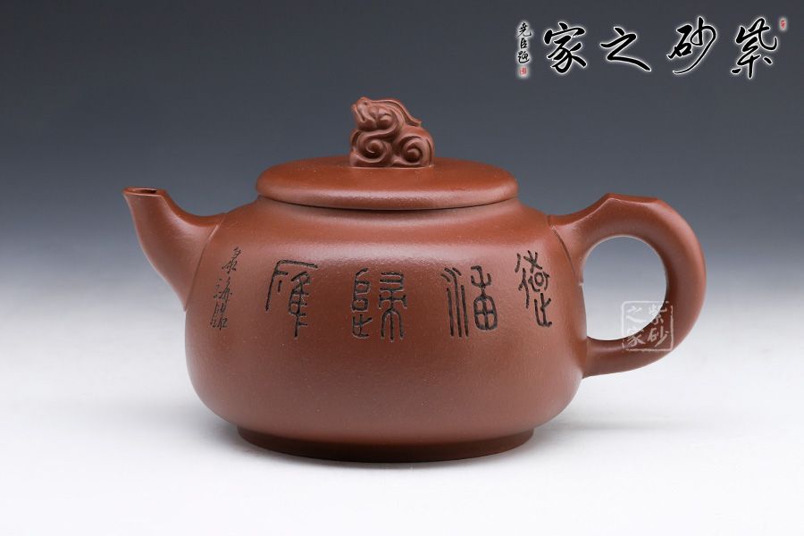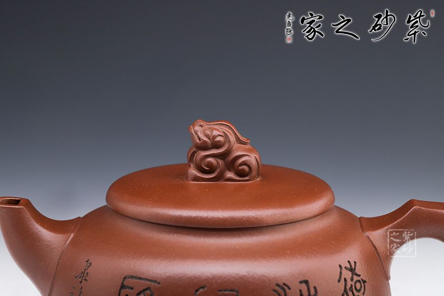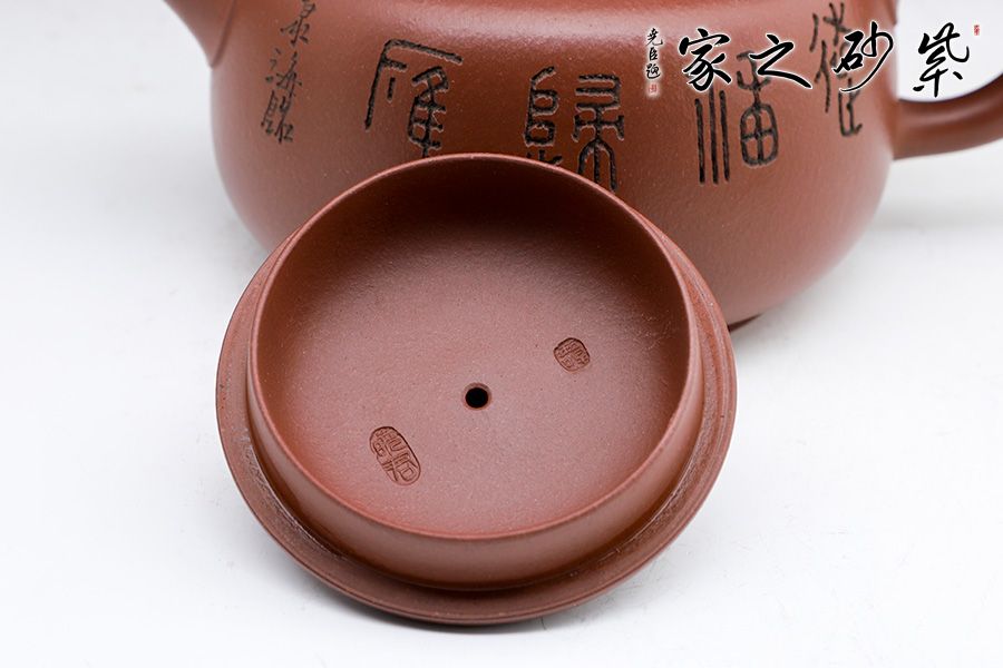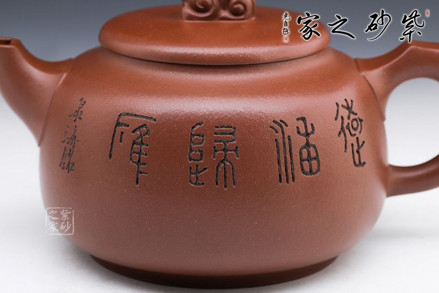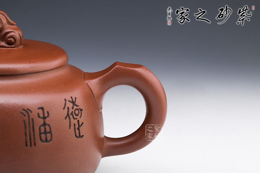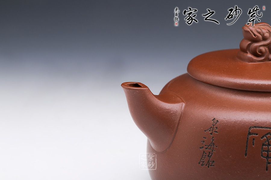 此壺壺身方圓結(jié)合,端莊形態(tài)里有圓潤美感。圓底圈足,氣質(zhì)不俗。壺蓋平滑洗練,瑞獸壺鈕小巧精致,栩栩如生。壺嘴和壺把明接,壺嘴粗細過渡落差劇烈,有方有圓,力道中有柔美。壺把圓滑細膩,刀切的平面工整異常,盡顯利落,古樸形態(tài)和精致裝飾交相輝映。