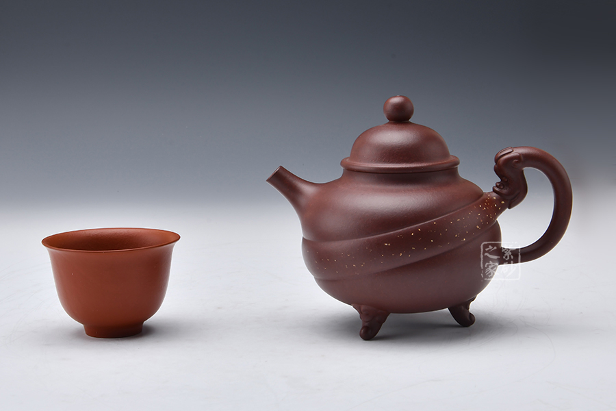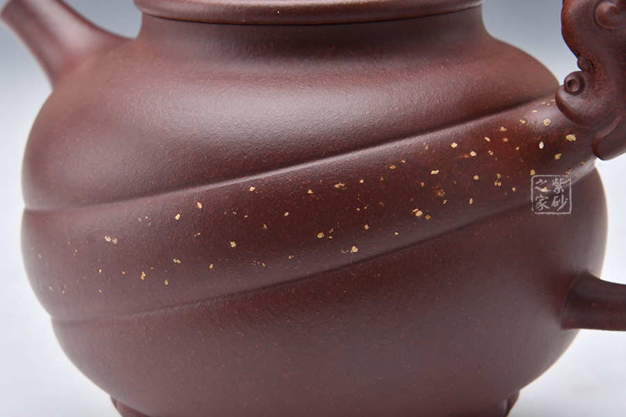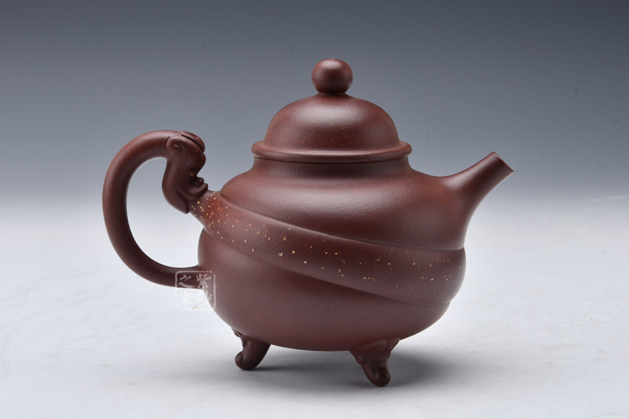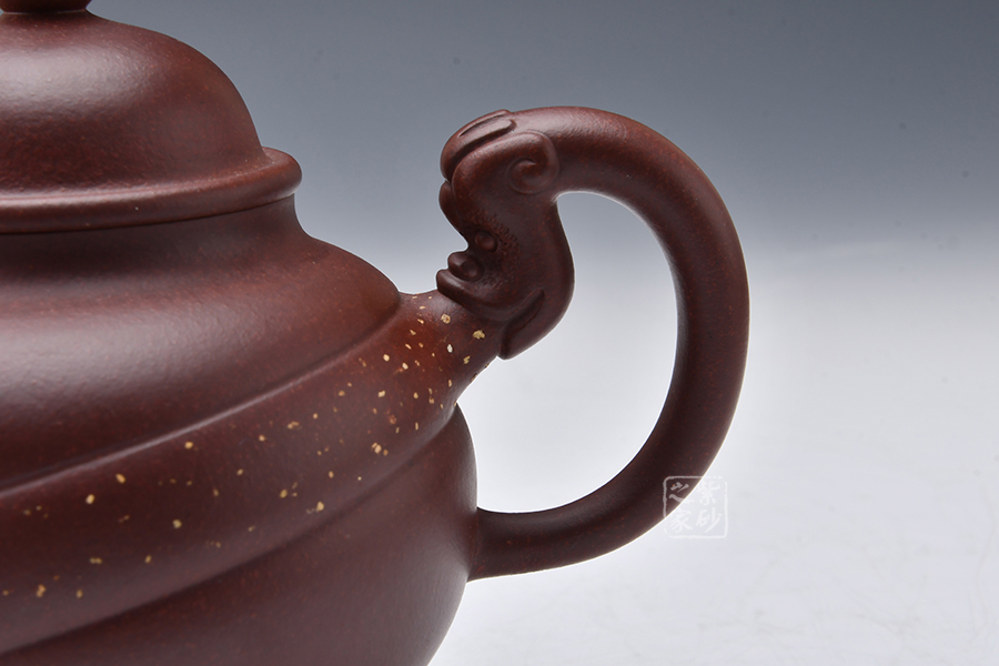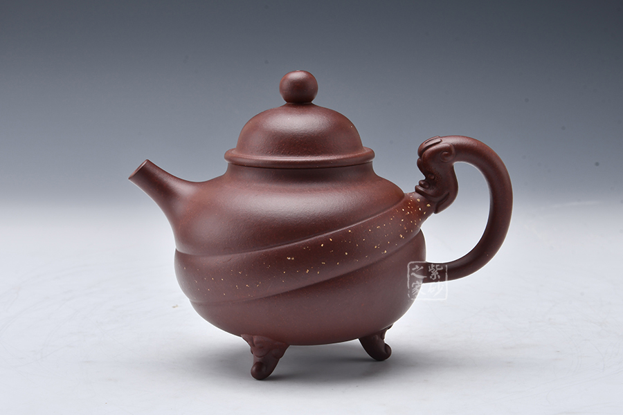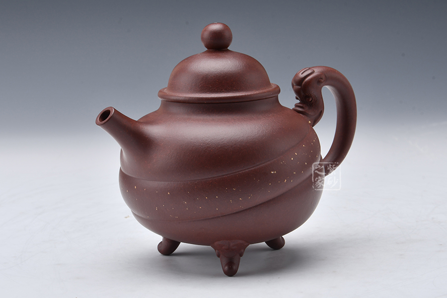 此壺采用優(yōu)質(zhì)原礦拼紫泥料,造型挺拔有力,采用三足式,支撐穩(wěn)重,壺嘴向前,出水更為爽利,龍形壺把吐水造型,從龍嘴里噴出的水柱叫做“龍涎”,據(jù)說(shuō)龍涎沖身,大富大貴,龍吐水寓意吉祥 ,水代表財(cái)運(yùn)源源不斷,壺身采用鋪砂裝飾和壺把遙相輝映,整體大氣沉穩(wěn),賞玩收藏都是不錯(cuò)的選擇。