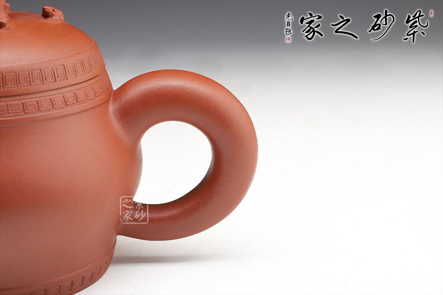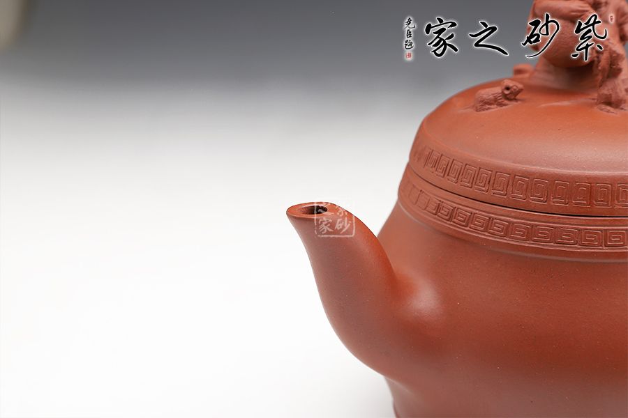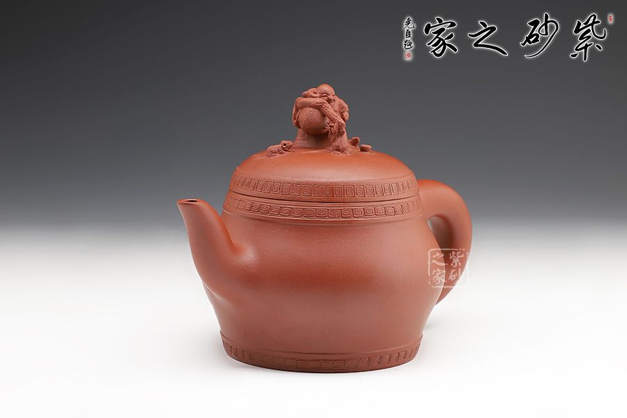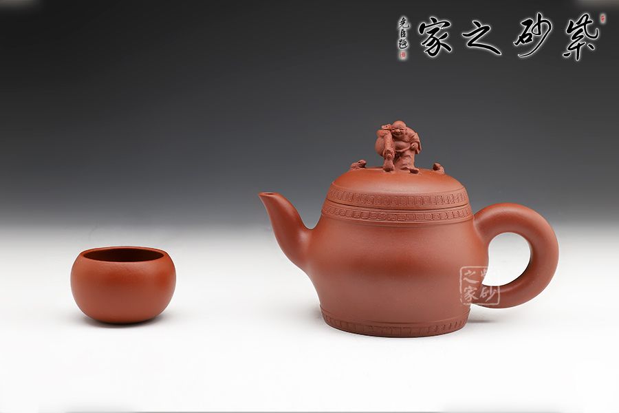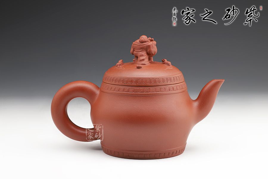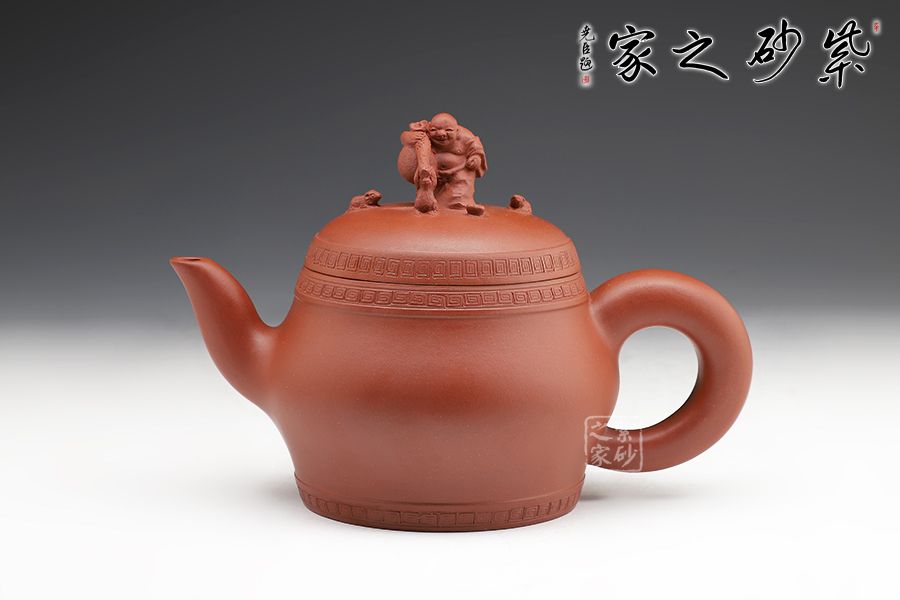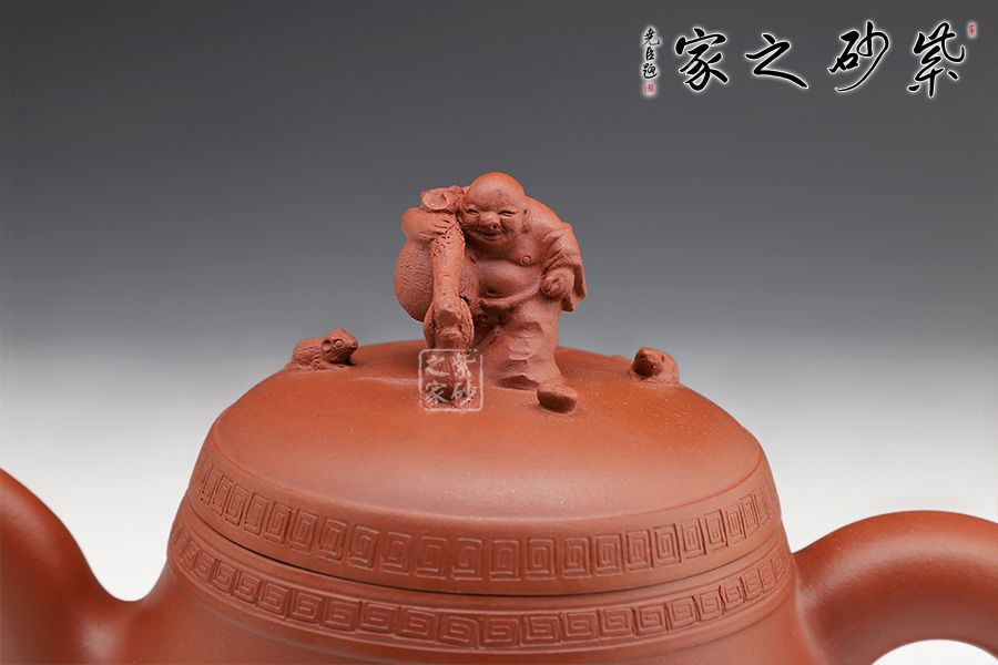 此壺精工細(xì)作,壺身飽滿,壺鈕塑身背黃金袋的布袋佛立于壺蓋之上,寓意著代代有福,多子多福,招財(cái)納福。
