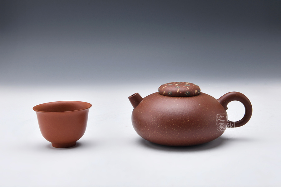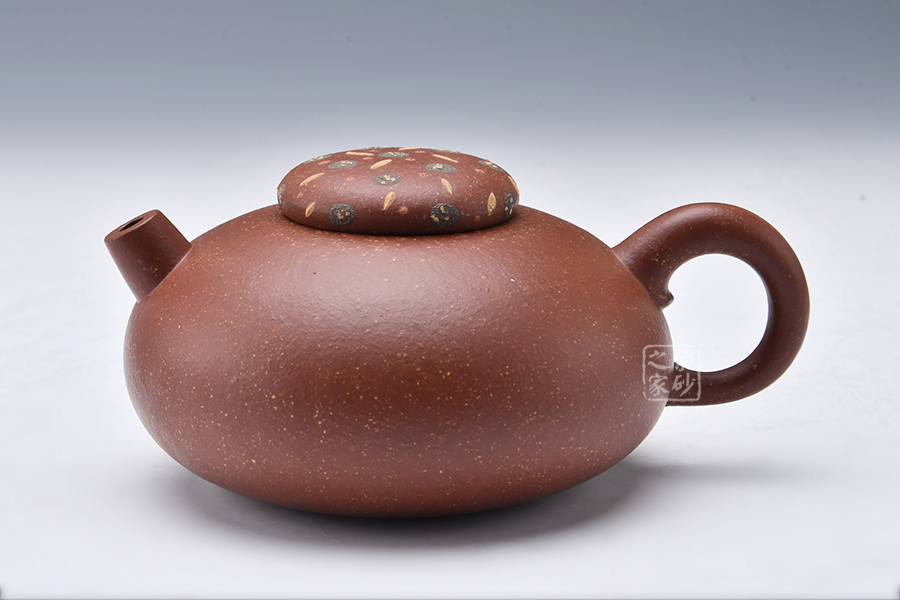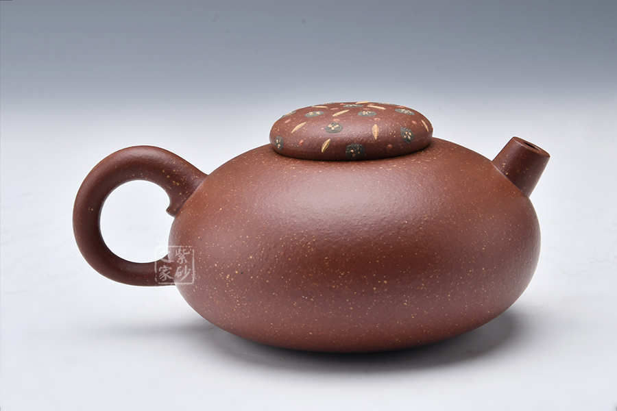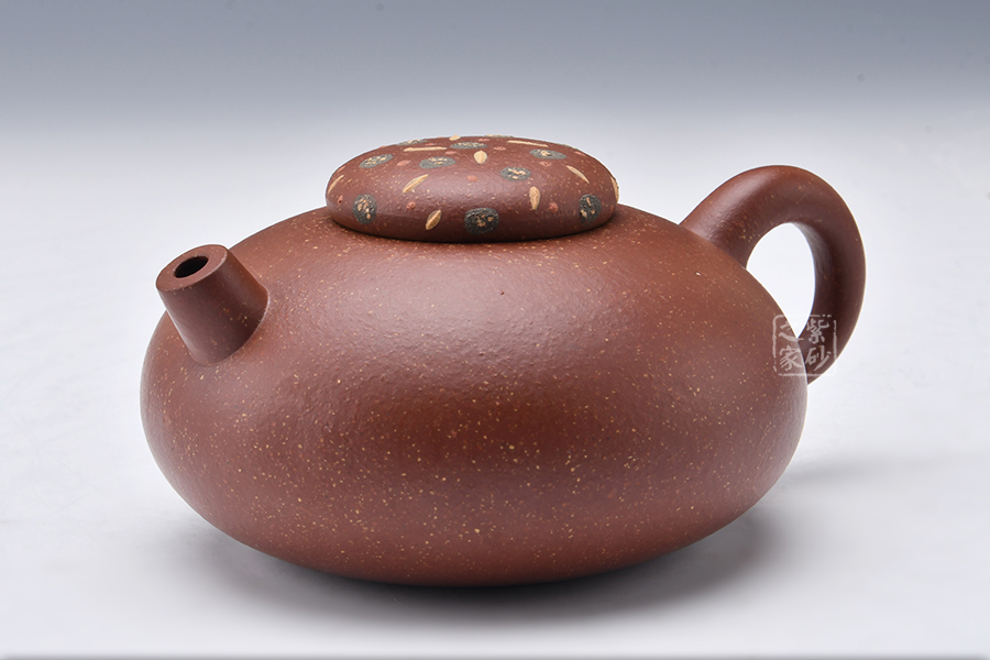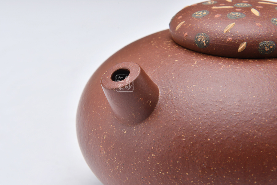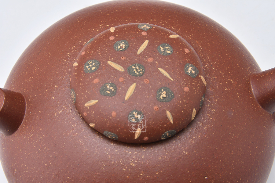 泥性:原礦因含緞泥、紅泥、紫泥等諸多共生礦,陶之后,于深沉之“橙紅色”底上,滿佈五彩斑斕的粗細、深淺之紅、黃星斑點。