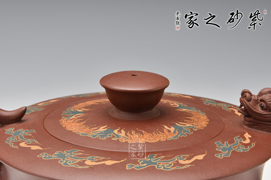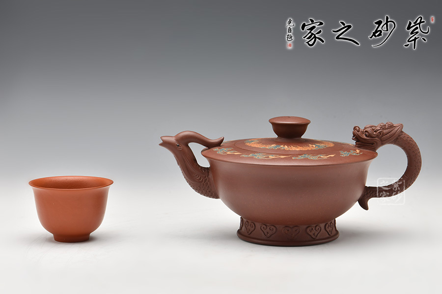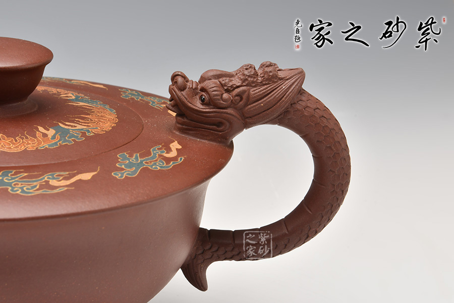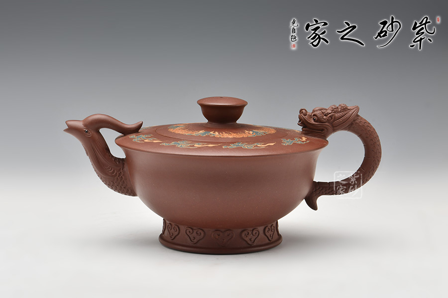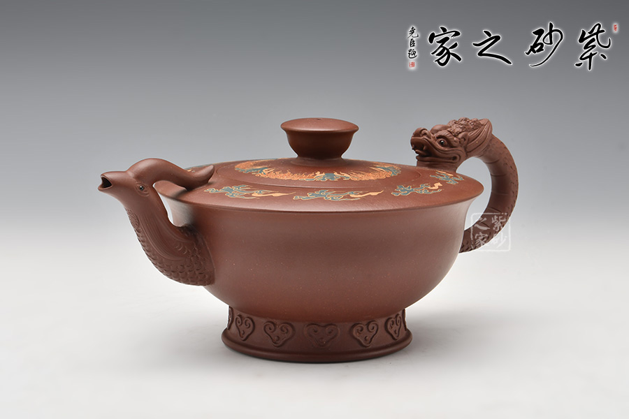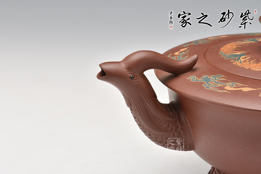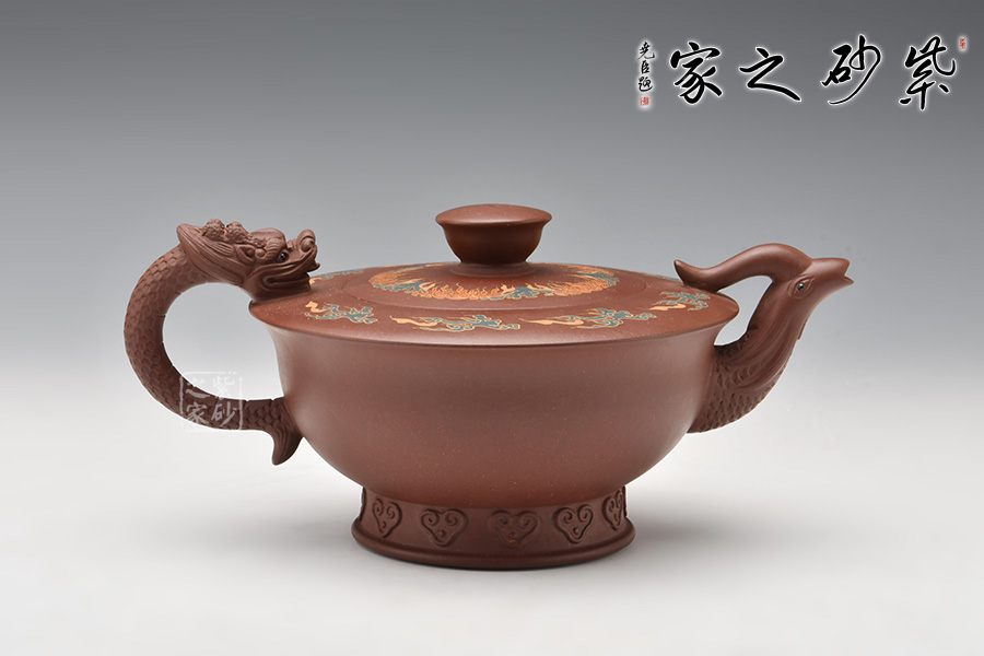在中國傳統(tǒng)觀念中,龍和鳳代表著吉祥如意,龍鳳一起使用多表示喜慶之事,出自《孔叢子·記問》。周軍明老師的這把龍鳳呈祥壺,壺身為碗狀,上豐下斂,弧線過渡,底部圈足,肩部平滑,外形工整細膩,光澤迷人。壺嘴為鳳,壺把為龍,古意十足,線條流暢雅致,經(jīng)久耐看。