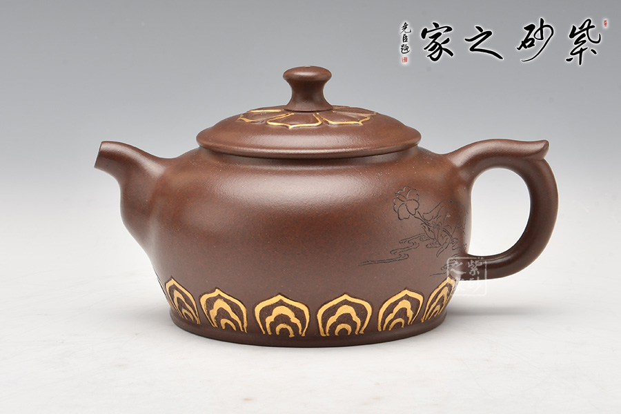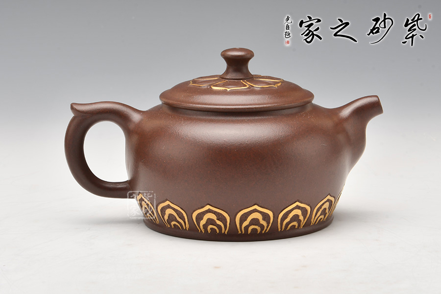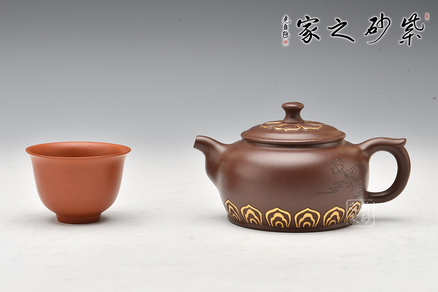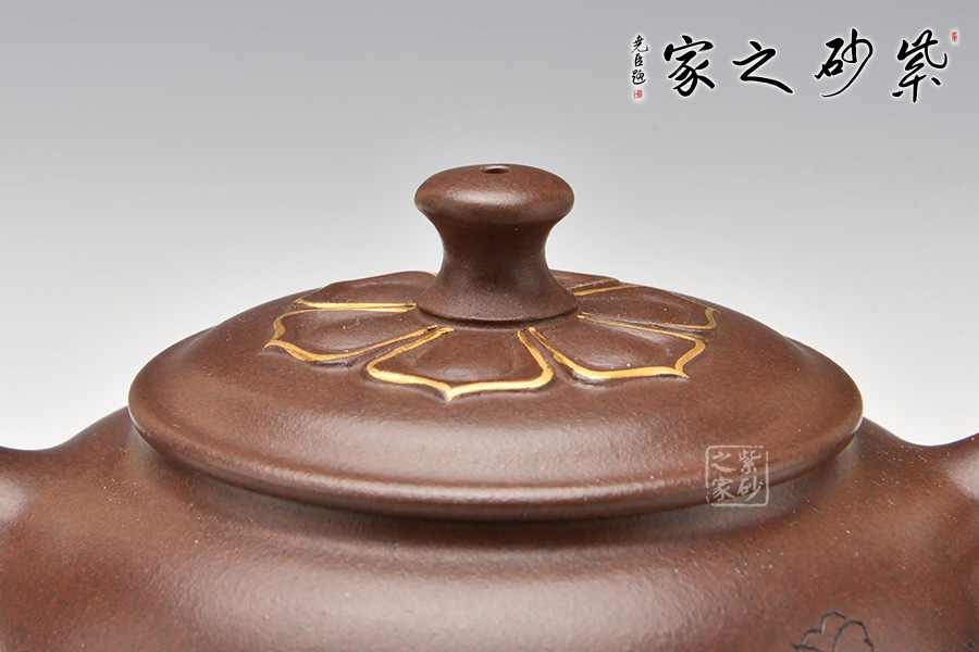 此款以蓮花為主題,壺型高潔清雅,做工精致,壺蓋與壺身底部均有蓮花花瓣,描金工藝,制作細(xì)膩,均勻?qū)ΨQ,宛若花苞盛開,線面舒展,芬芳馥郁,精致無雙,刻繪佛手更添禪意。