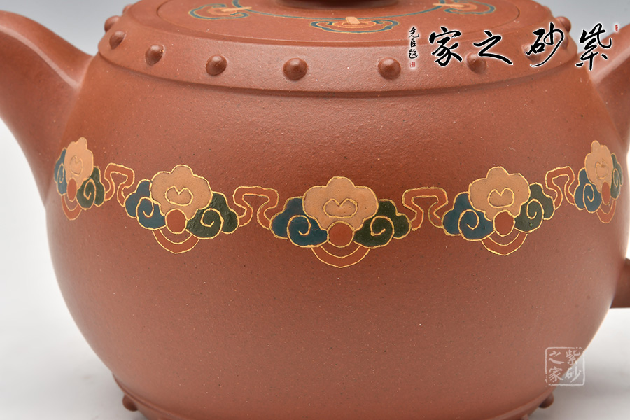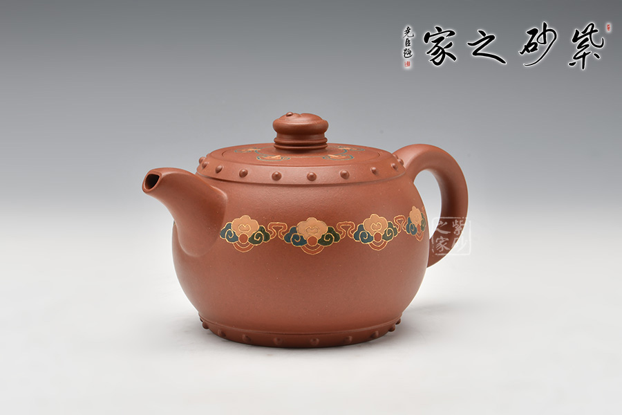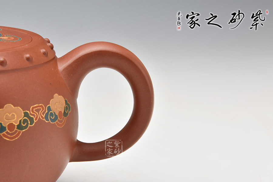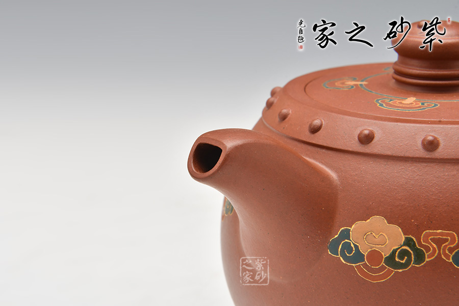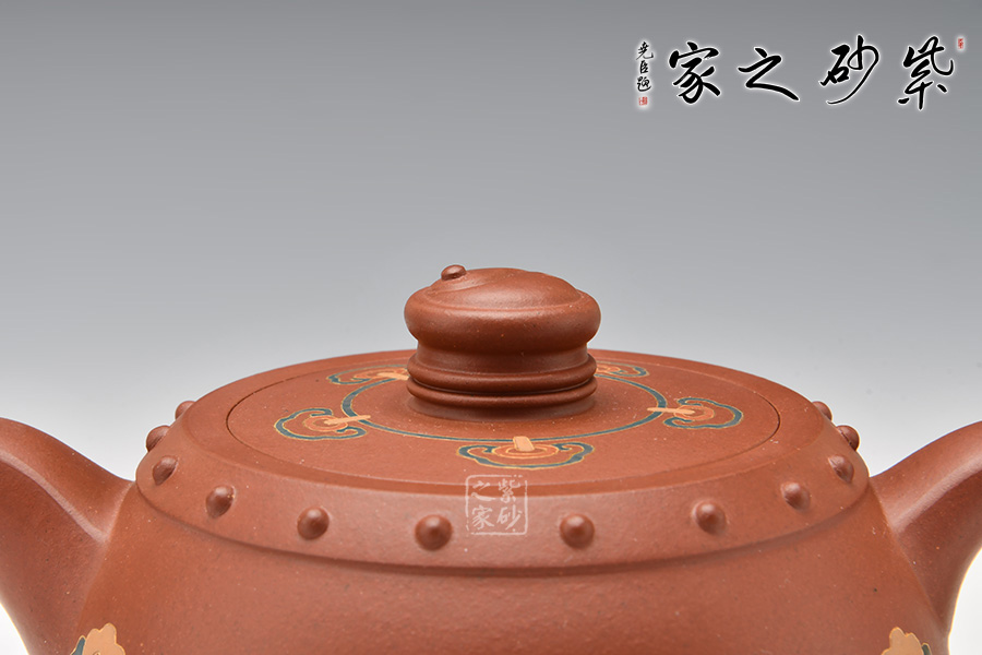 壺型以民間樂器大鼓為身,上下對稱,壺身邊緣起帶狀線,貼錦鼓子作裝飾,假底平整,嵌蓋嚴密、通暢。壺鈕雕刻的陰陽太極圖,形成參透的人生境界,充滿傳統(tǒng)文化的氣息。底部、肩部乳釘紋裝飾與整個造型渾然一體,彰顯深厚古樸的韻味,展現(xiàn)中國傳統(tǒng)文化的非凡氣質(zhì)和獨特內(nèi)涵。