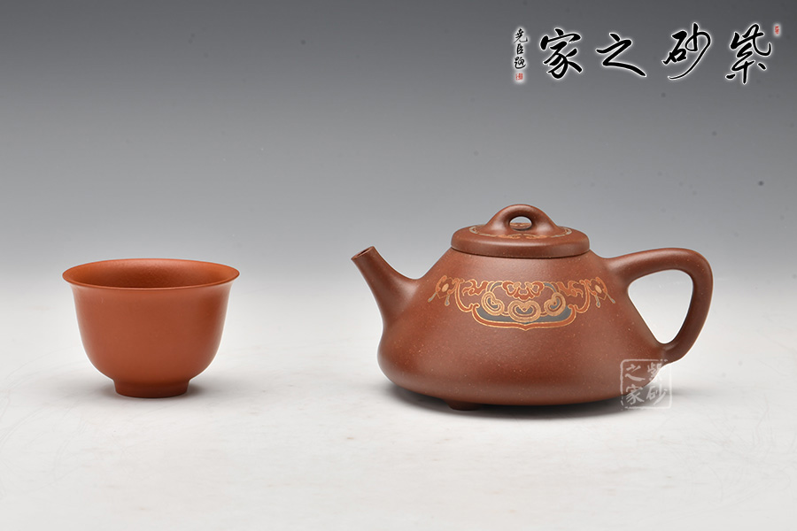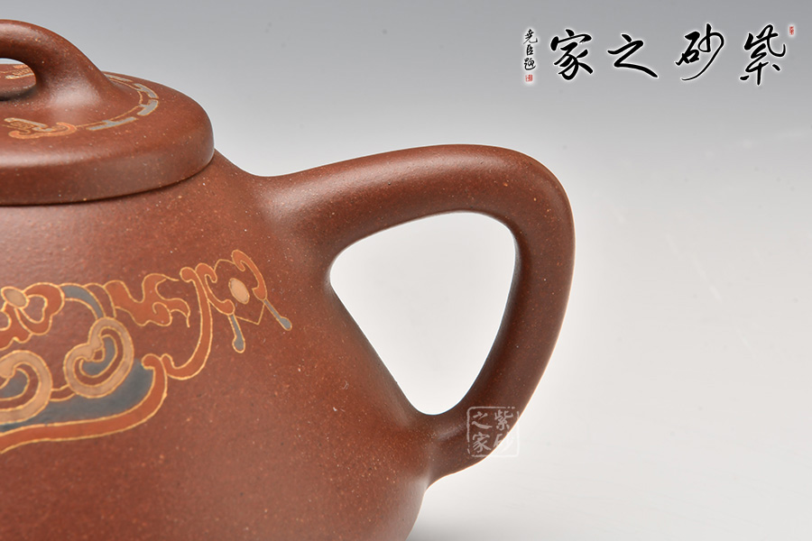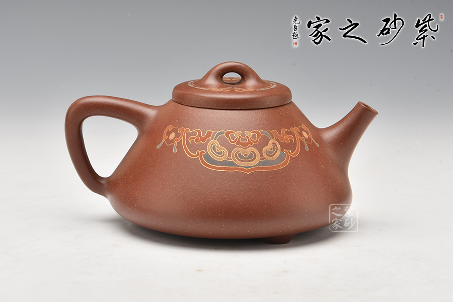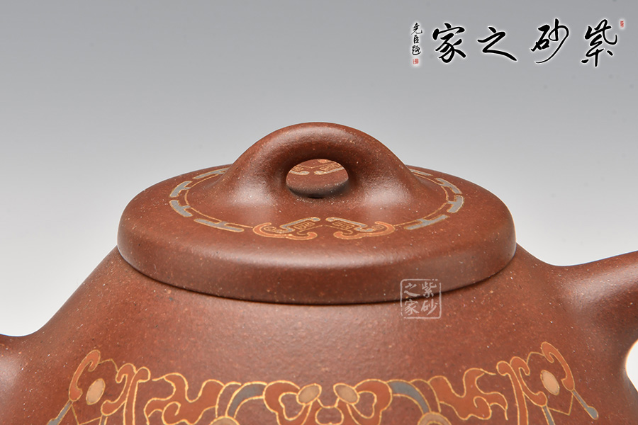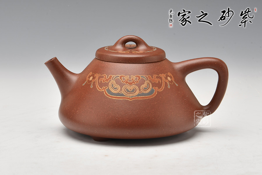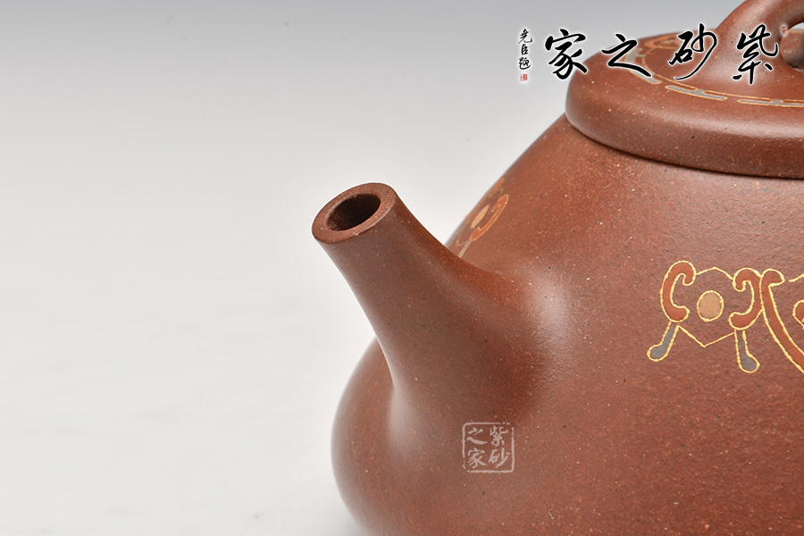 此壺是經典的石瓢壺,壺身嵌入金絲圖案,上斂下豐,壺嘴是直流形,壺鈕為精制的拱橋形,壺蓋為平蓋,壺鈕下方的金絲圖案和壺身搭配的很美好,整個壺器統(tǒng)一協調,線條優(yōu)美,值得去收藏。